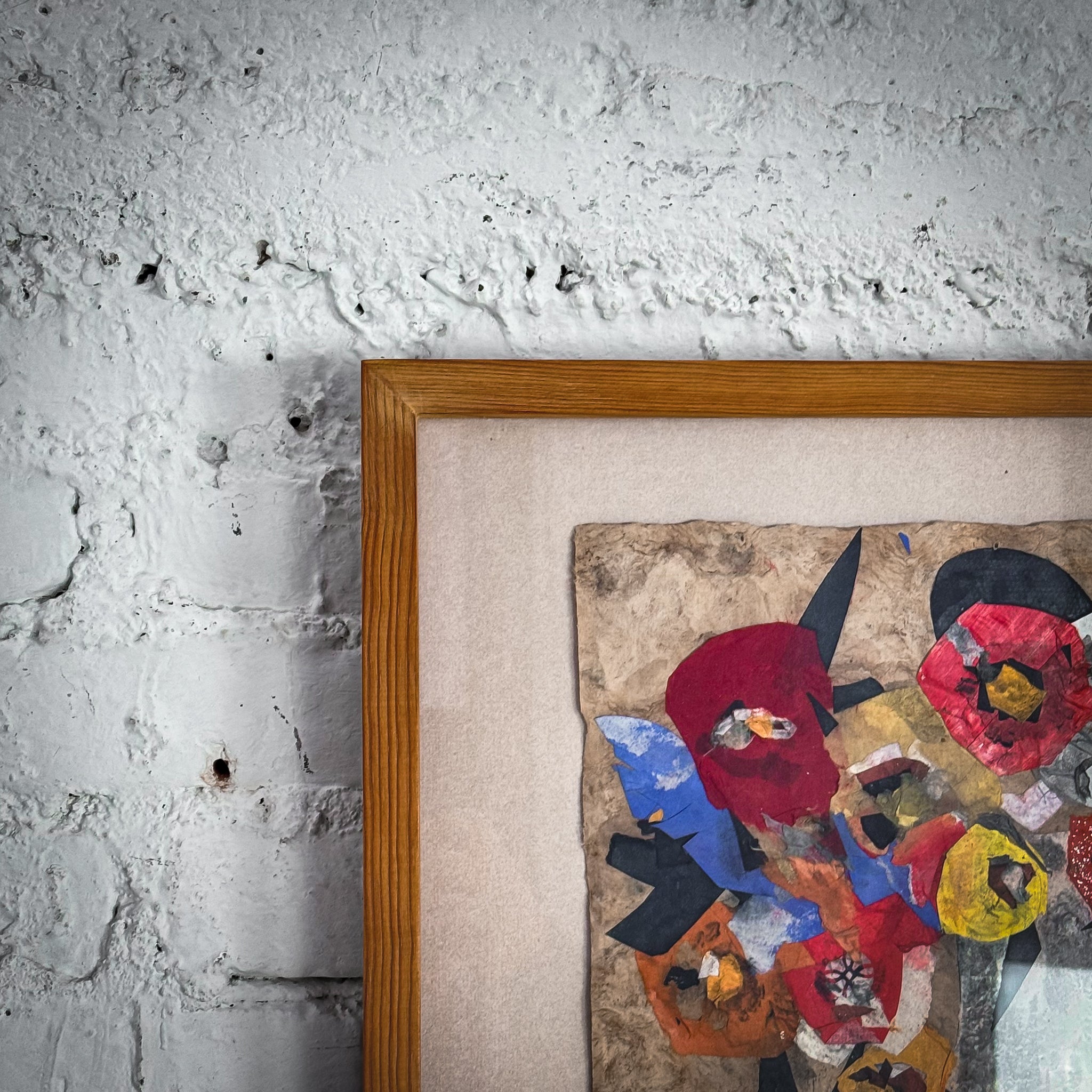 Leonard Brooks (1911-2011), Canadian/Mexican modernist abstract collage, mixed-media on paper. Vibrant floral still life with vase. Simple wooden frame. Good condition.