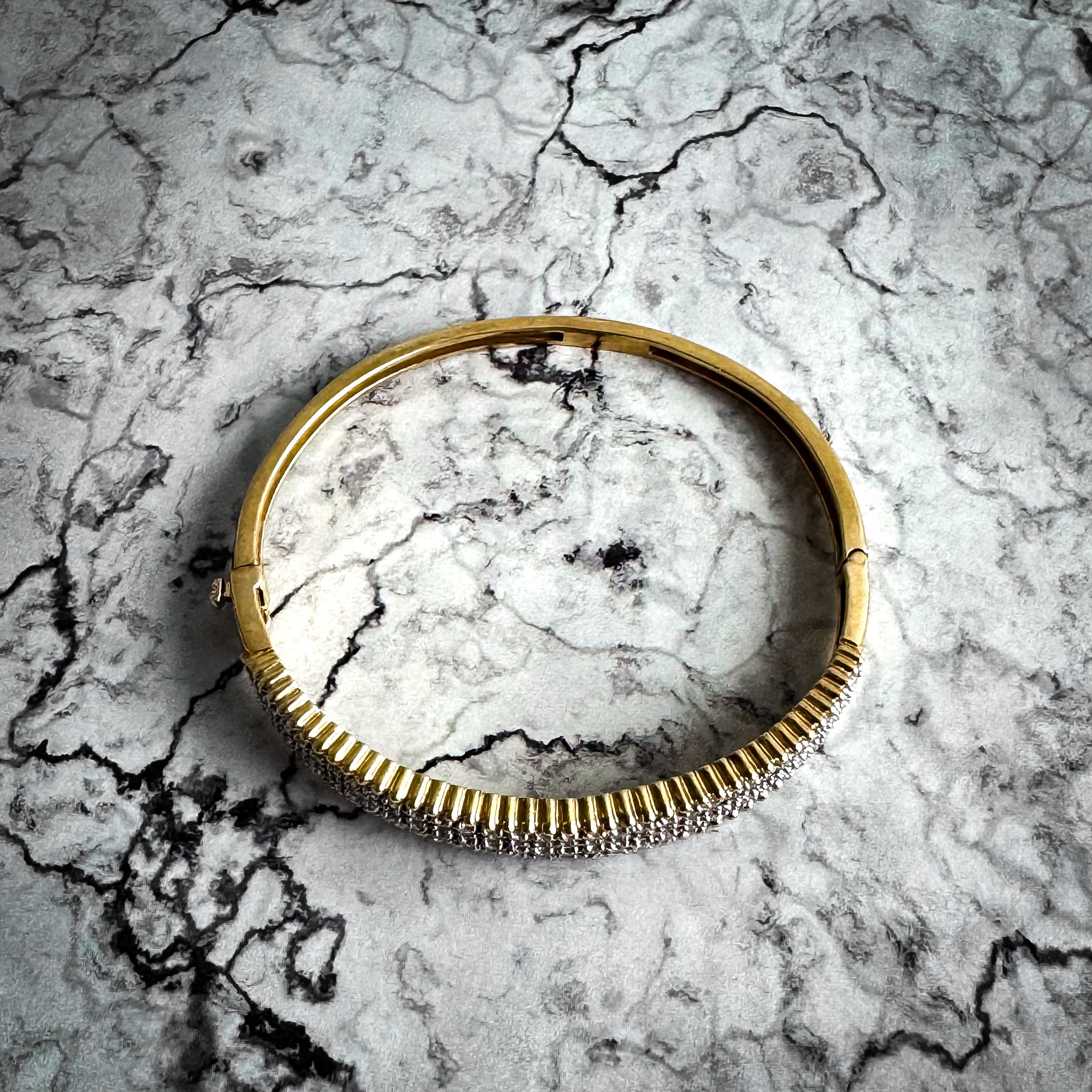 Bangle. 14K yellow gold hinged bangle bracelet front set with with 66 pave cut brilliant diamonds in two rows. VS/SI clarity grades and H/I color grade. Est. 2.0 total karat weight. 1995 appraised value $4,500 USD.