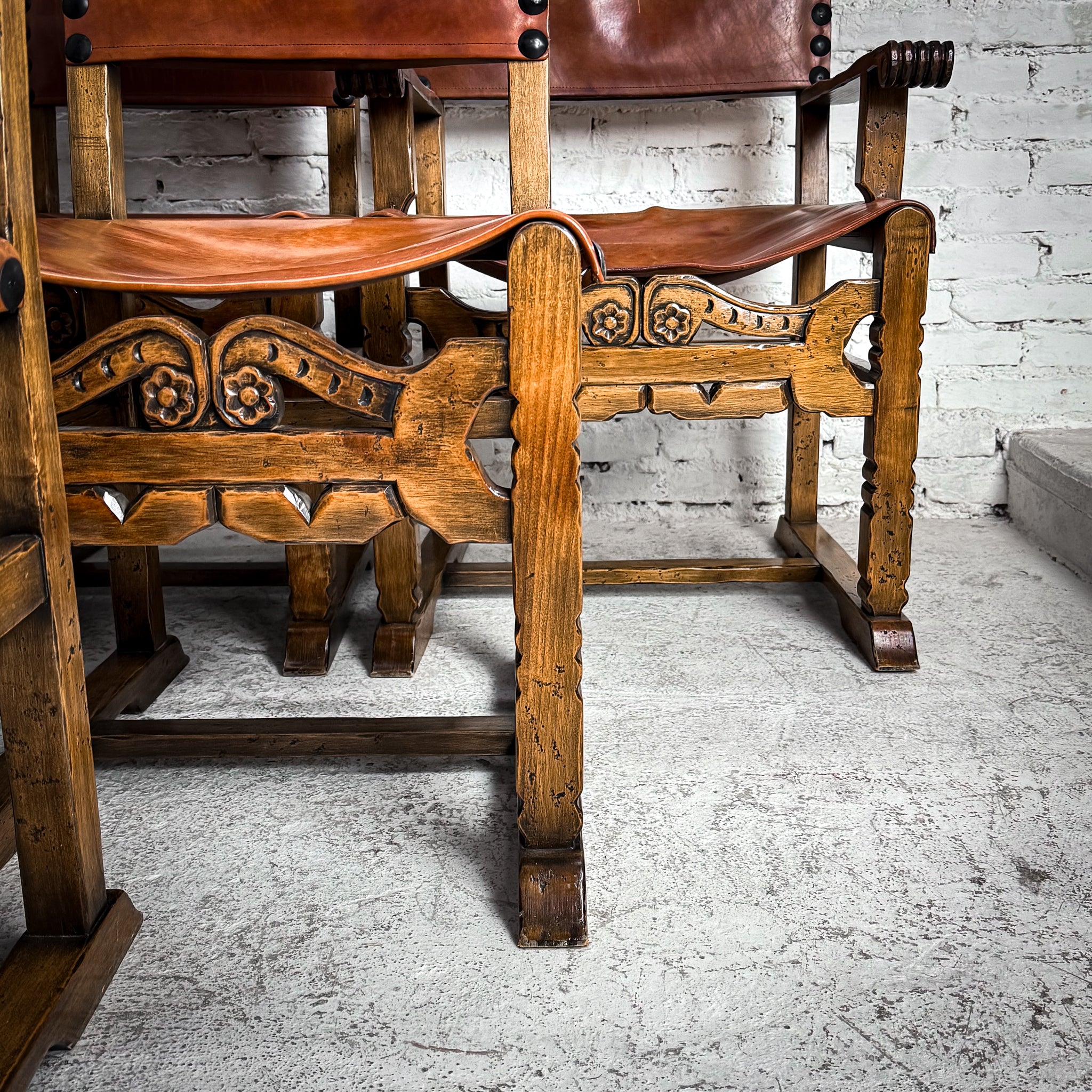 Armchair. Set 6 Evos NW308A Retail $799 USD ea. EVOS Spanish Colonial Rustic Armchair. Carved pine wood, tan studded leather seat & back. Turned finials, floral carved apron. Solid wood frame. Good vintage condition with patina.