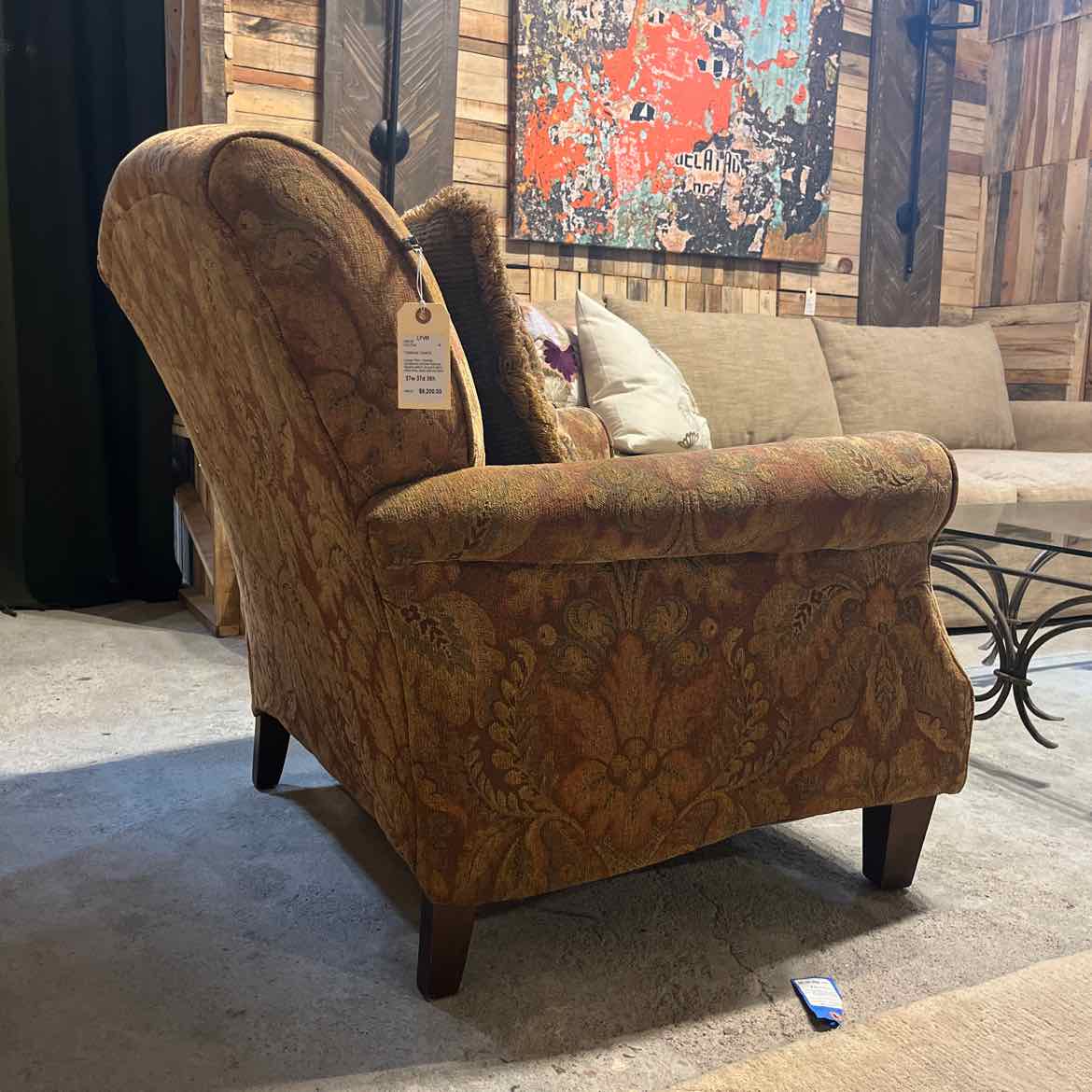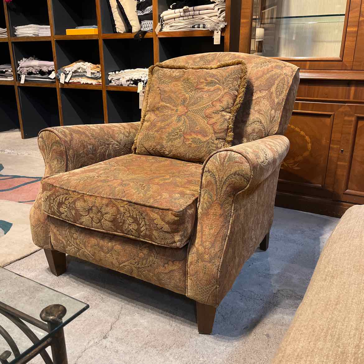 Lounge Chair. Havertys upholstered armchair featuring tapestry-pattern jacquard fabric, rolled arms, loose seat and back cushion, with tapered wooden block feet.