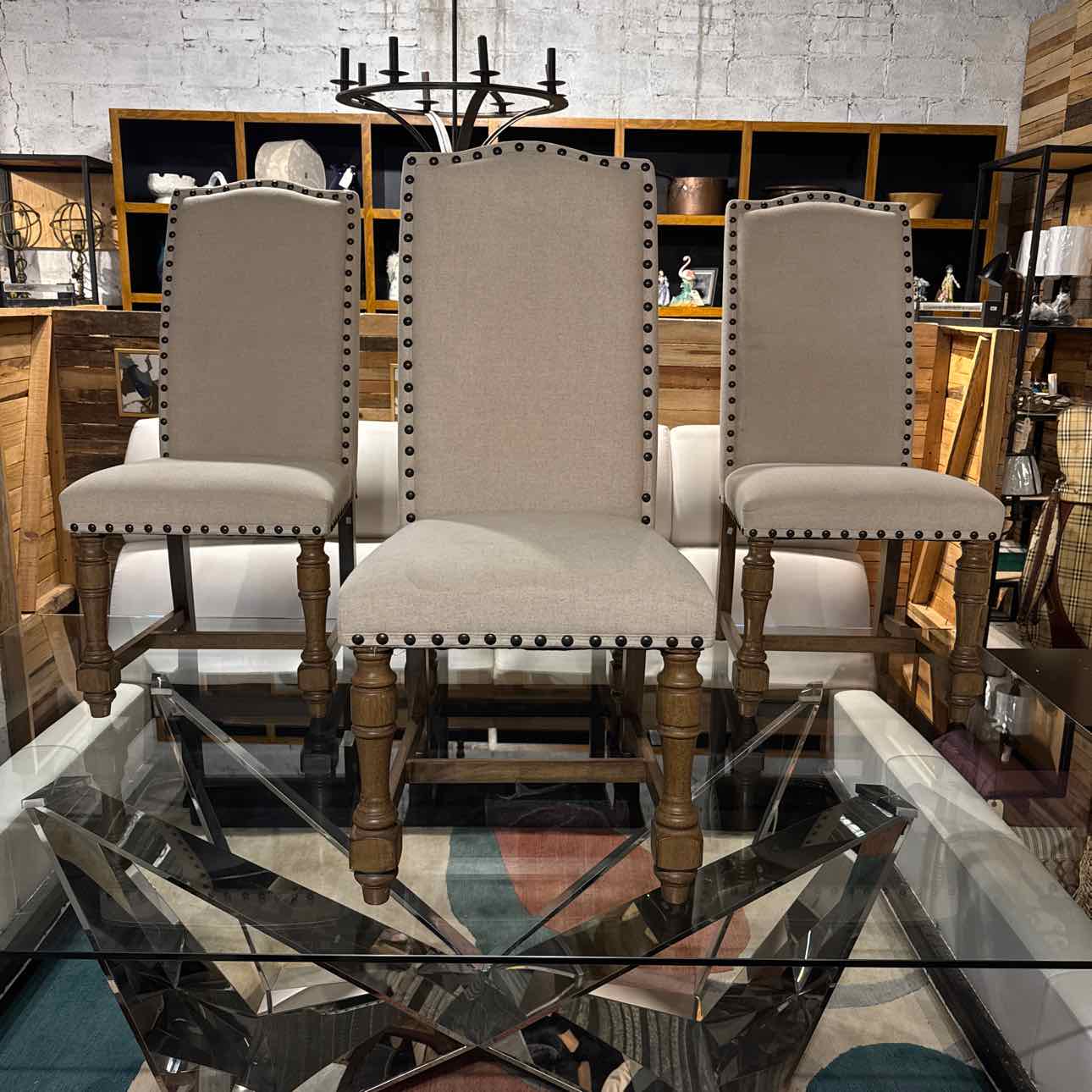 Dining Chair. Set of 8 prefab French-inspired dining chairs with beige linen-style upholstery, nailhead trim, and turned wood legs. Some chairs show stains and loose frames.