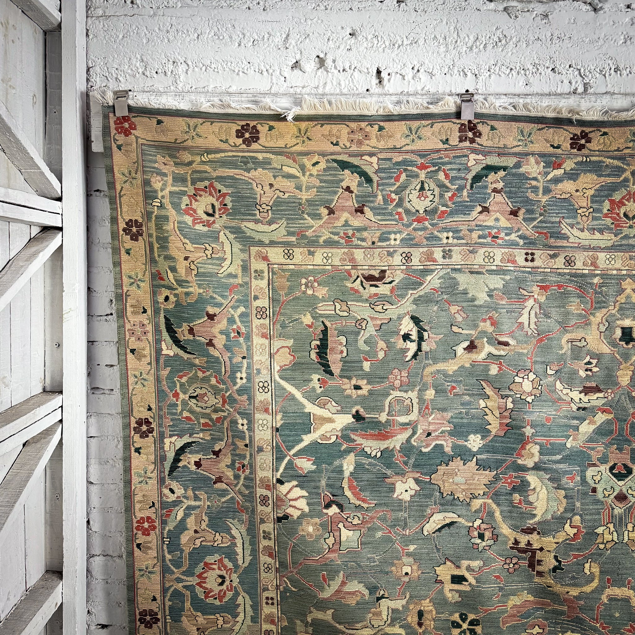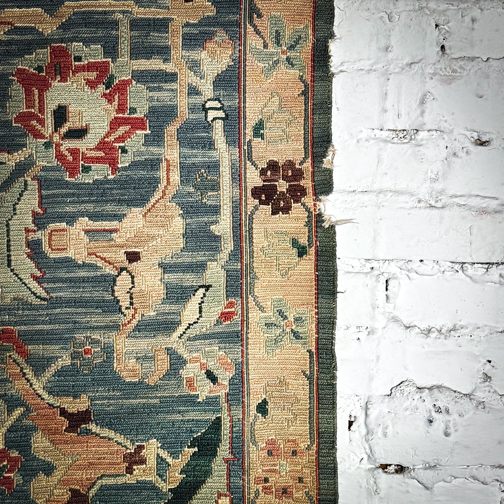 Rug. Indian handwoven wool rug in faded blue, coral, and beige with floral motifs and border. Flatweave tapestry design. Minor fringe wear.