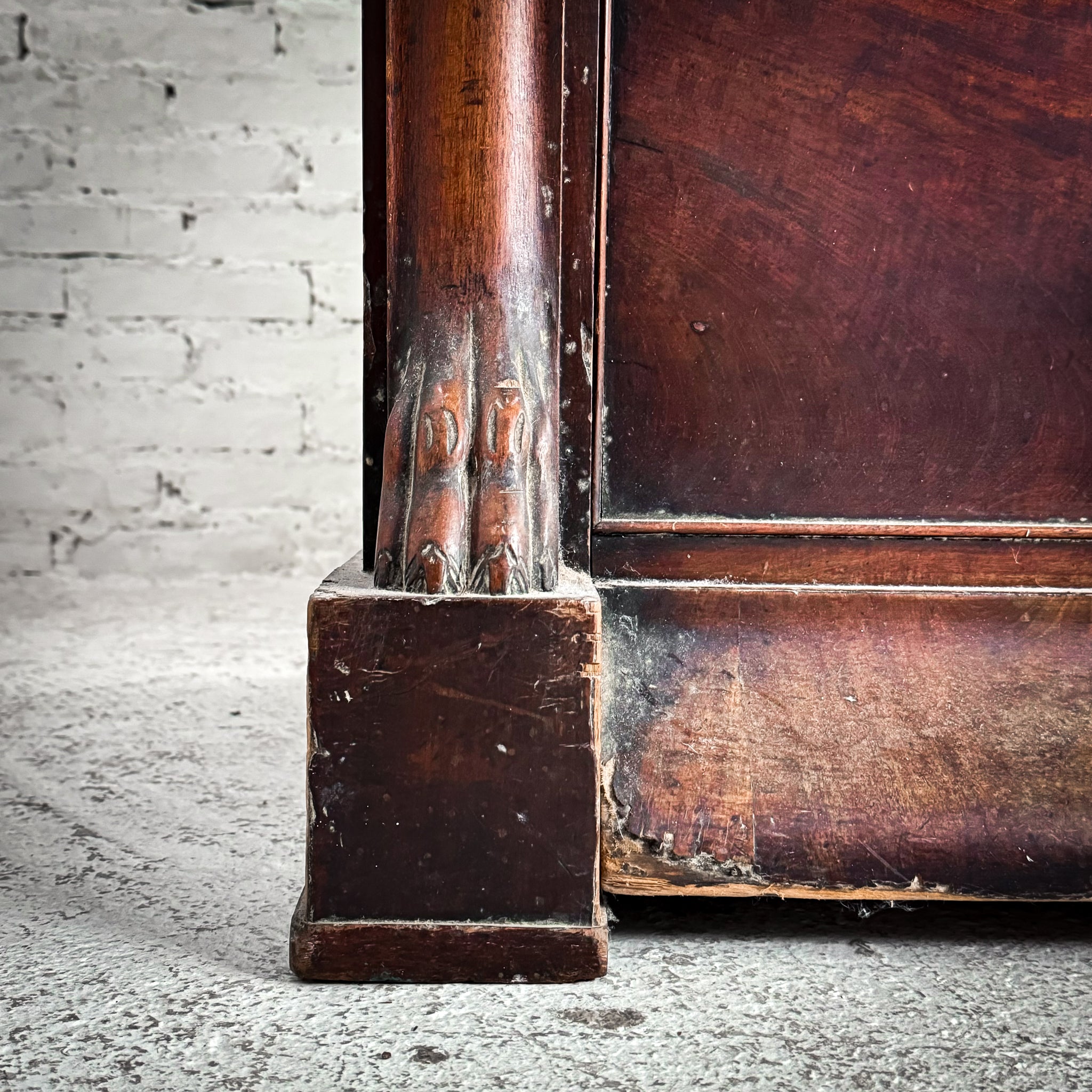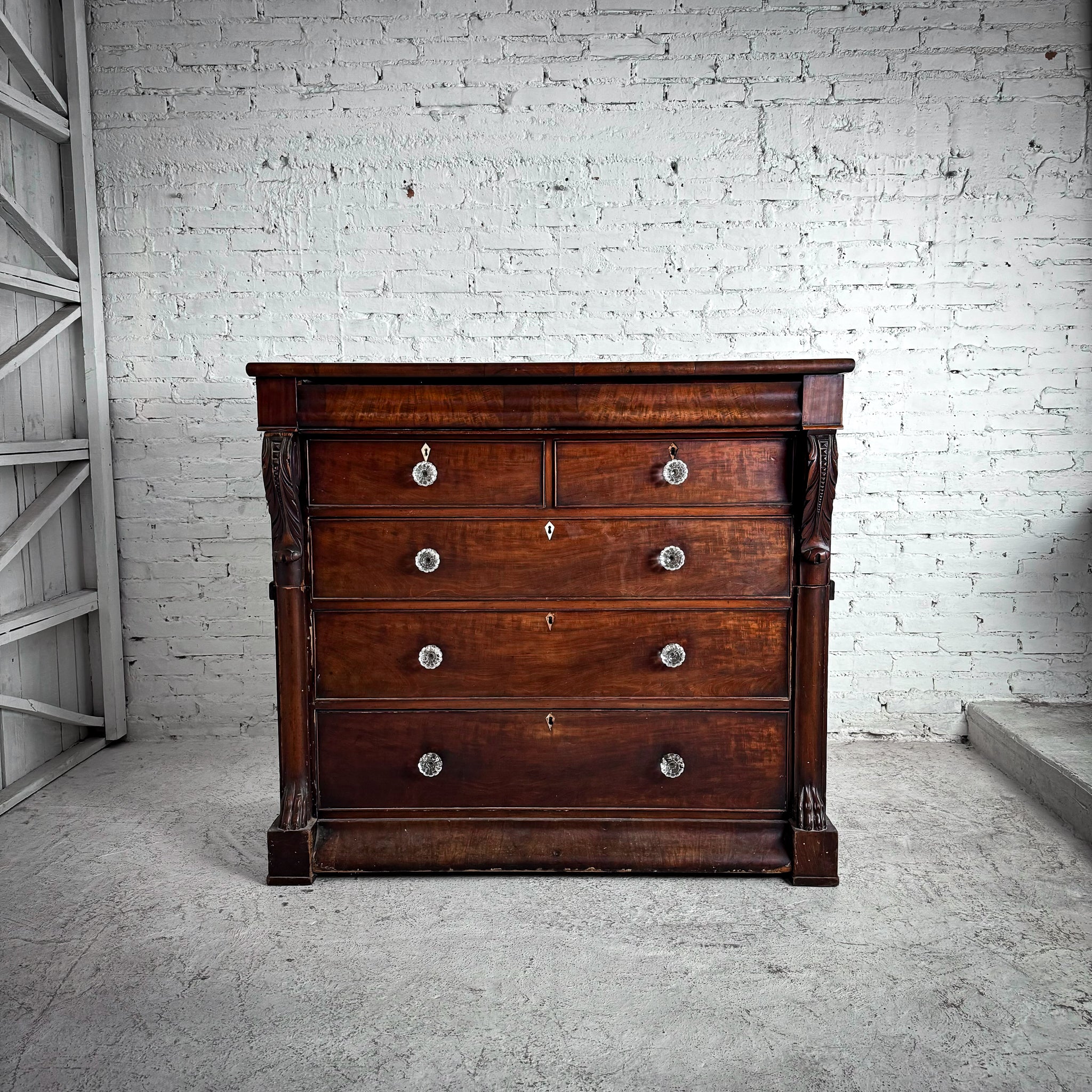 Chest of Drawers. 19th c. Victorian style 3 piece veneer wood chest of drawers w/ top hidden drawer, two small drawers and 3 large drawers. W/ scalloped glass handles & carved claws & corbel. Missing one corbel.