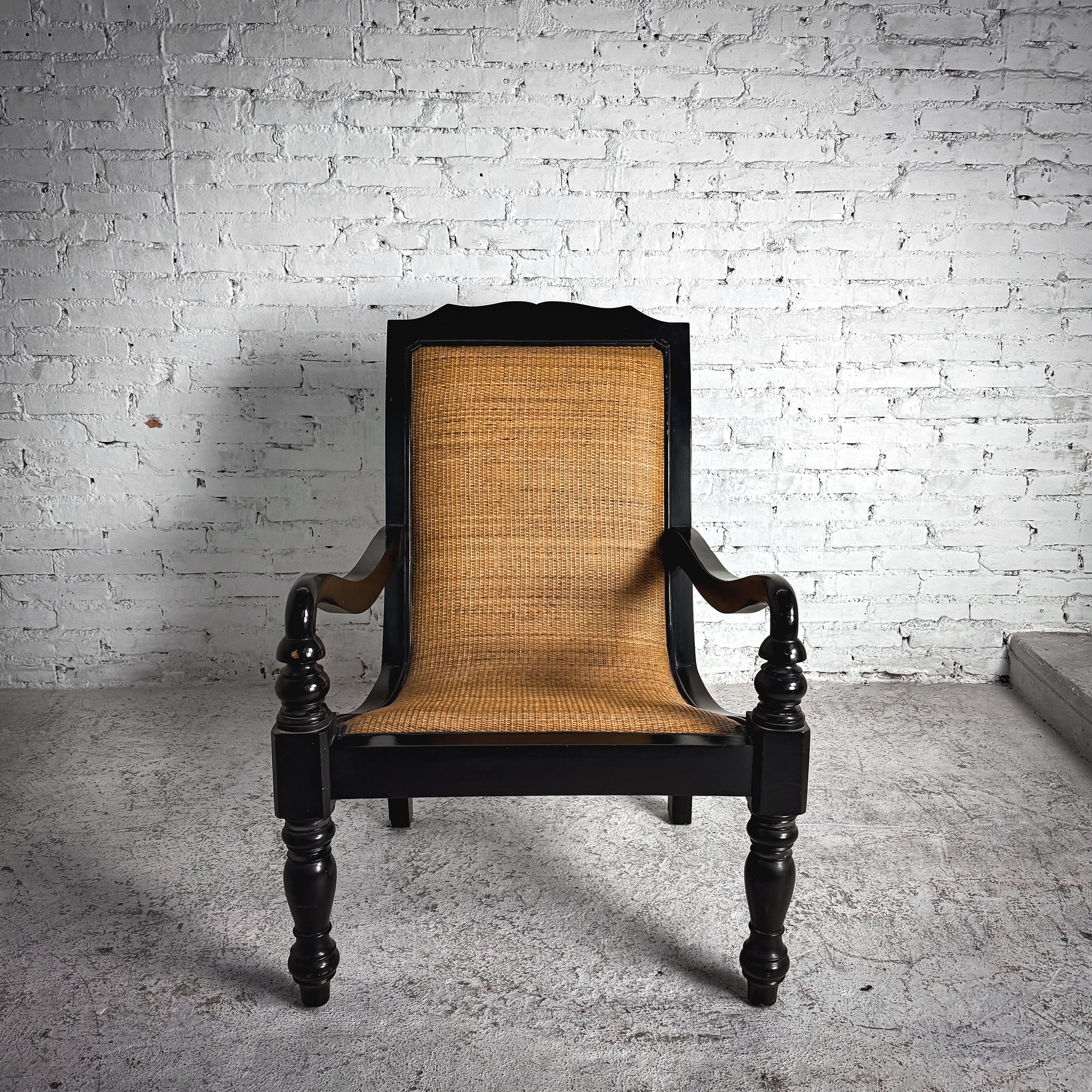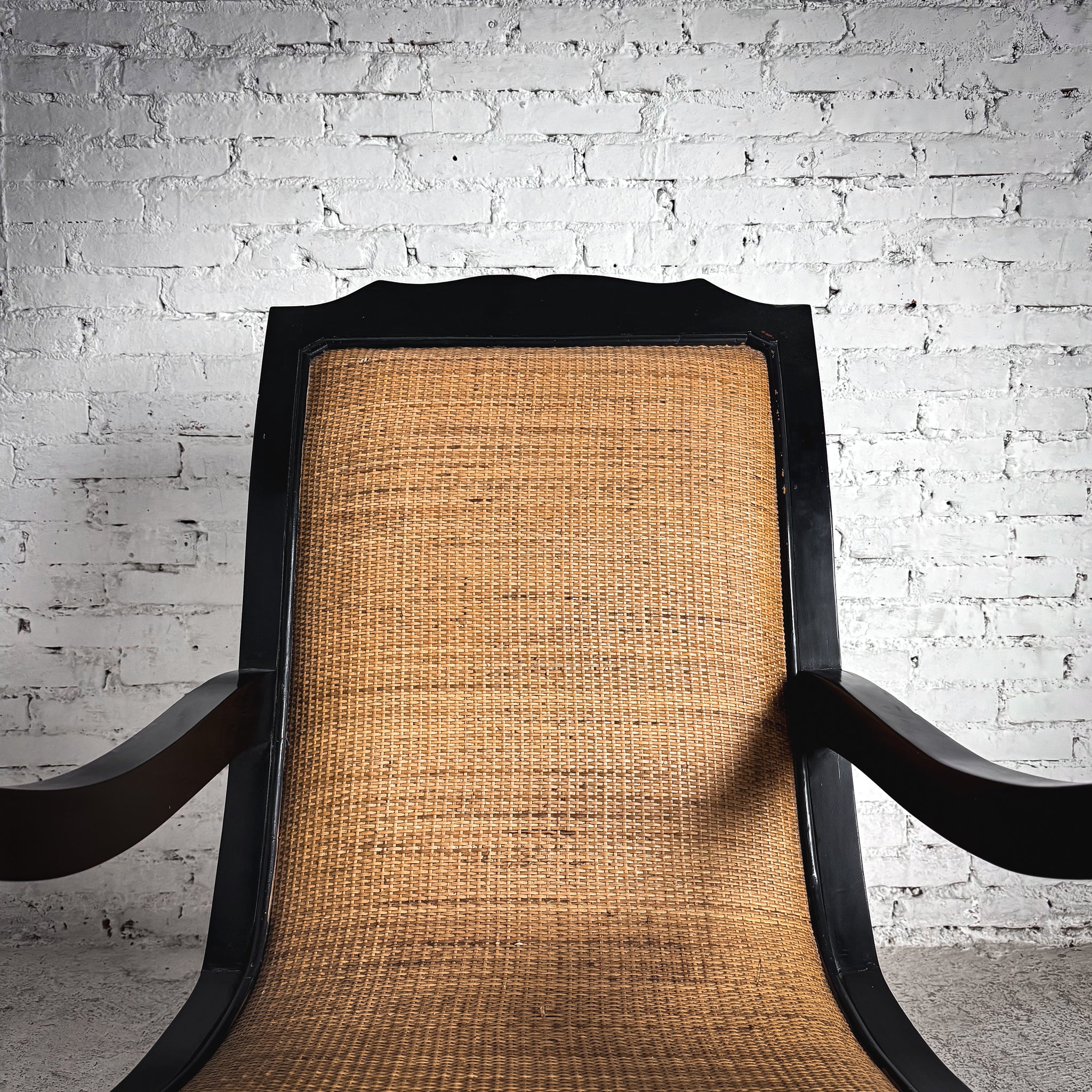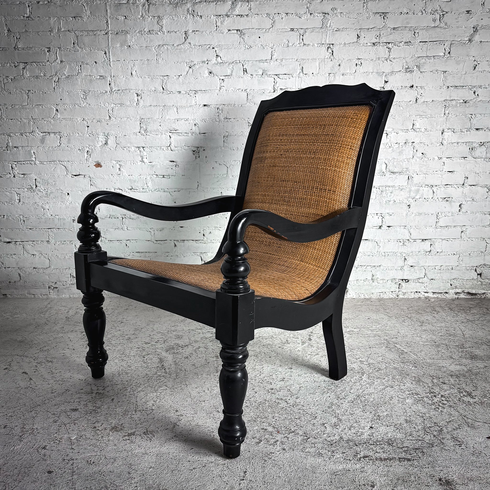 Armchair. Plantation-style lounge chair features a black lacquered wood frame with sculptural turned legs and sweeping arms. Woven wicker seat and back with fitted padding provide firm, supportive comfort. Minor tear to wicker, unobtrusive.