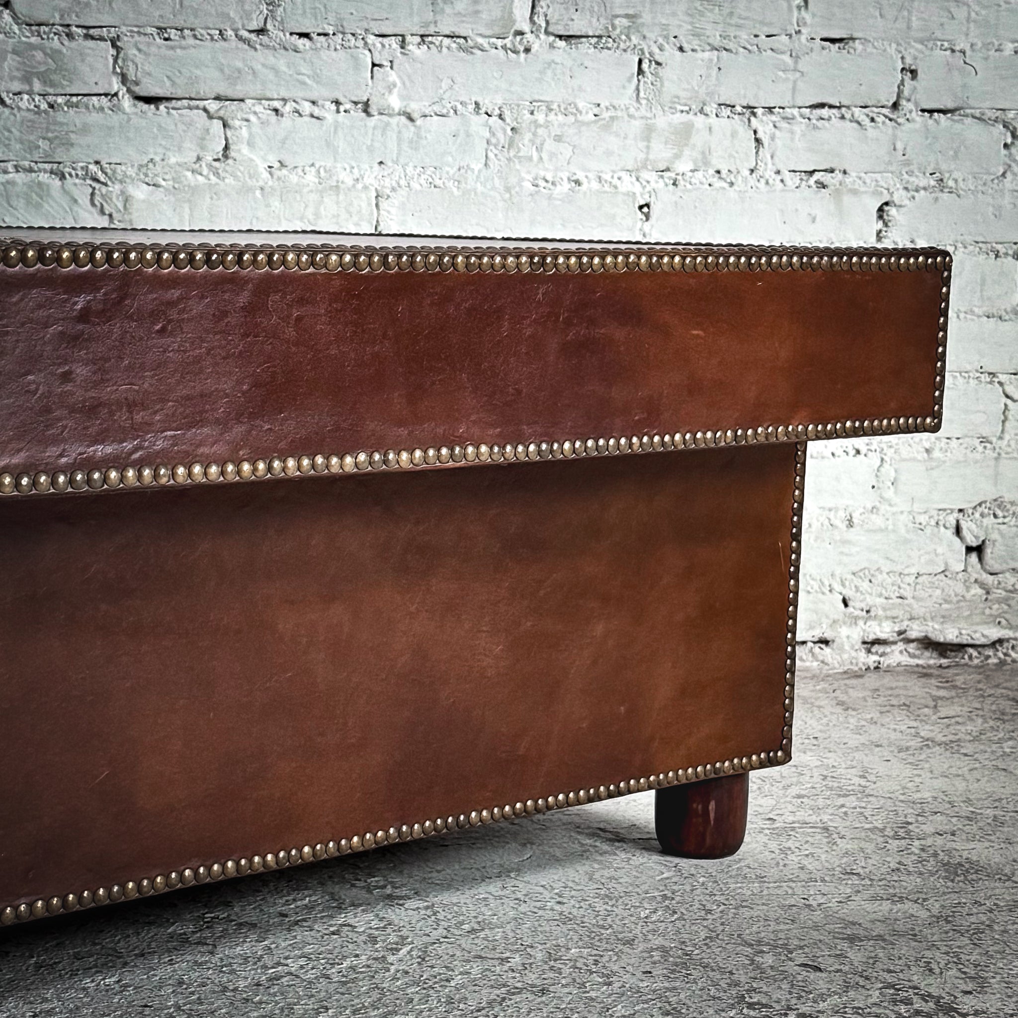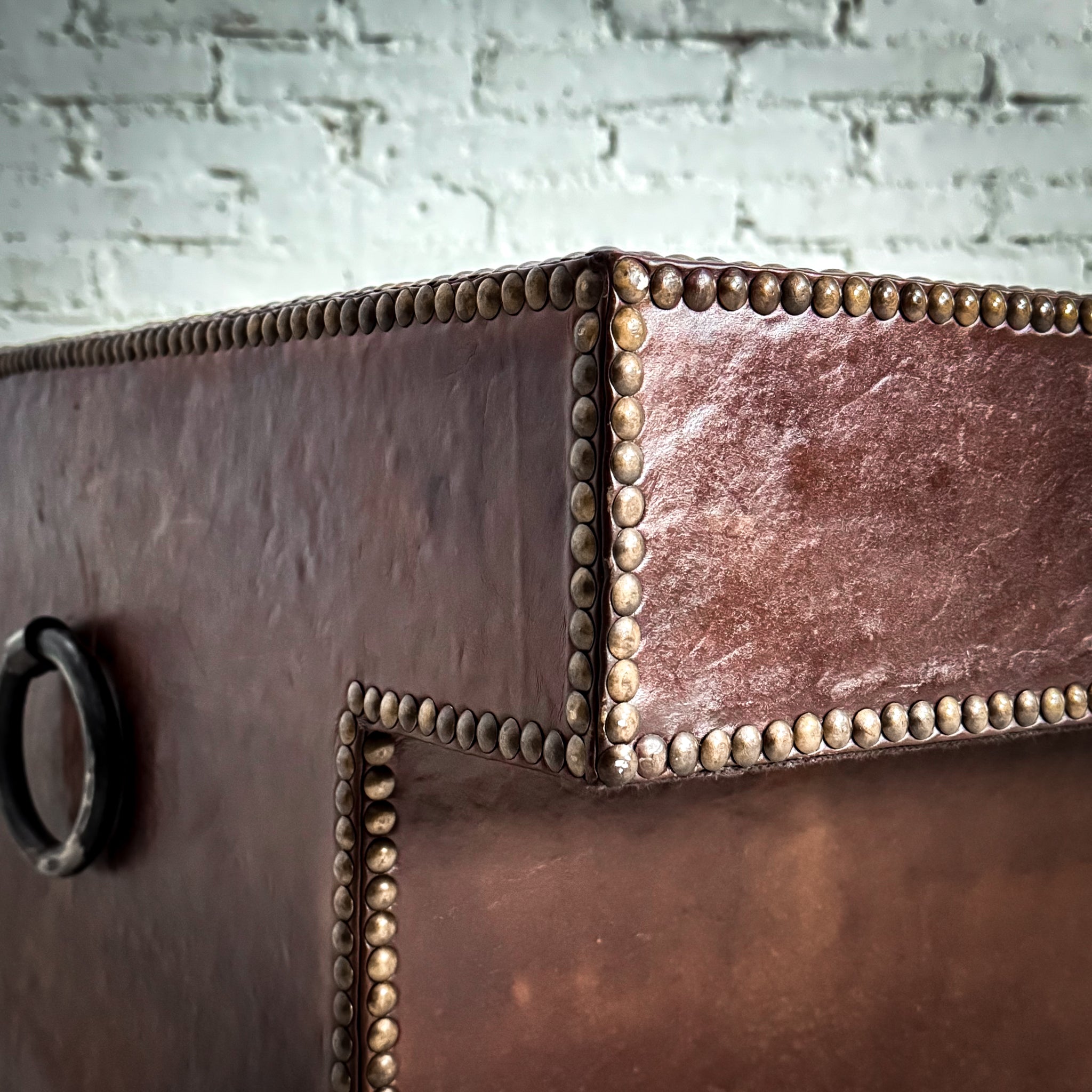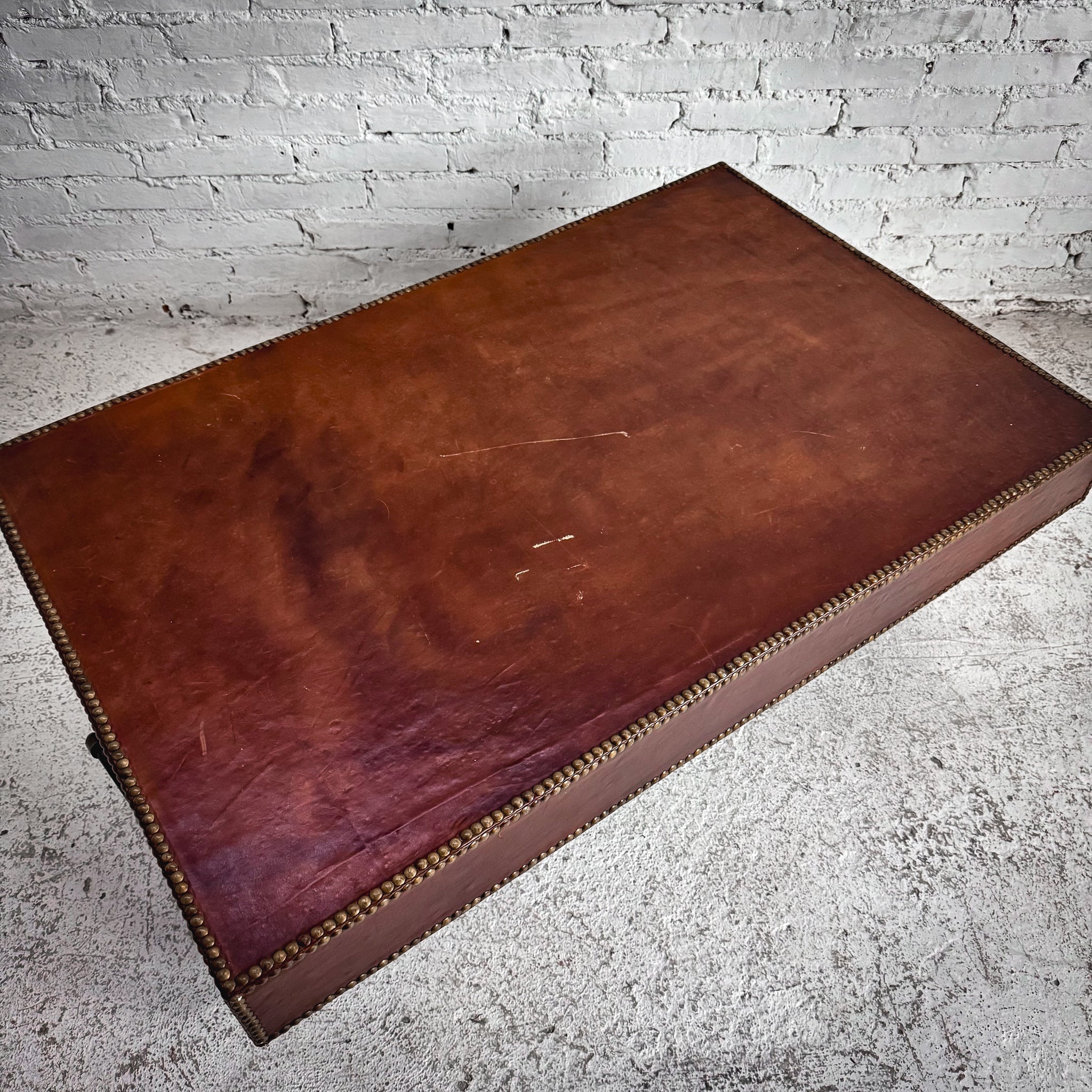 Cocktail Table. Trunk-style coffee table upholstered in cognac brown leather. Features a rectangular form with antique brass nailhead trim. Heavy-duty side ring handles. Low-profile barrel feet. Presents surface scratches.