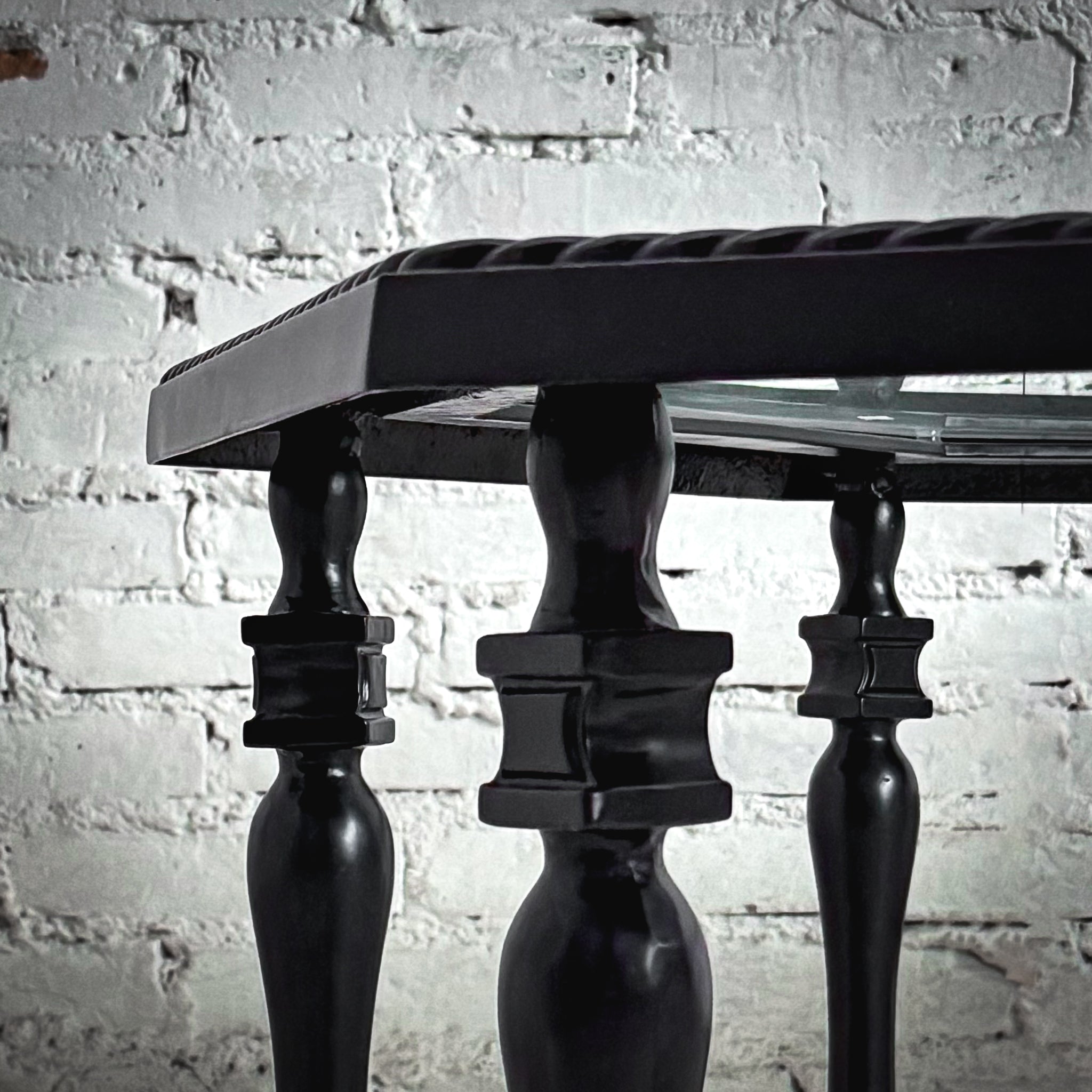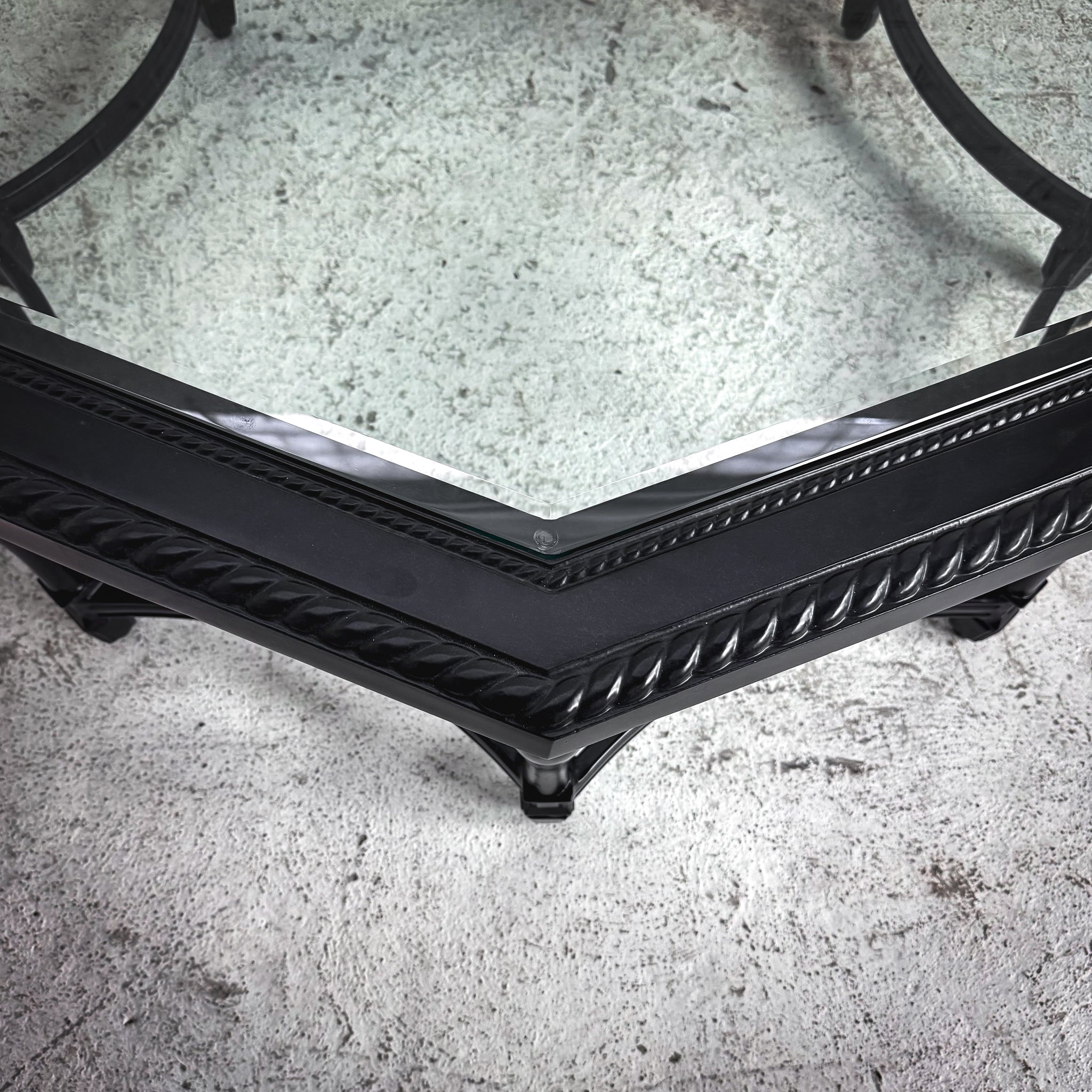 Garden Table. Carlisle Octagon chat table in Onyx aluminum with a glass top, crafted from 100% ingot aluminum featuring hand-filed welds and a rich, multilayered, UV-protected topcoat finish.