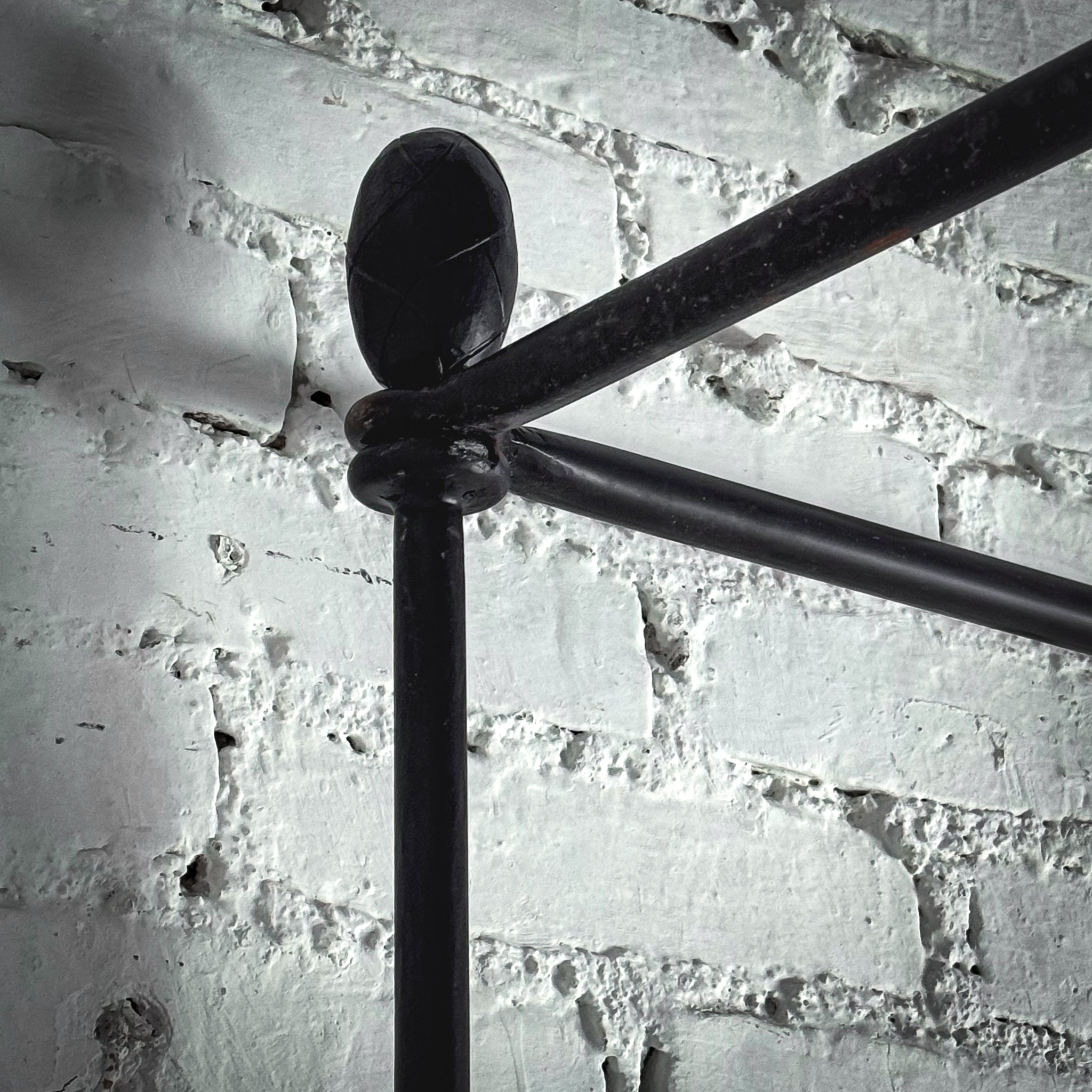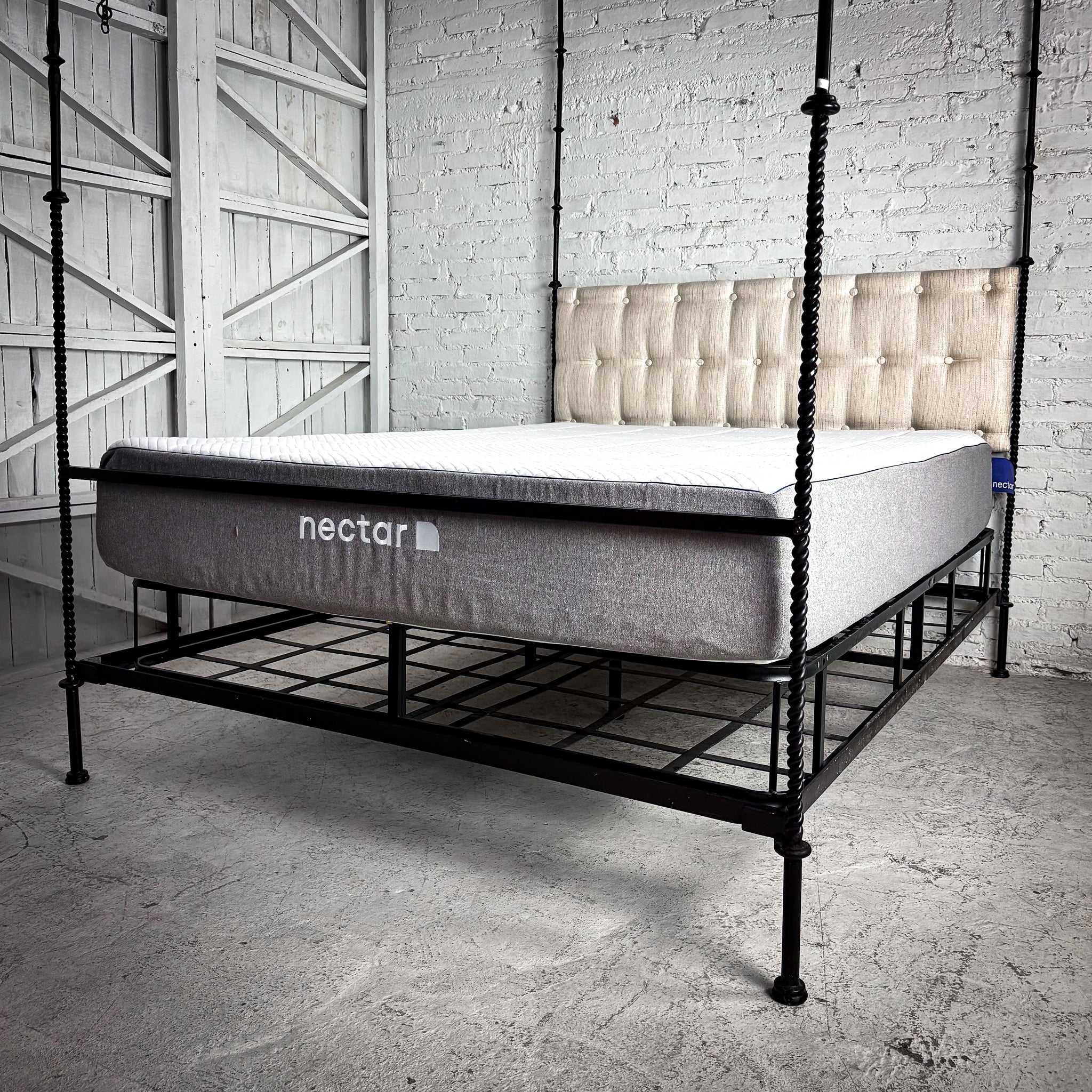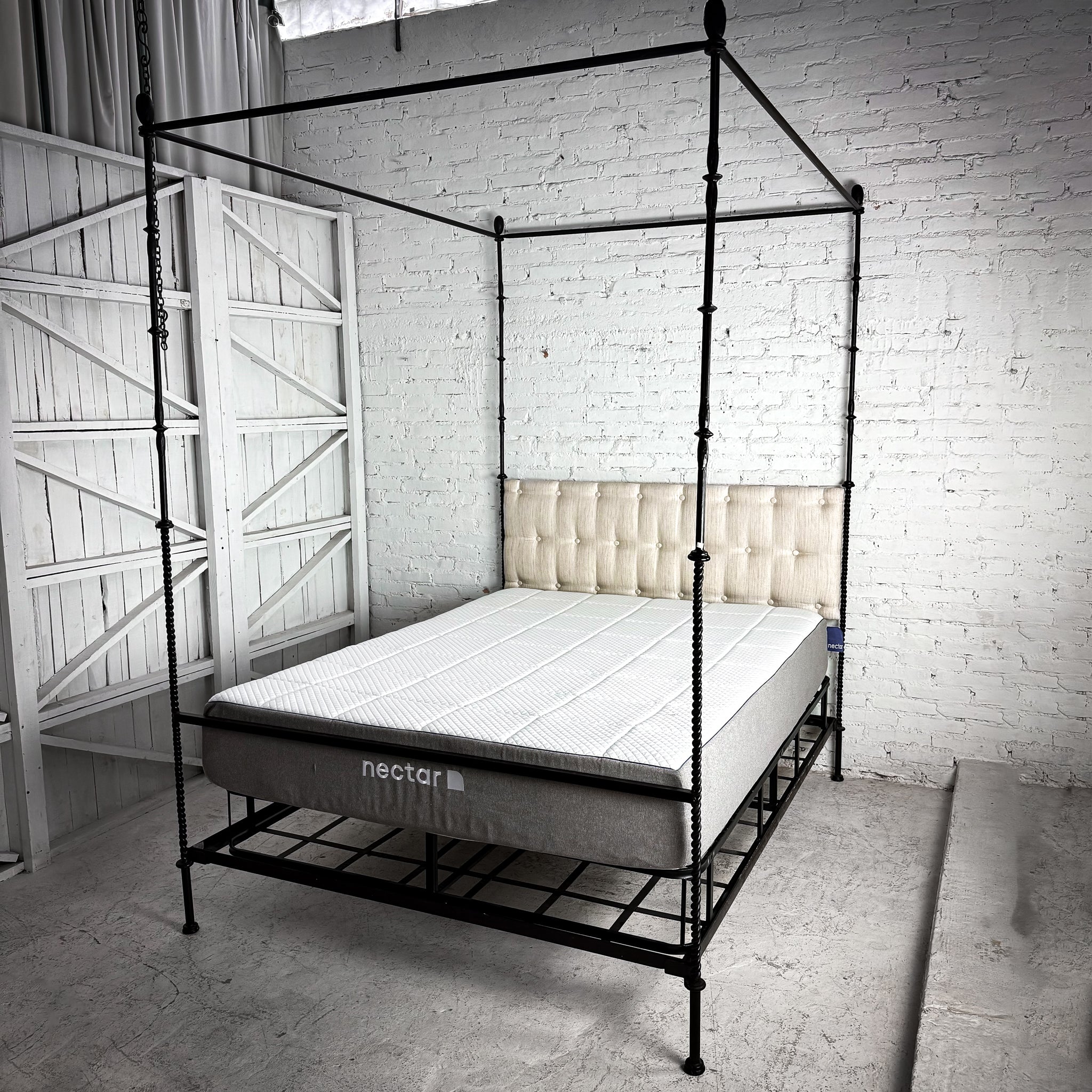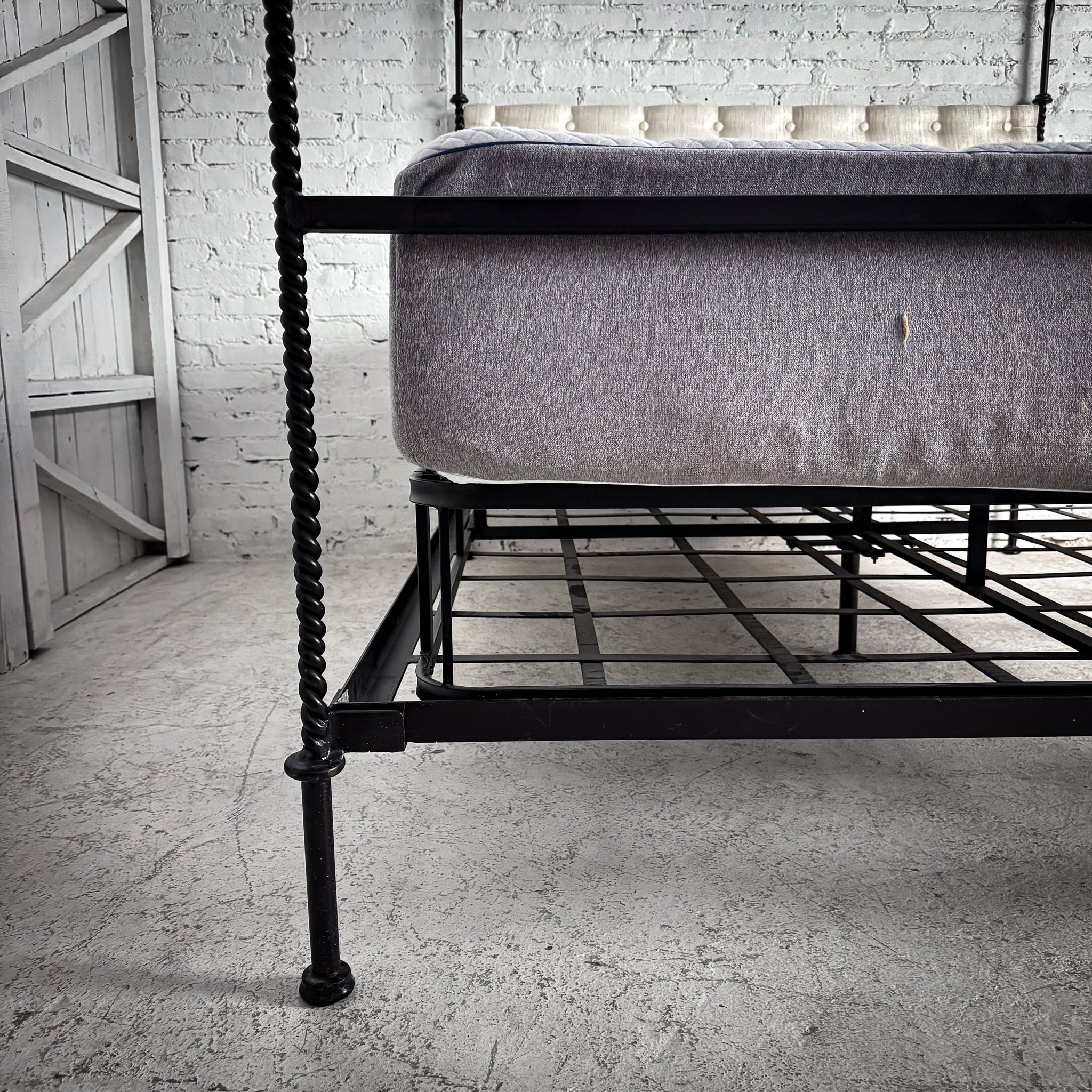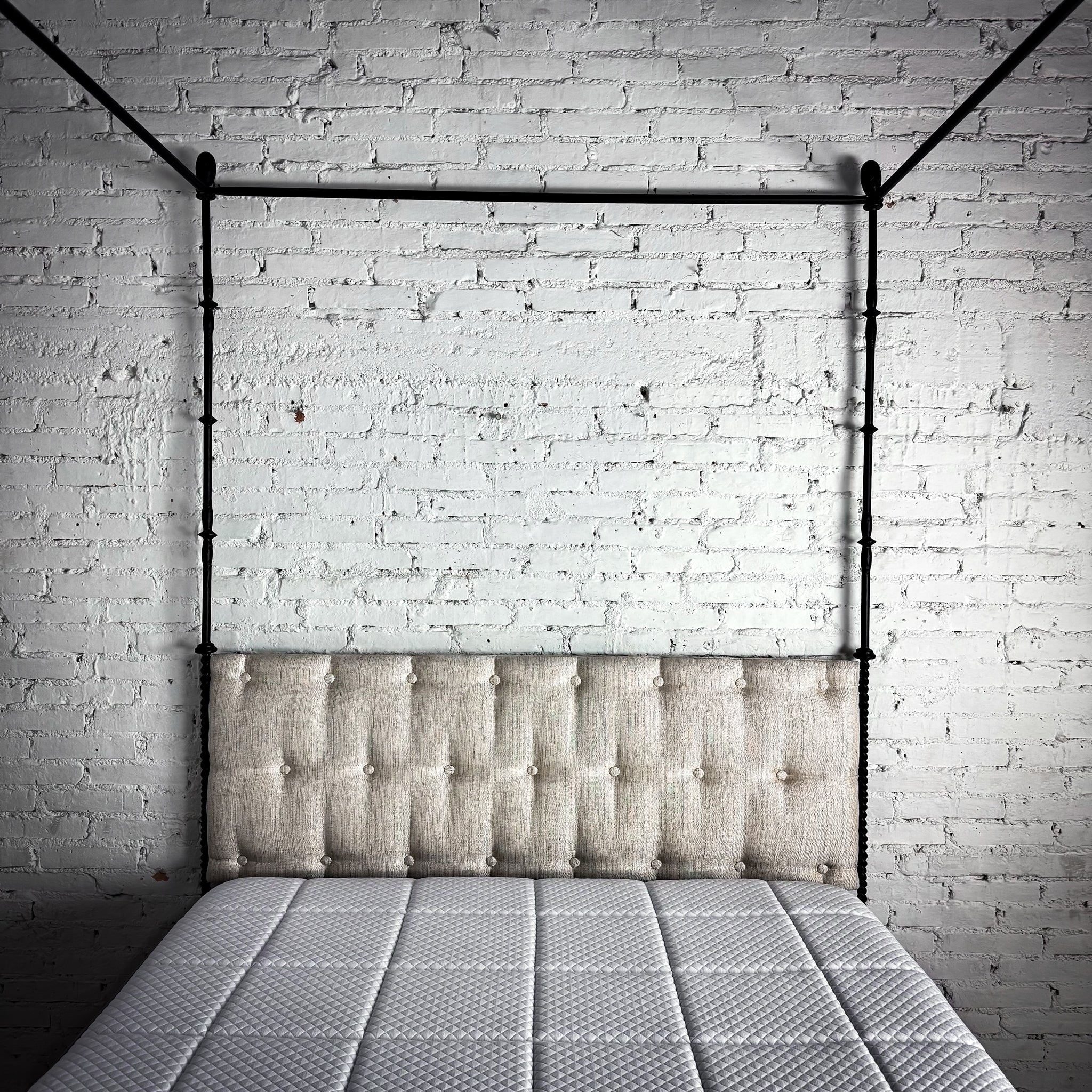 Bed. EVOS NI-42 $2,760 USD Retail. Queen ebonized iron frame with canopy, pinecone finials, slender twist posts, and a contrasting light linen upholstered headboard. All-in one foundation bax and mattress included.