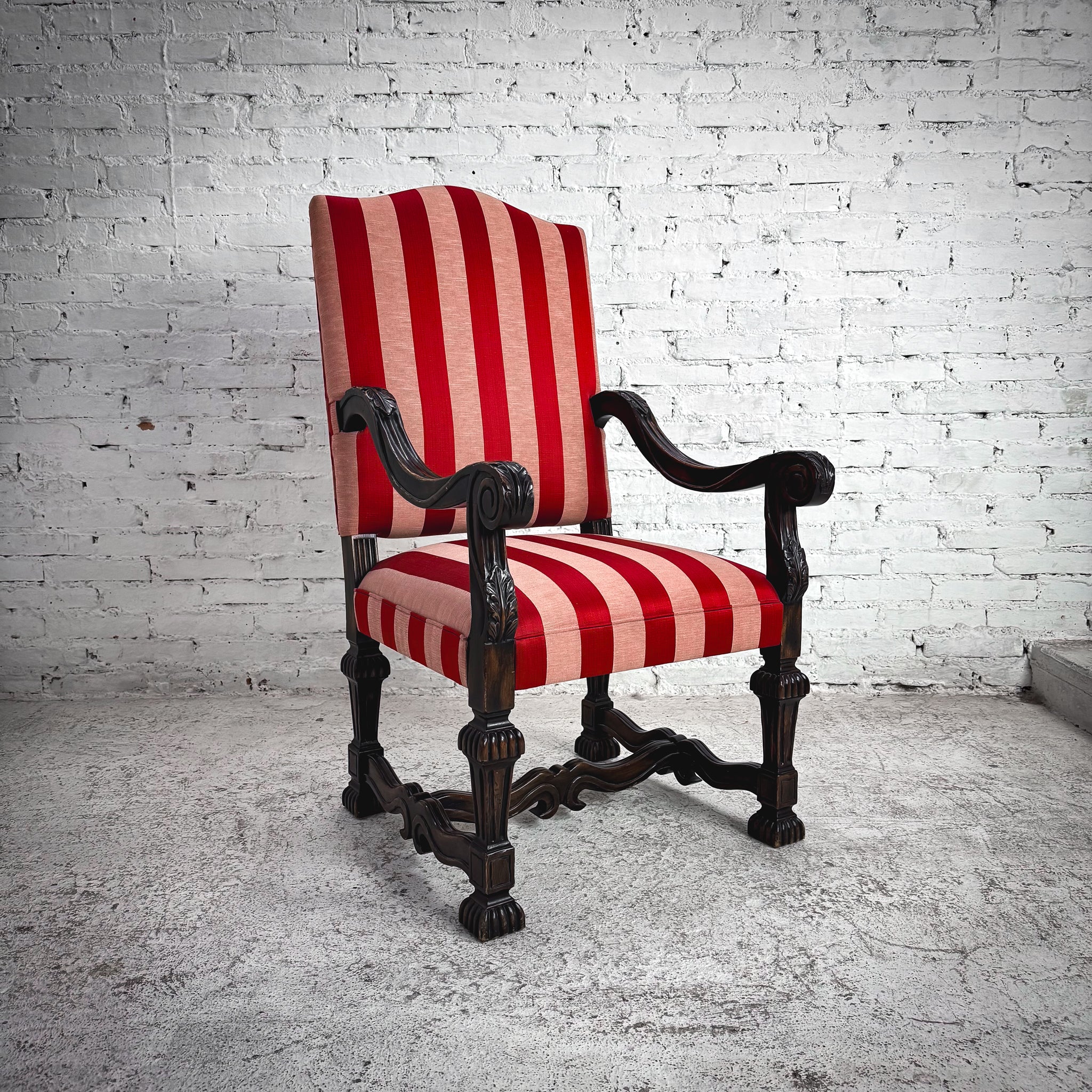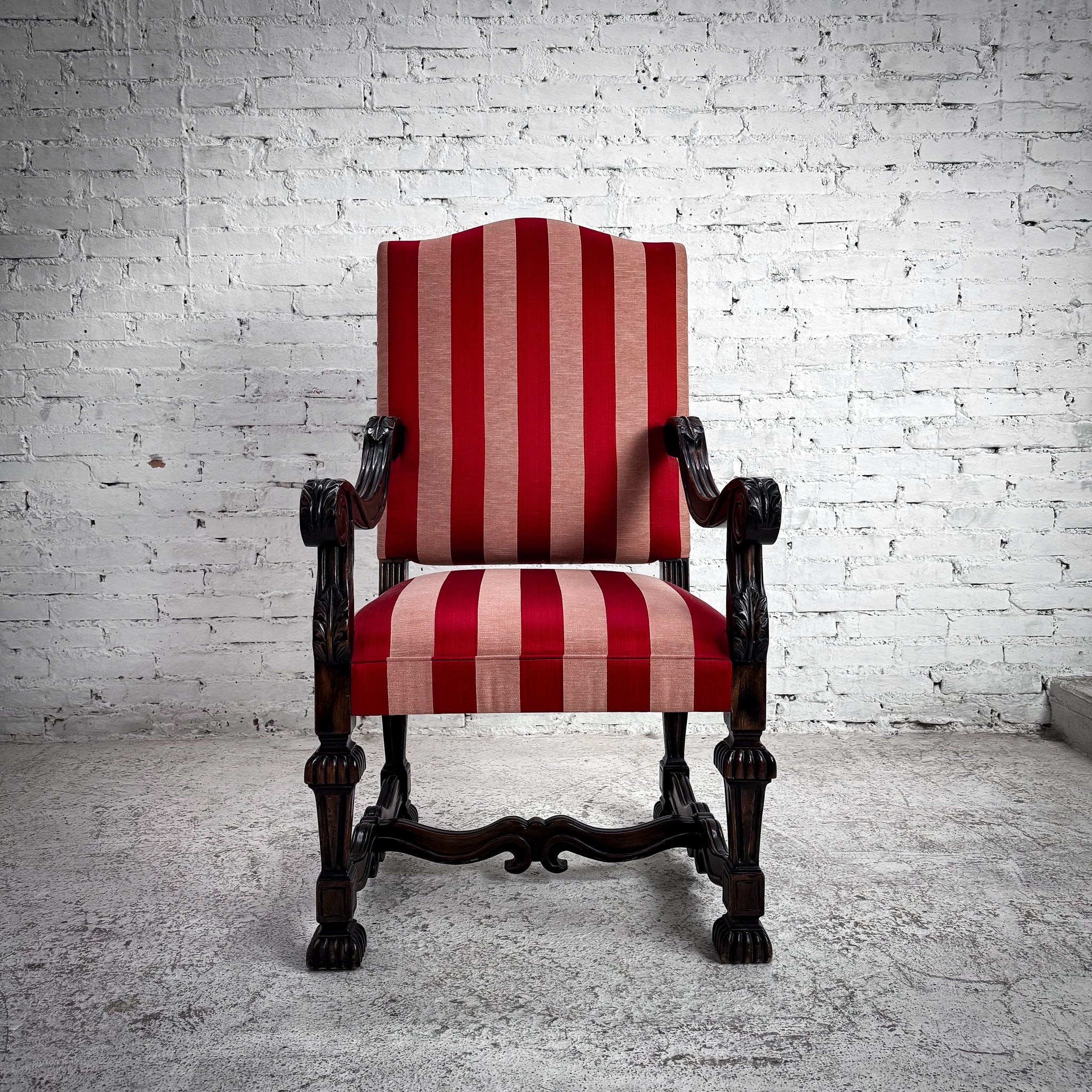 Armchair. Traditional carved alder armchair with acanthus detailing and fluted legs, upholstered in red-and-cream striped silk fabric over padded seat and back.