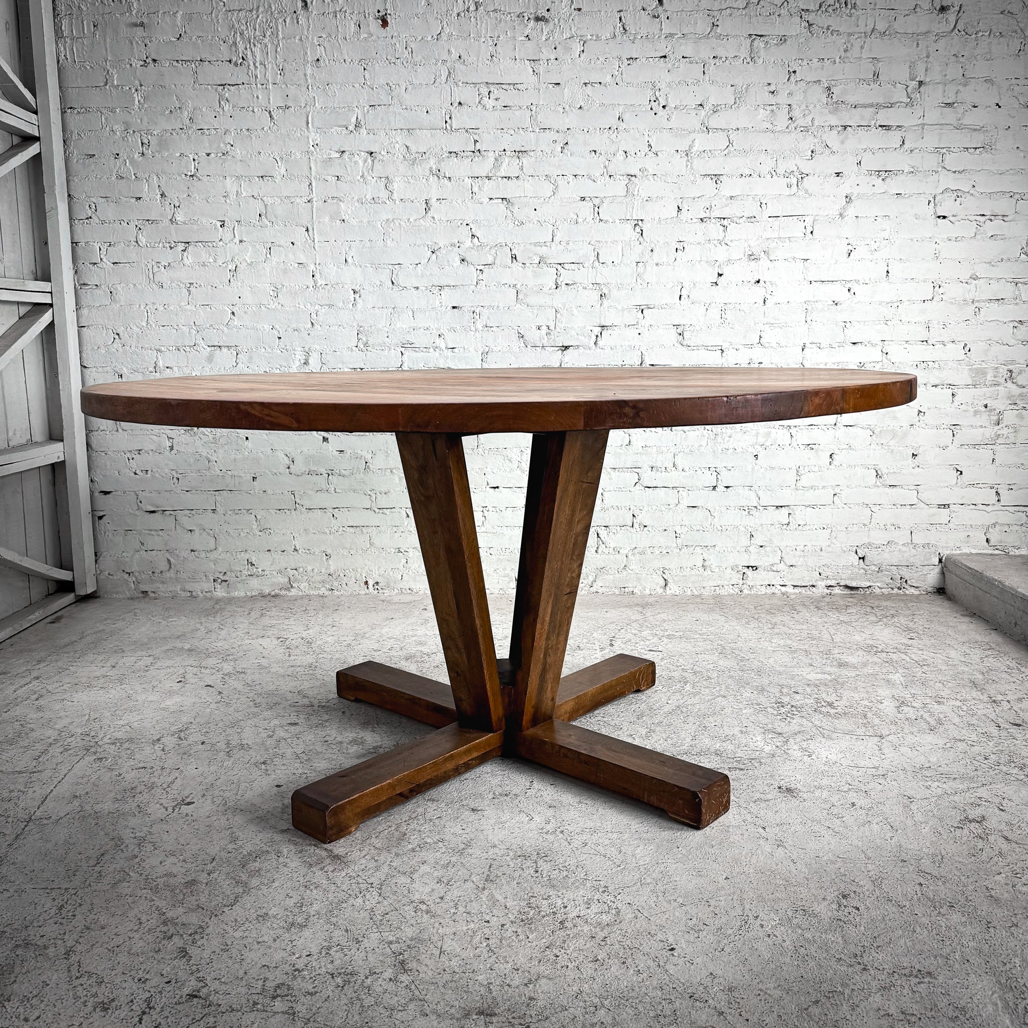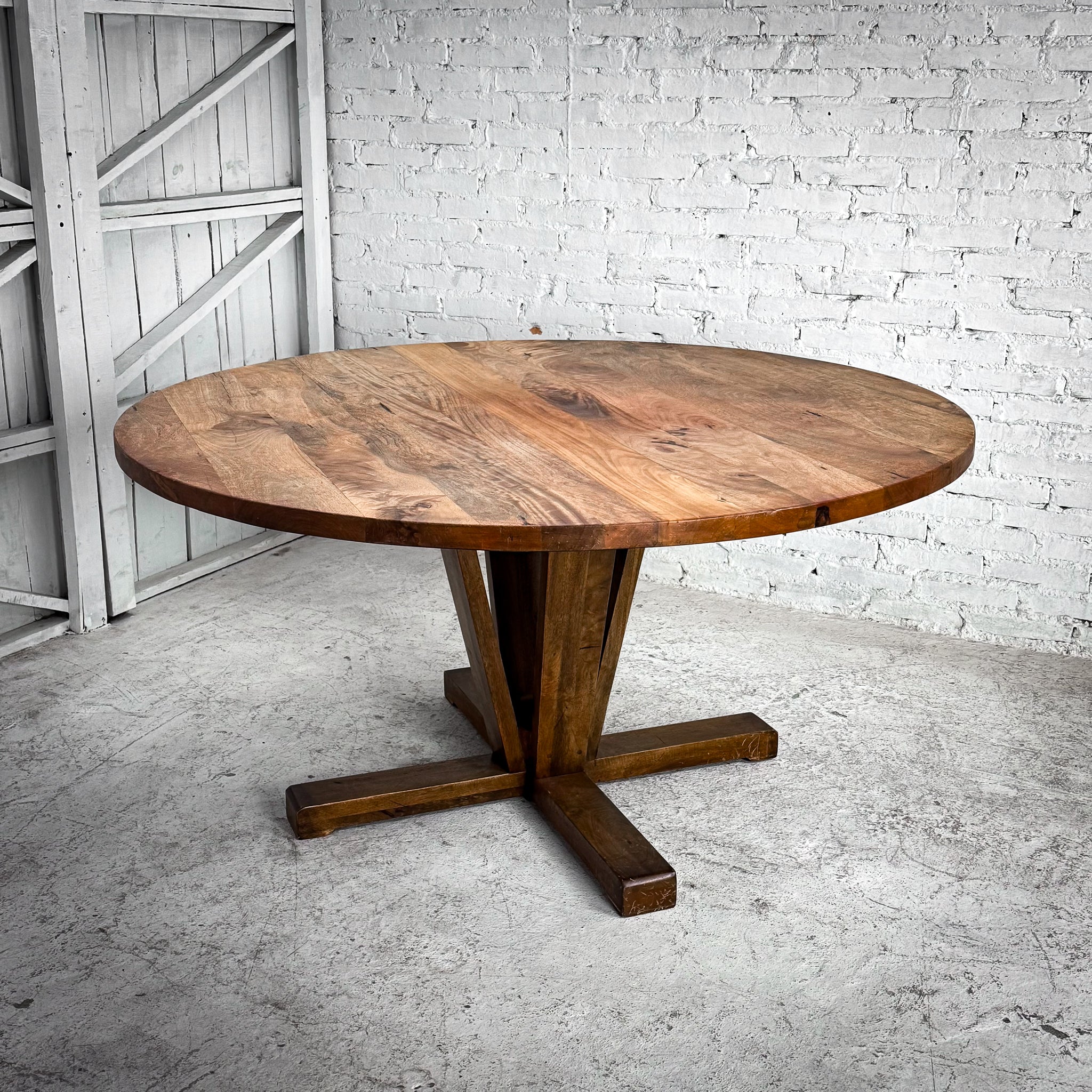 Dining Table. Smooth circular top dining table of mixed reclaimed woods with burnished edges and a sculptural cross pedestal base. Tabletop sits slightly off alignment on the base. Minor surface scratches to the base.