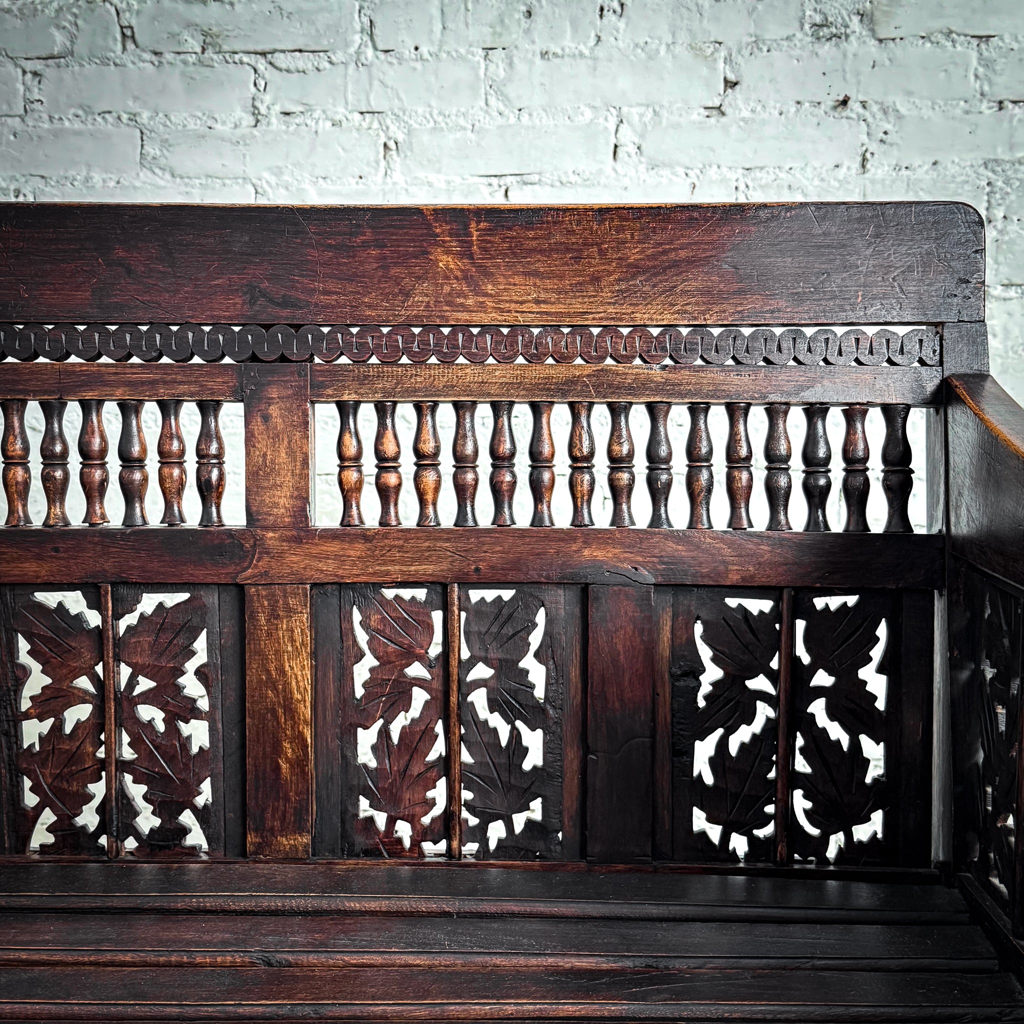 Bench. REPAIRED ARM.Indian wood settee with turned spindles, pierced foliage panels, and a slatted seat, showcasing espresso finish and aged patina.