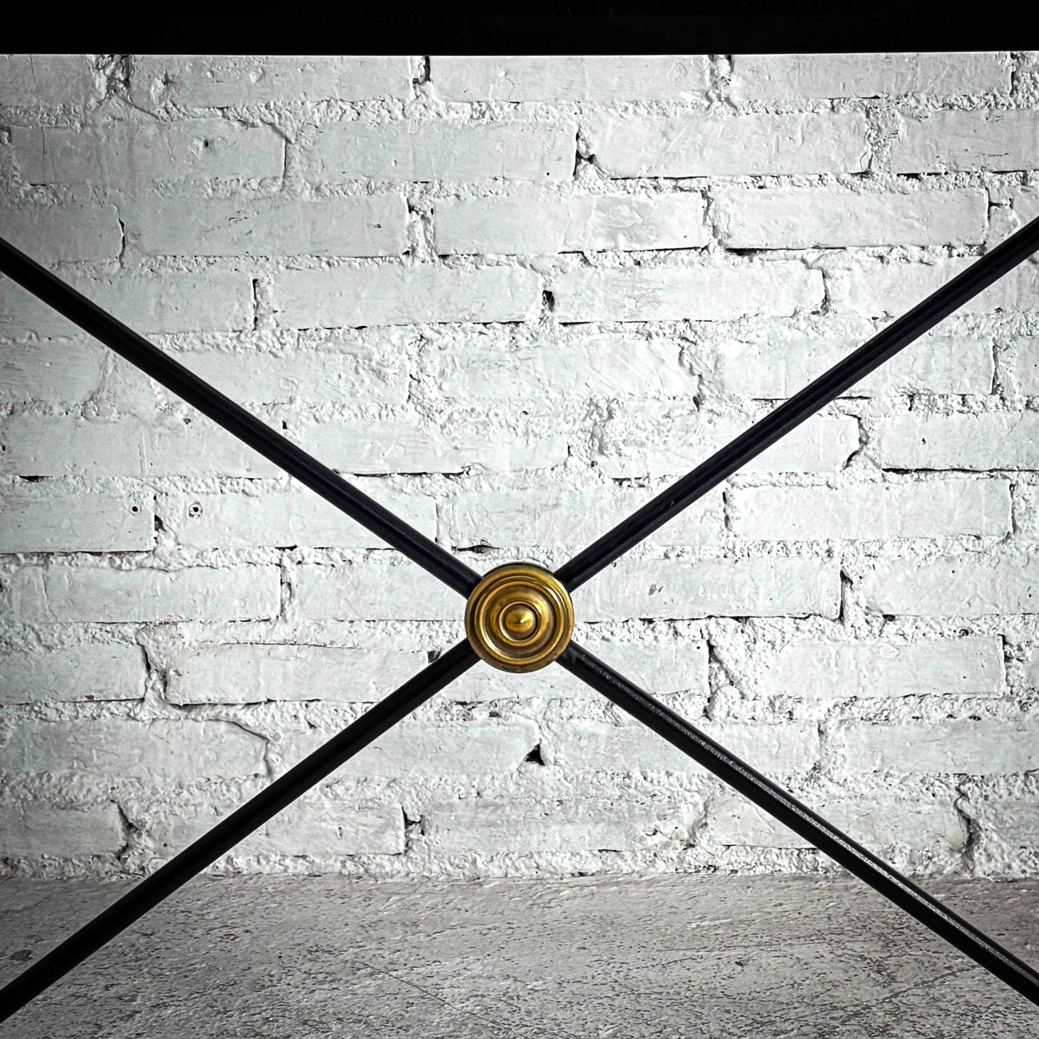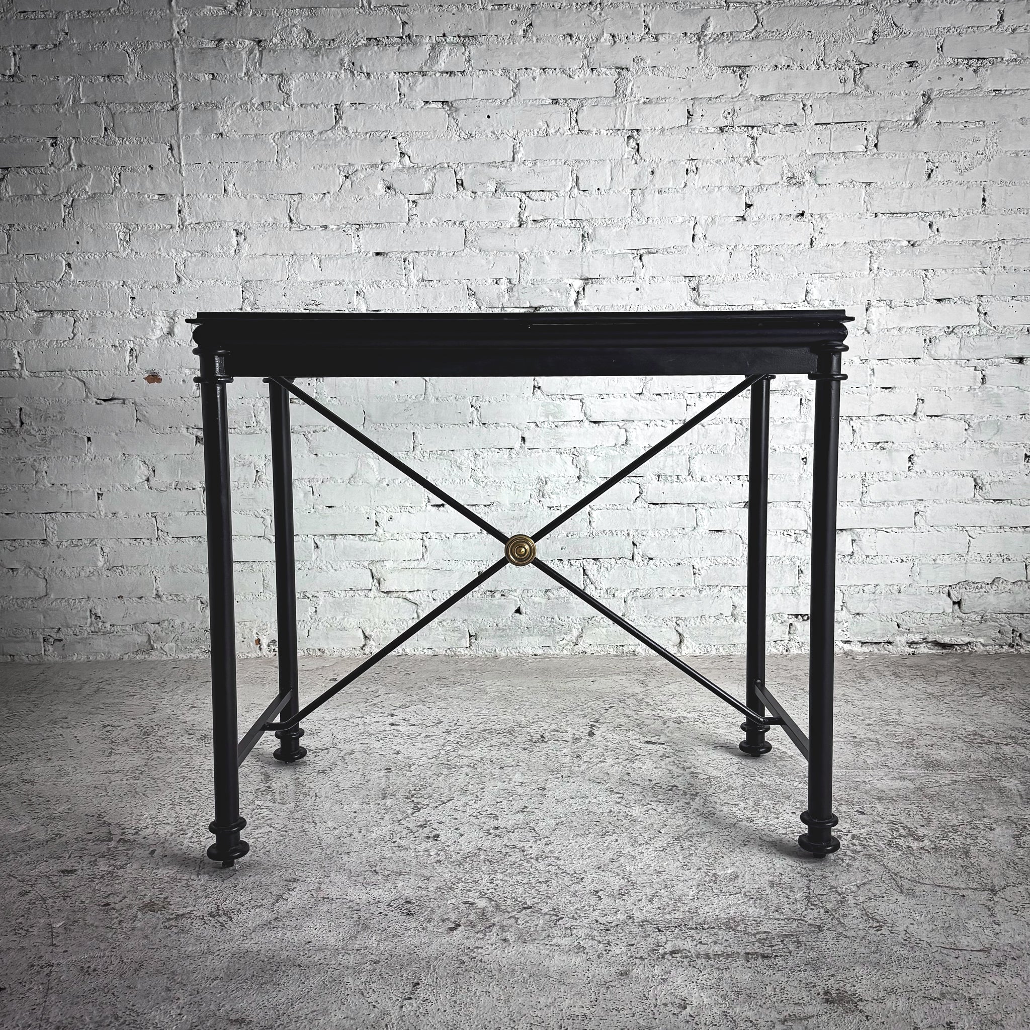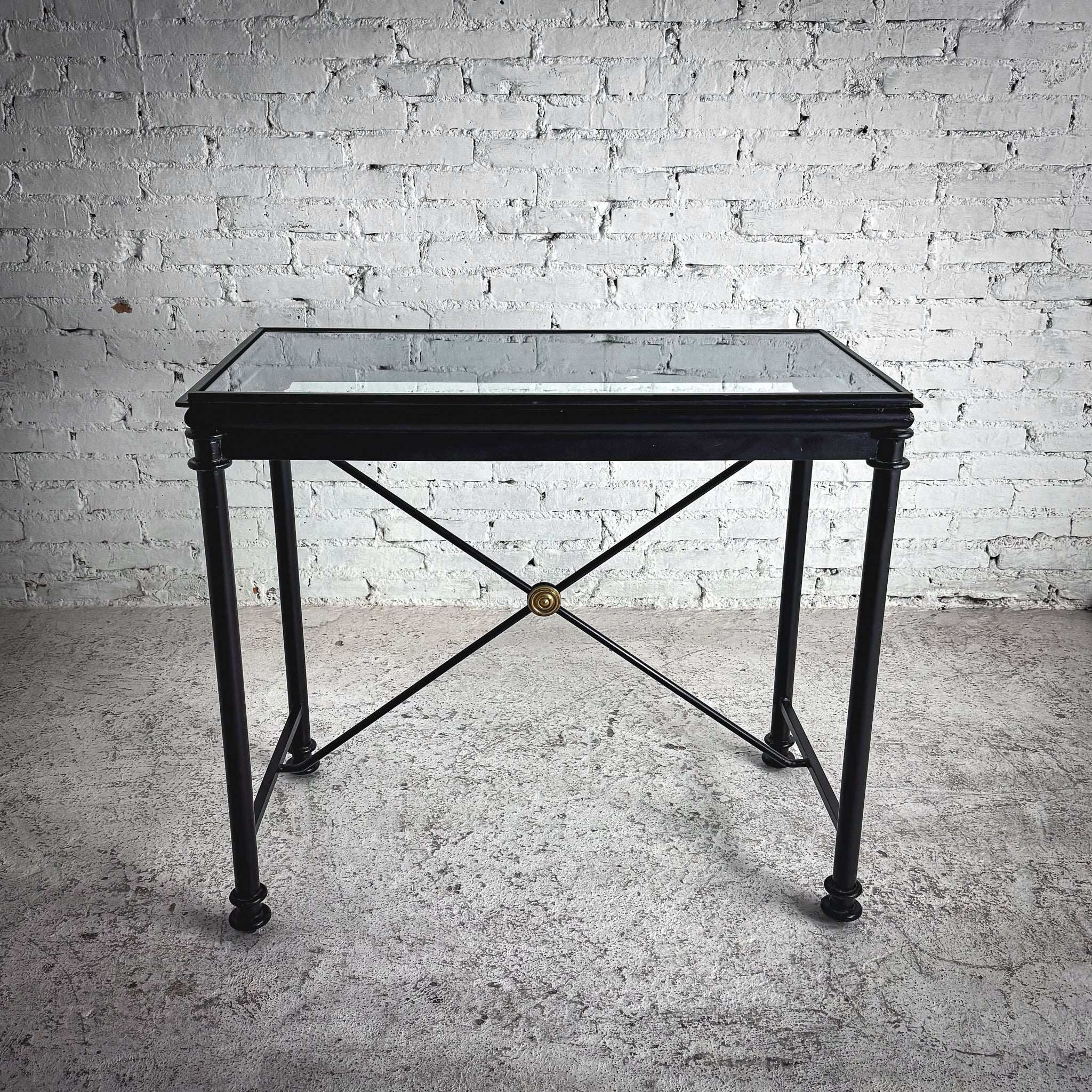 Console. Neoclassical-style black metal console with clear glass top and X-stretcher base featuring brass rosette. Matte powder-coat finish.