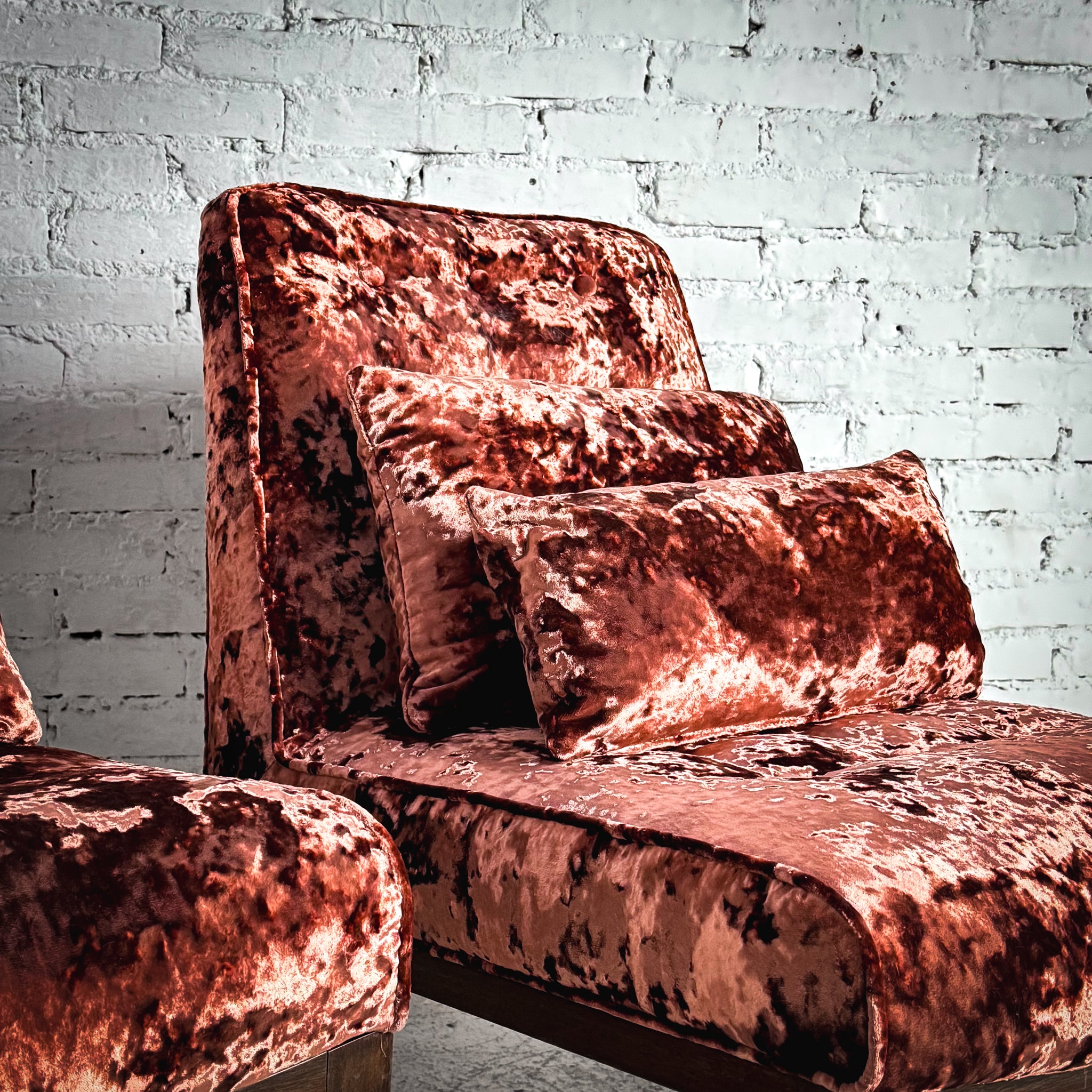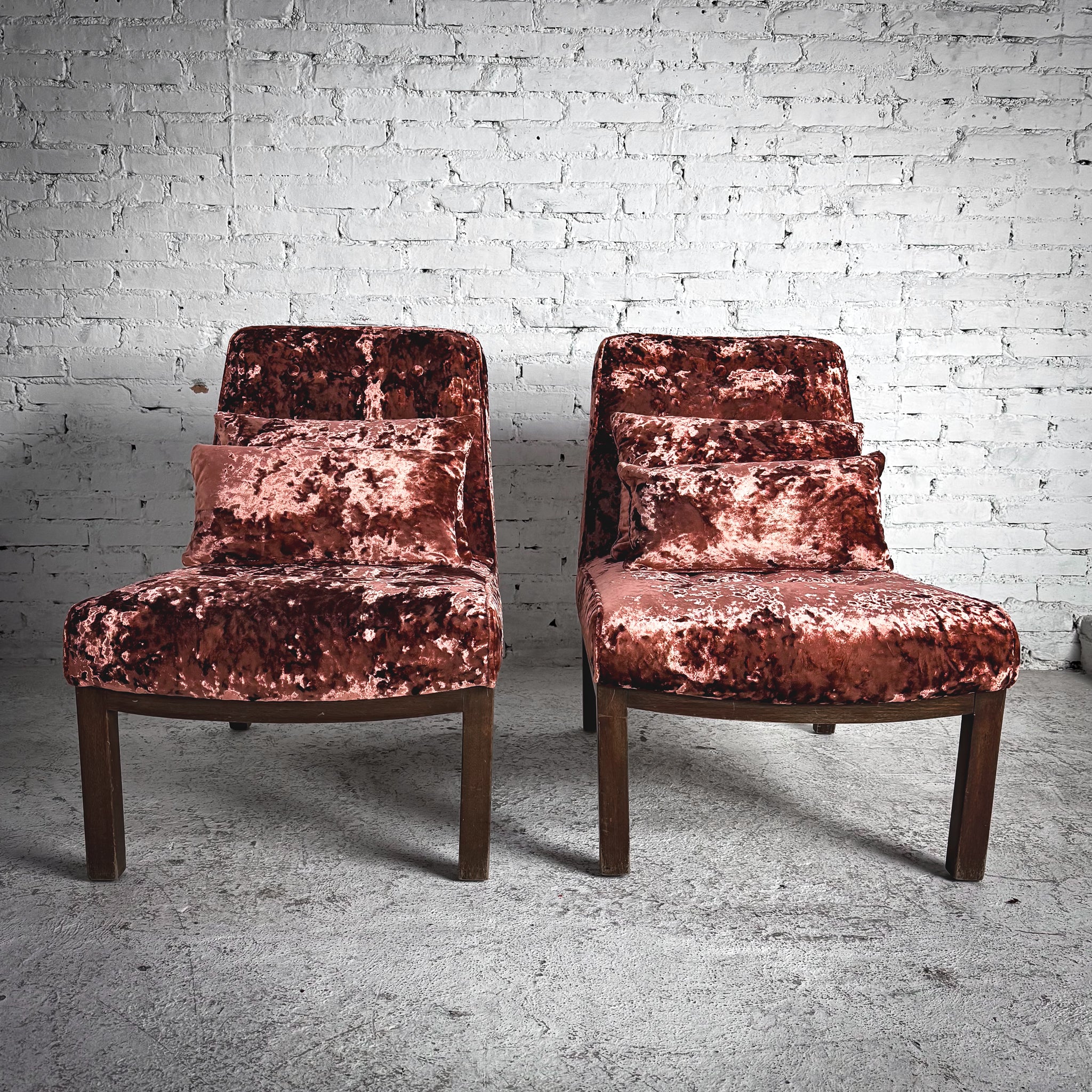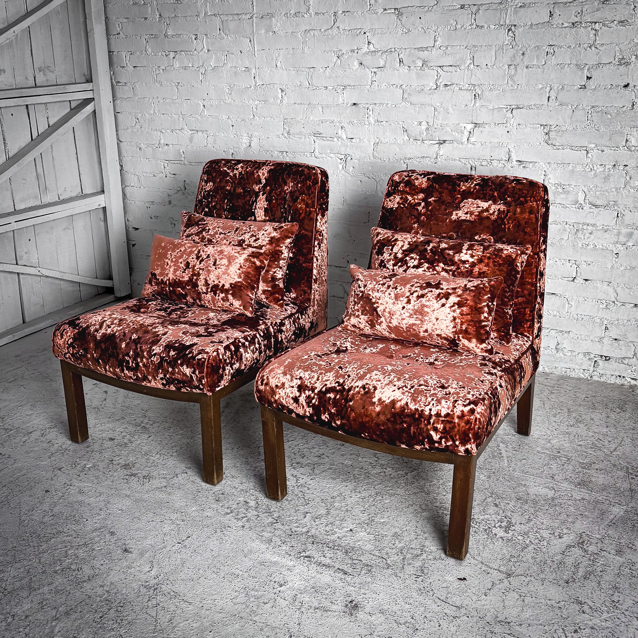 Lounge Chair. Elegant pair of Edward Wormley for Dunbar slipper chairs, Mod. 5000A (1950s), w/ crushed rose velvet upholstery, matching pillows,solid mahogany bases, & original brass labels. Compare @ resale value $7,000 usd ea.
