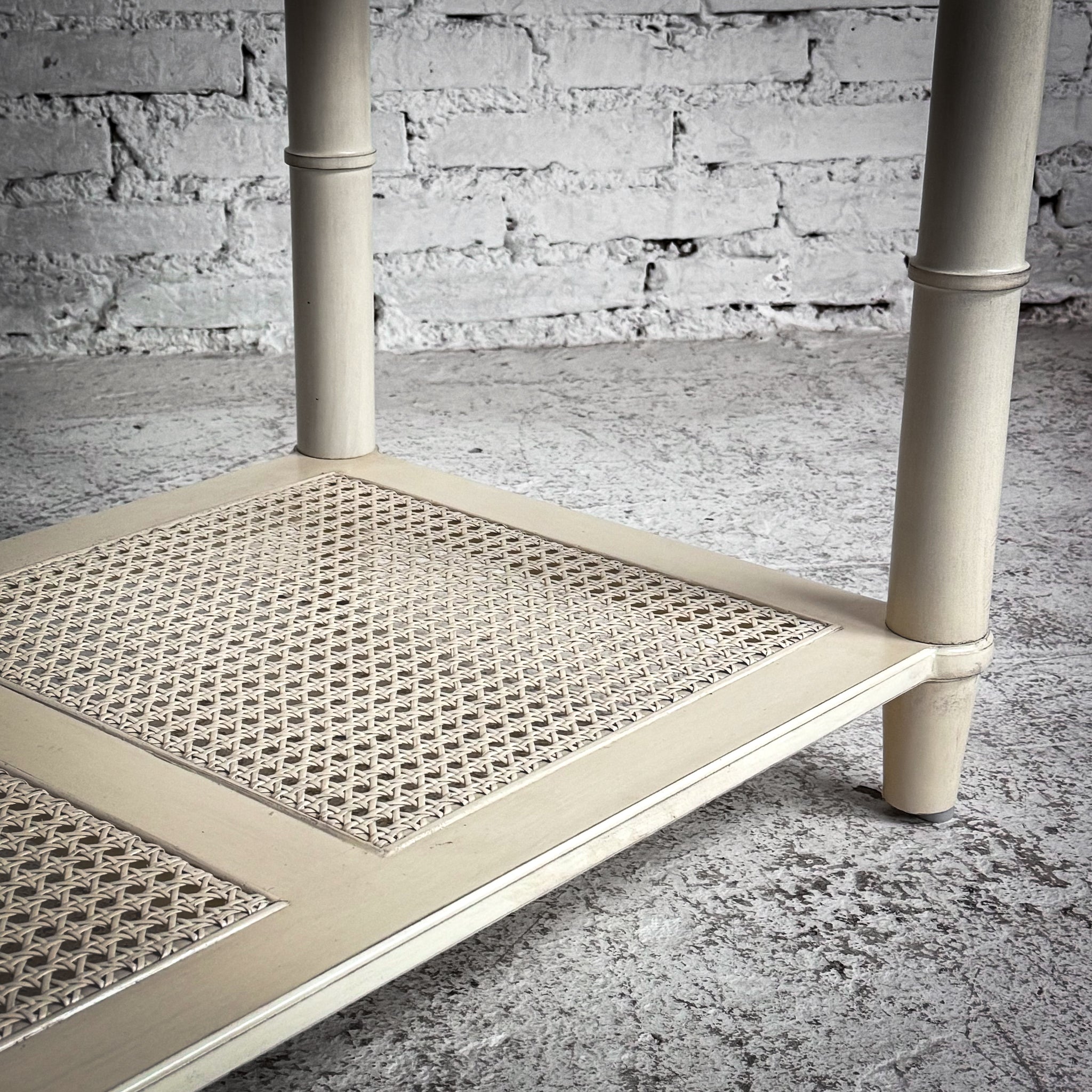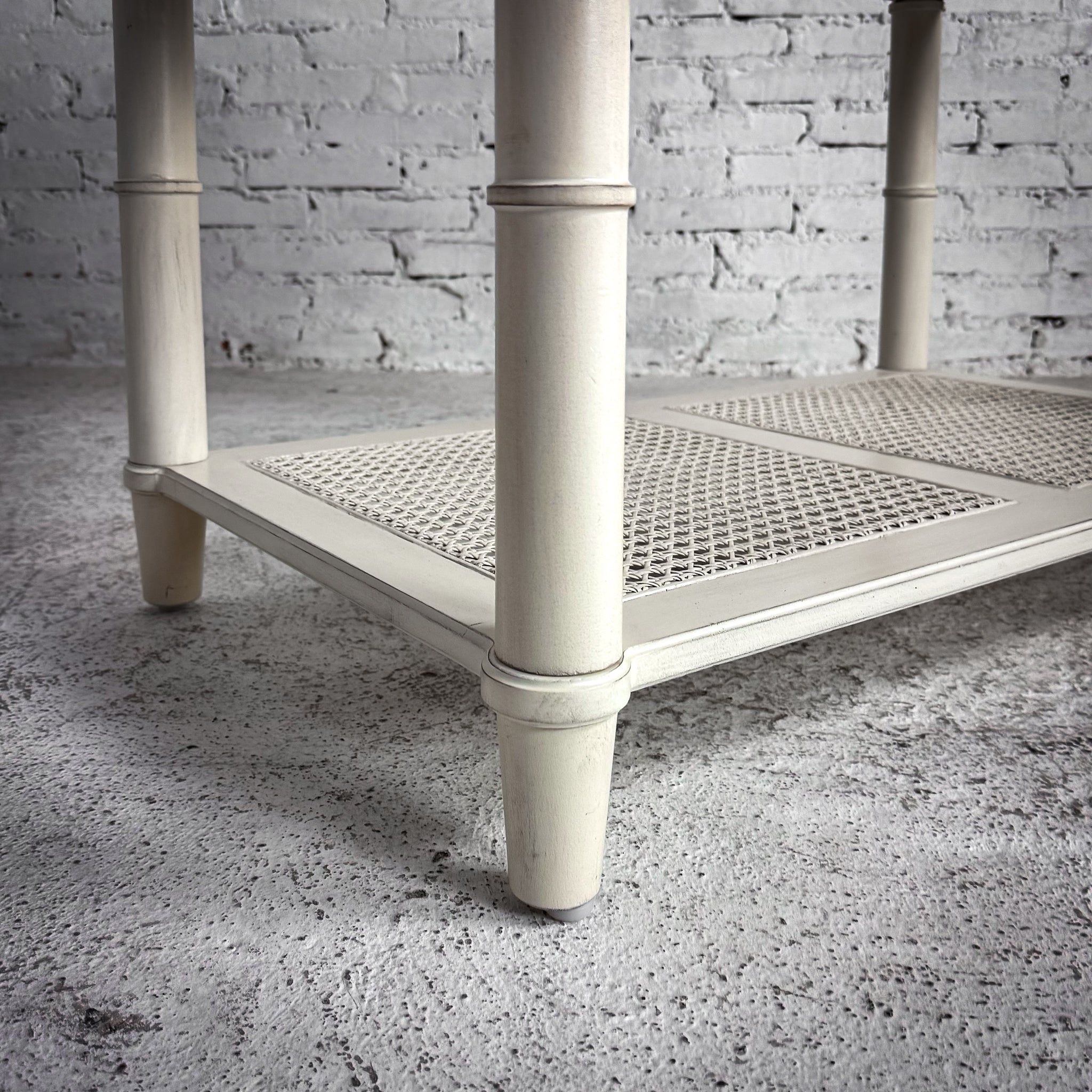 Nightstand. Set of 2. Villandry 1-drawer nightstand in washed linen finish. Crafted of mahogany and fine veneers, w/ lobed coners, a caned shelf beneath and an antique brass knob pull.