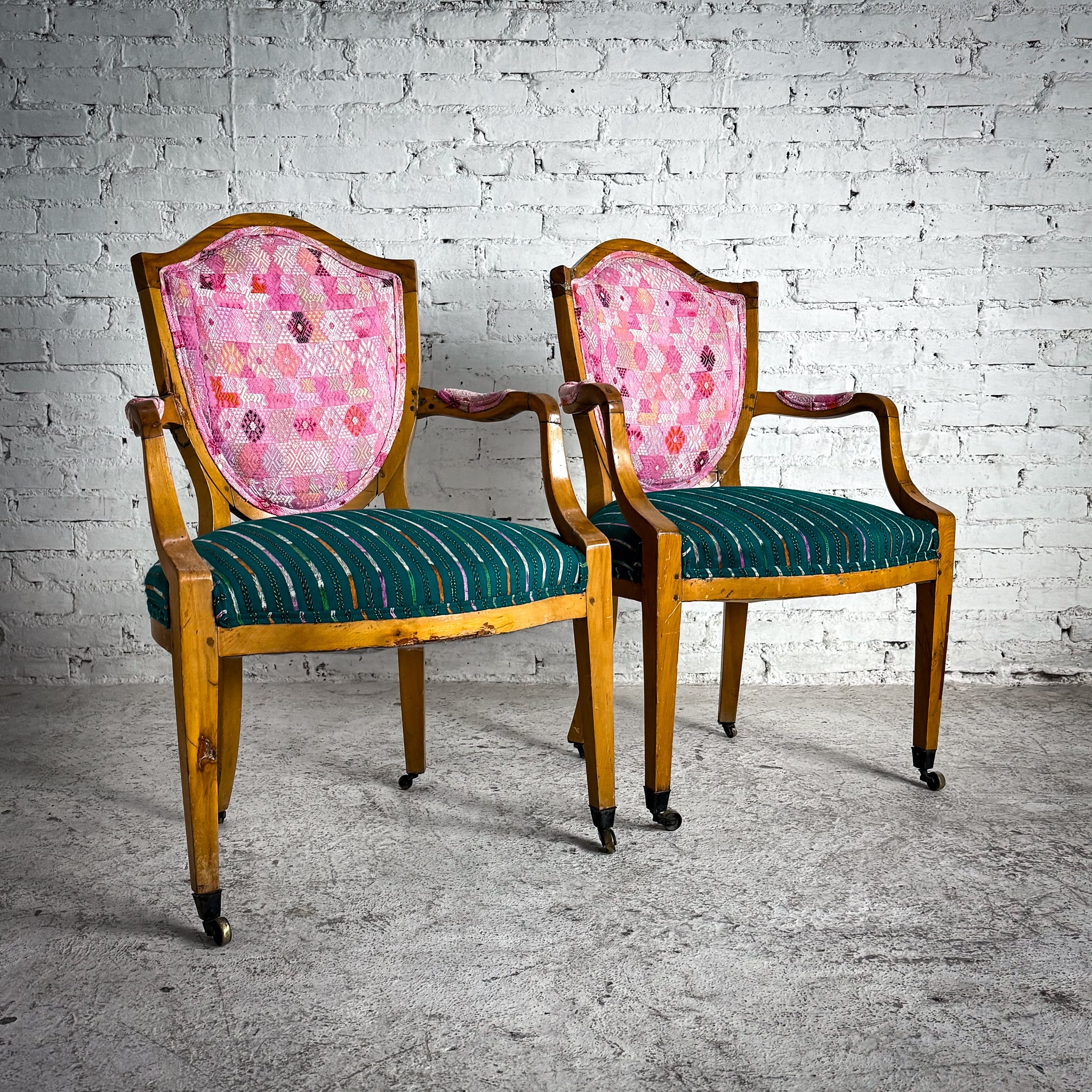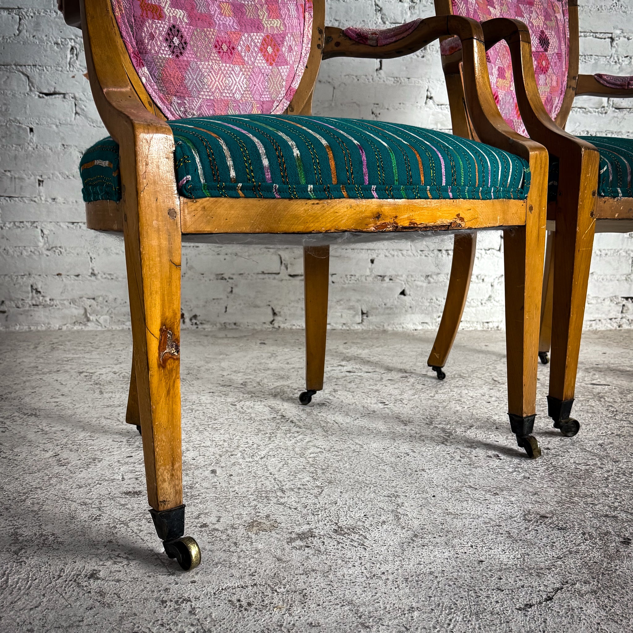 Armchair. Pair of French Louis XVI-style beechwood fauteuils, open arms, straight taper-fluted legs with casters, upholstered seat and back. Visible frame cracking and finish wear.