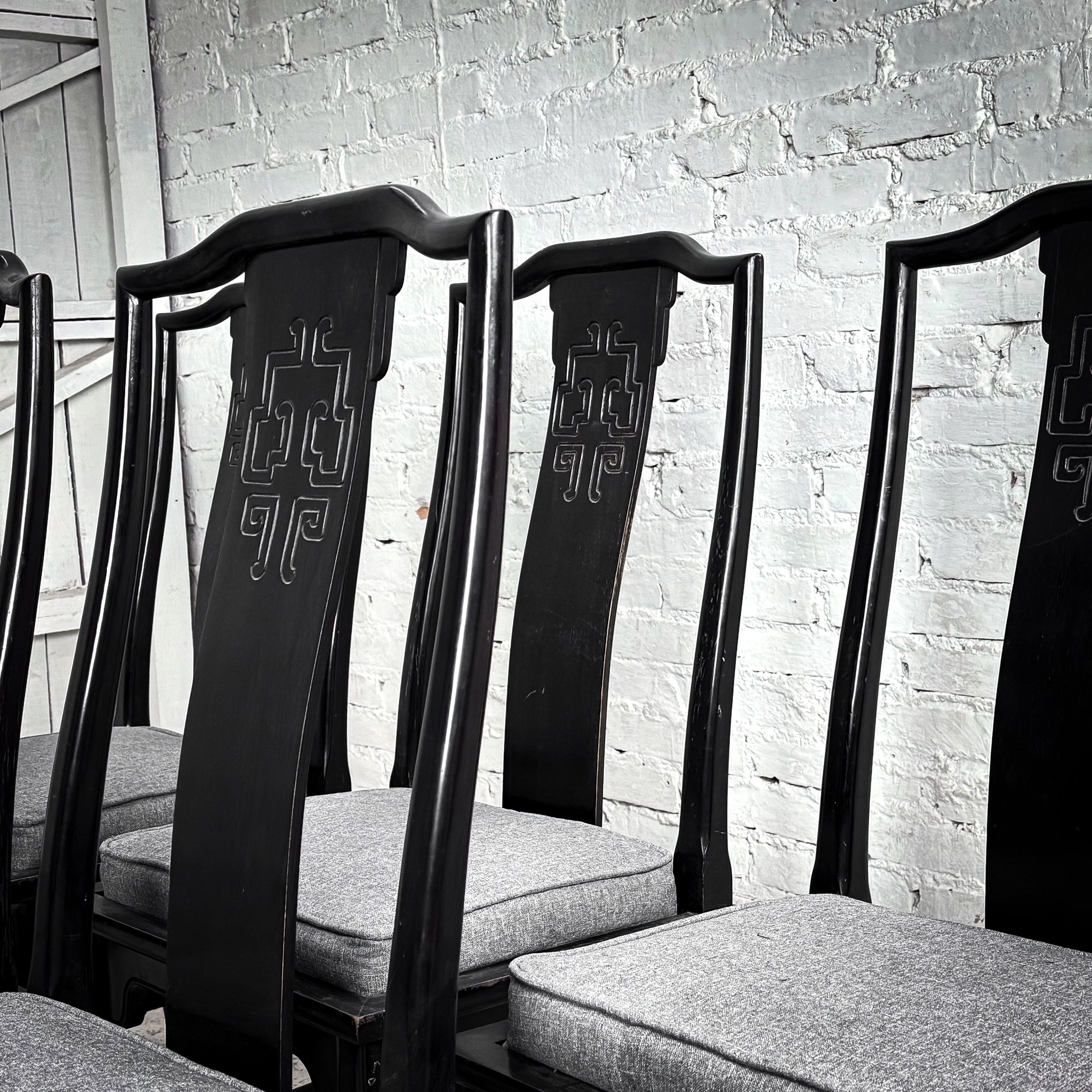 Dining Chair. Set of 5 Century Furniture ebonized wood dining chairs (Chin Hua Collection): carved Asian fretwork backs, curved crest rails, and upholstered seats.