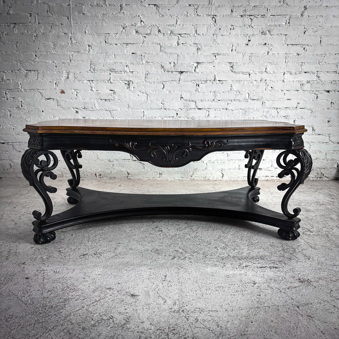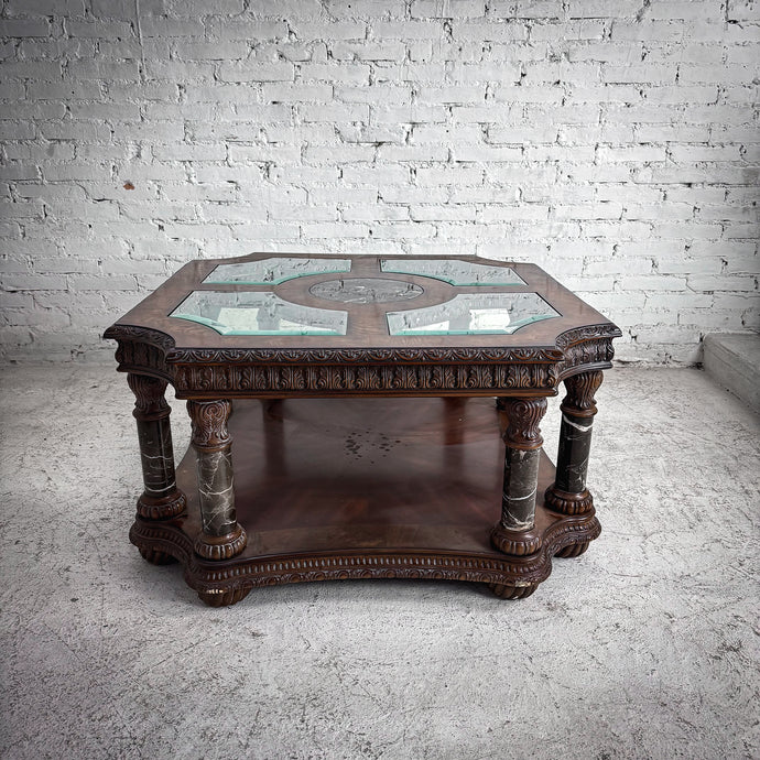 Mass Produced Victorian Revival Carved Wood & Marble Cocktail Table