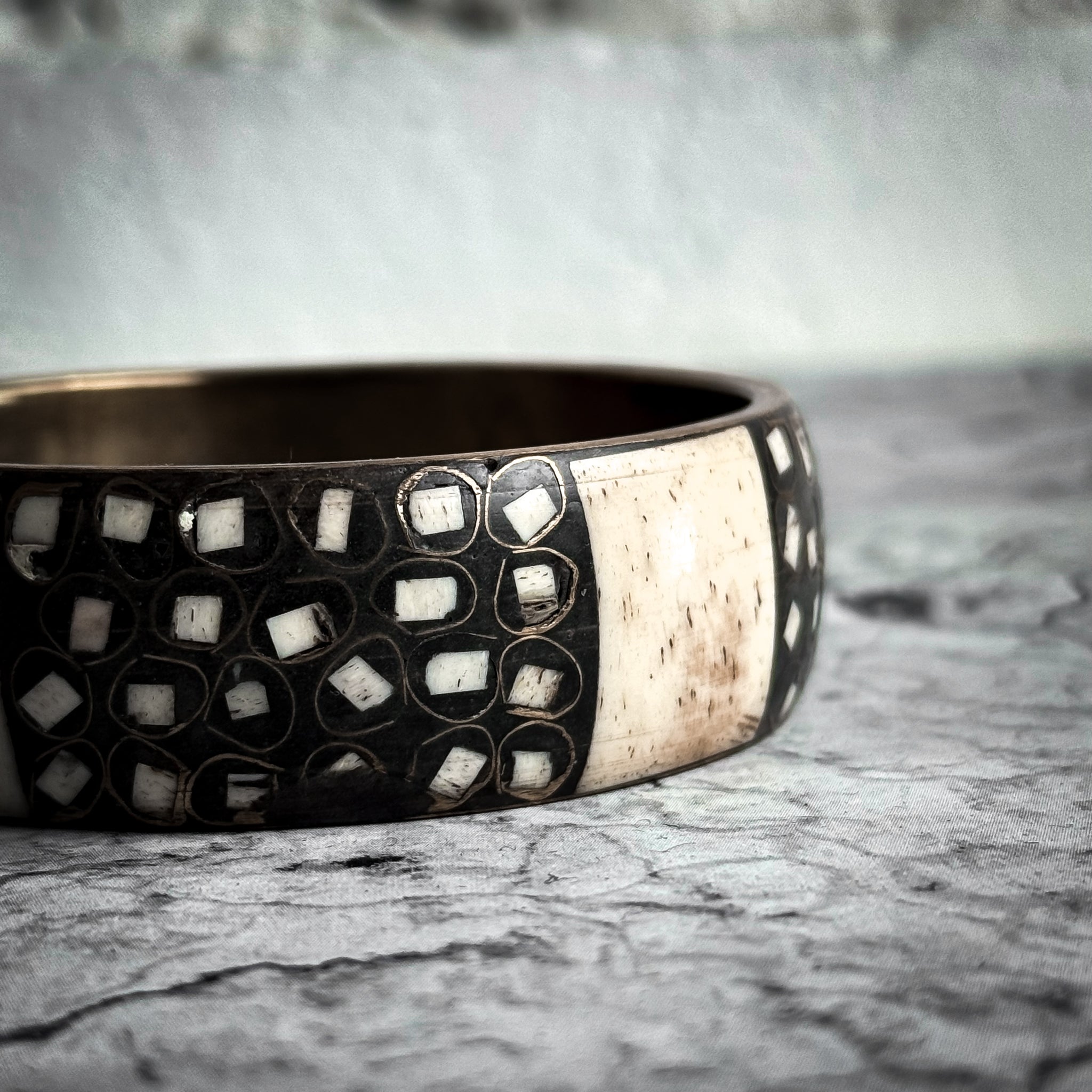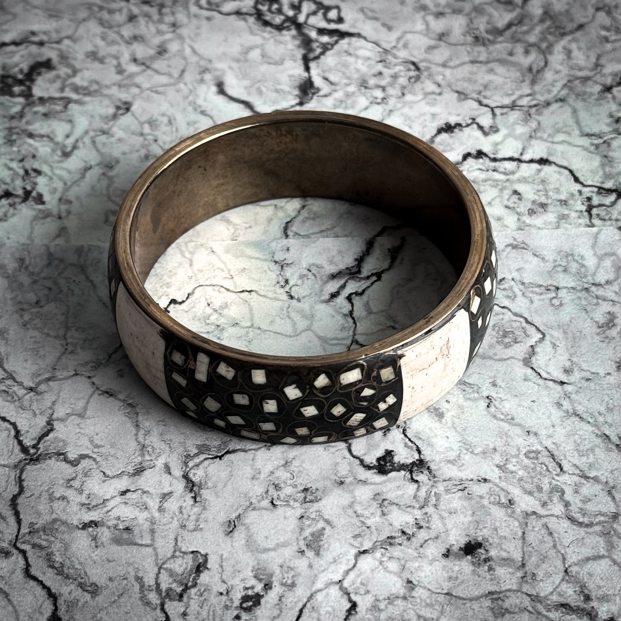 Bangle. Vintage tribal-style brass bangle with bone mosaic inlays and dark resin grid, handmade with bold ethnic-inspired geometric pattern, circa 1970s–90s.