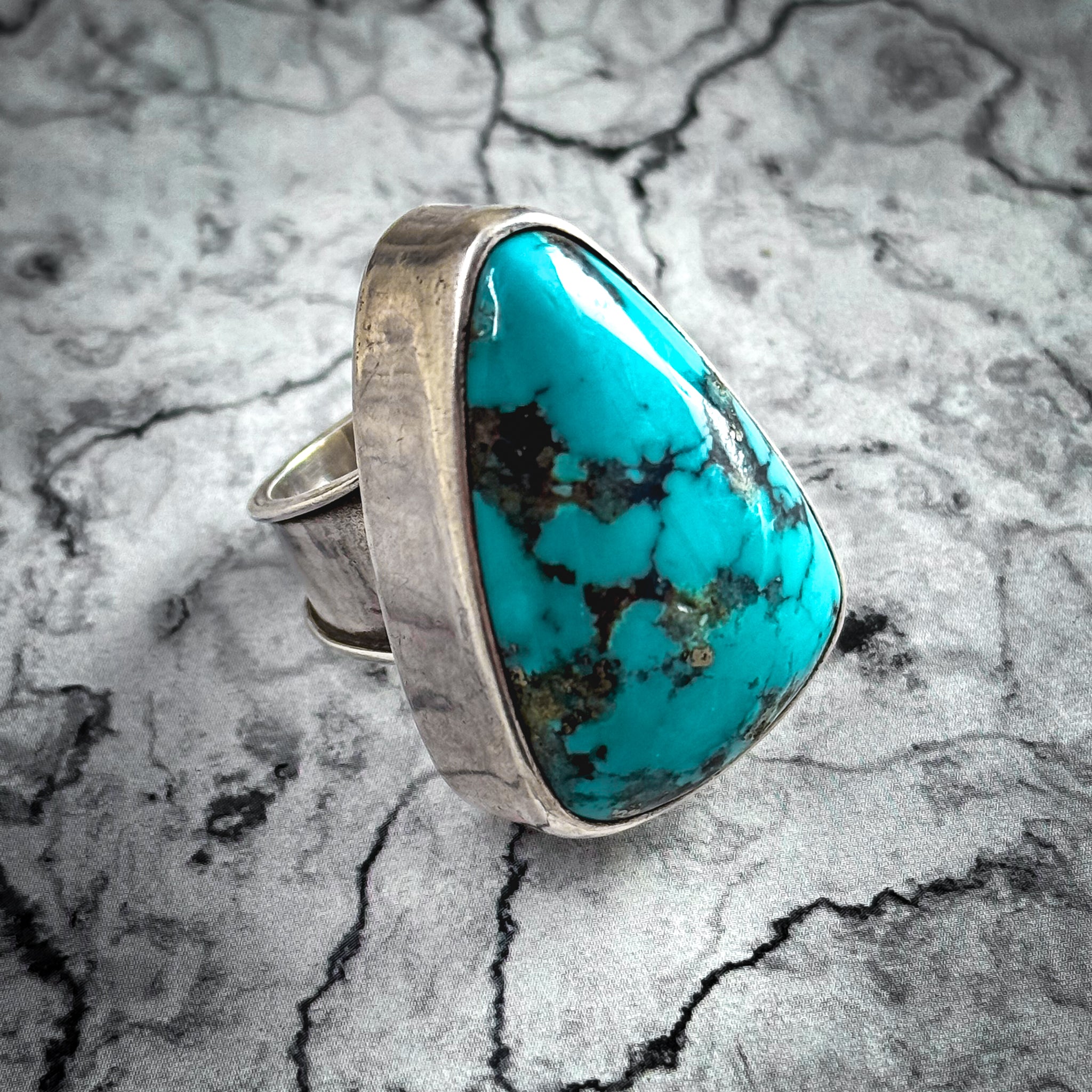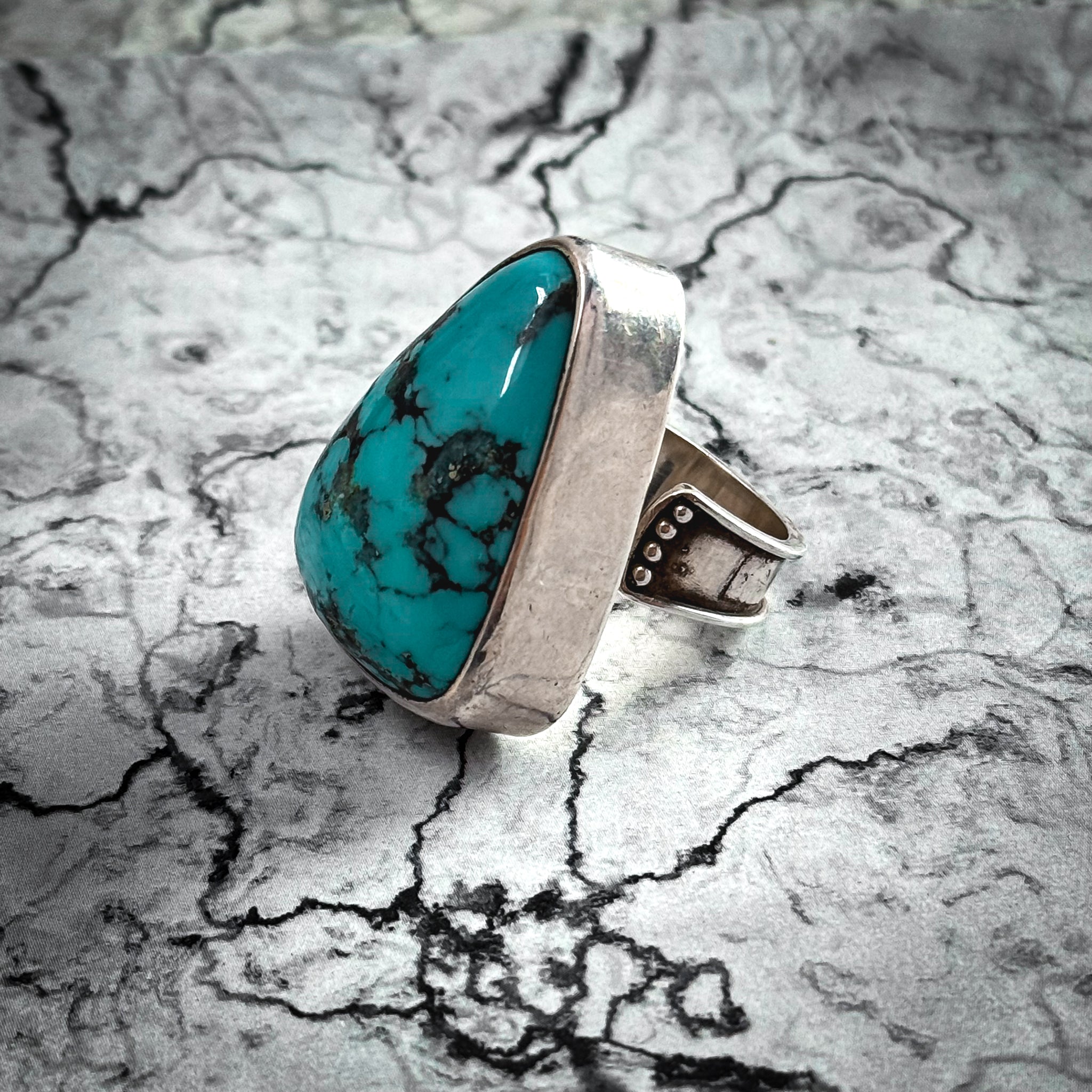 Ring. Large Southwestern sterling silver ring with triangular turquoise cabochon, bold bezel setting and wide band with bead accents and spoon finish, late 20th century artisan.