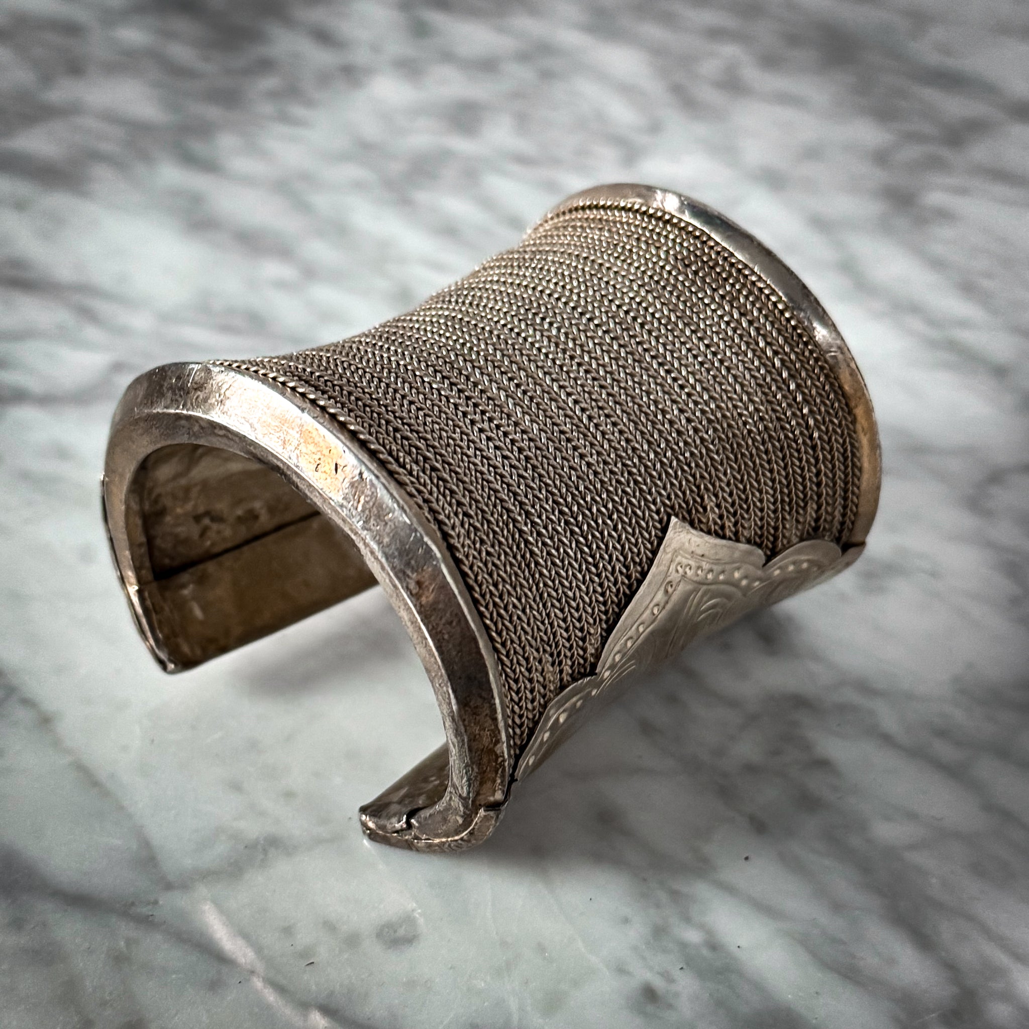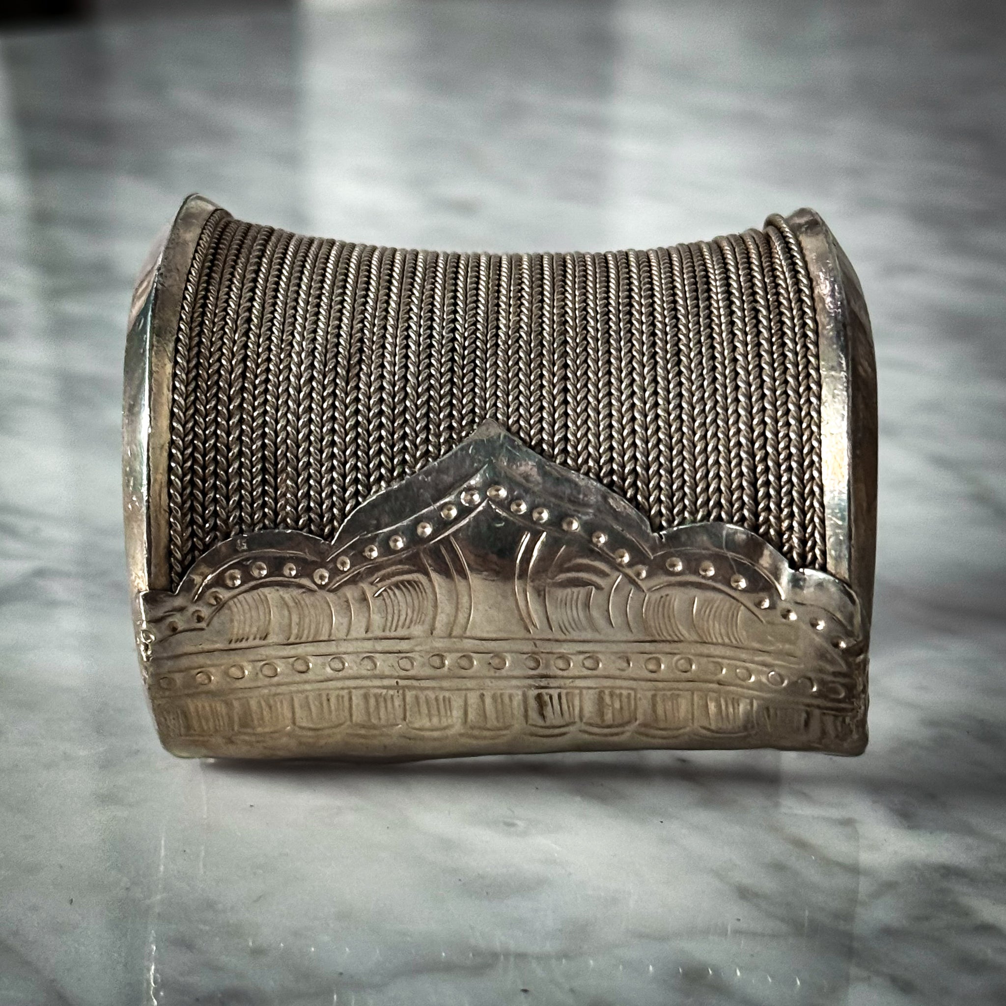 Cuff. Vintage heavy tribal coin silver cuff. Flared form with braided wire-texture exterior and hammered interior. Southeast Asian hill tribe work.