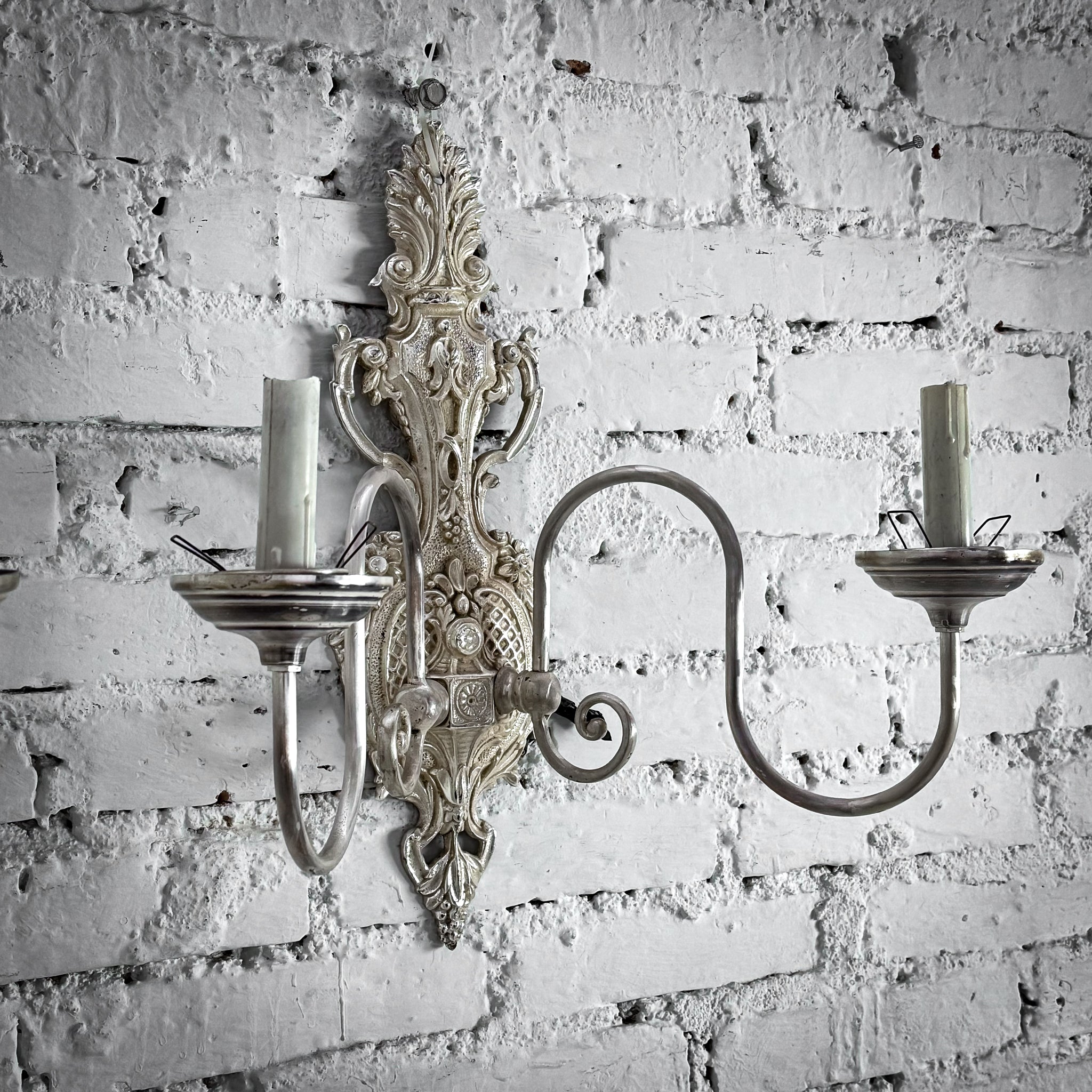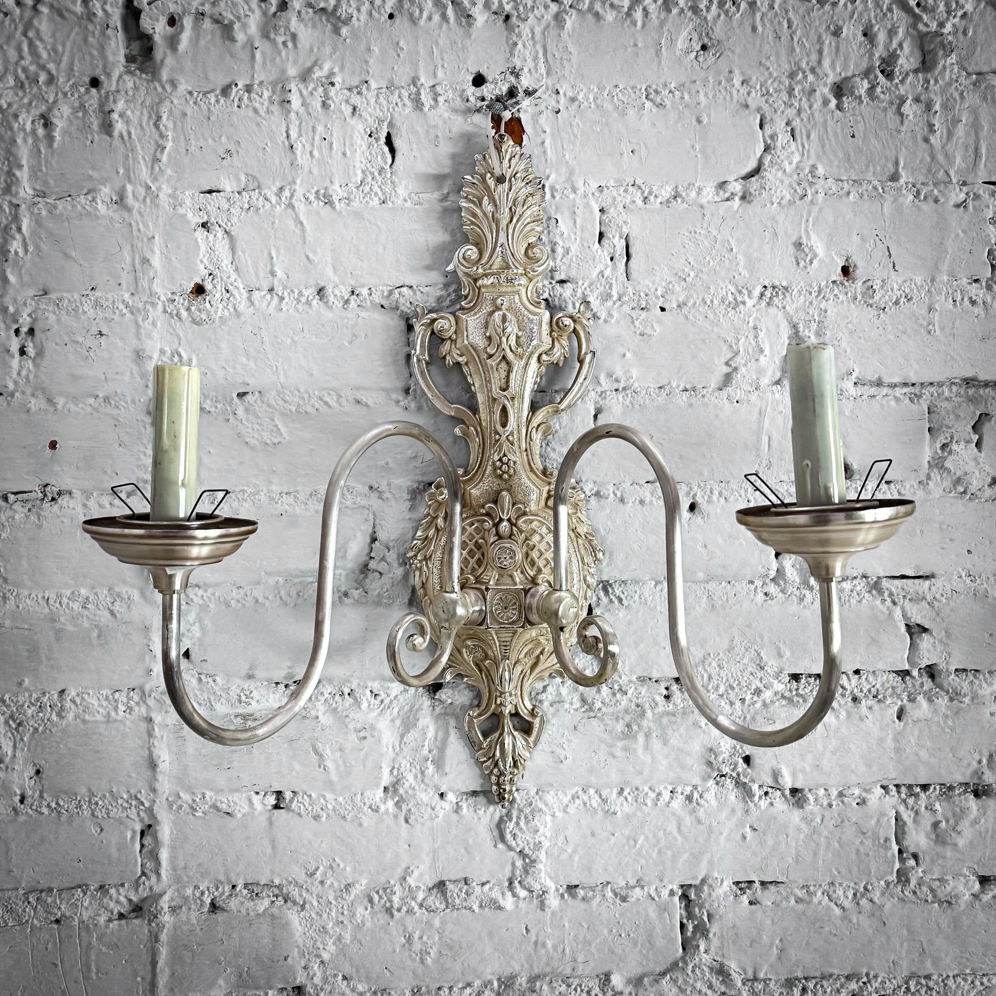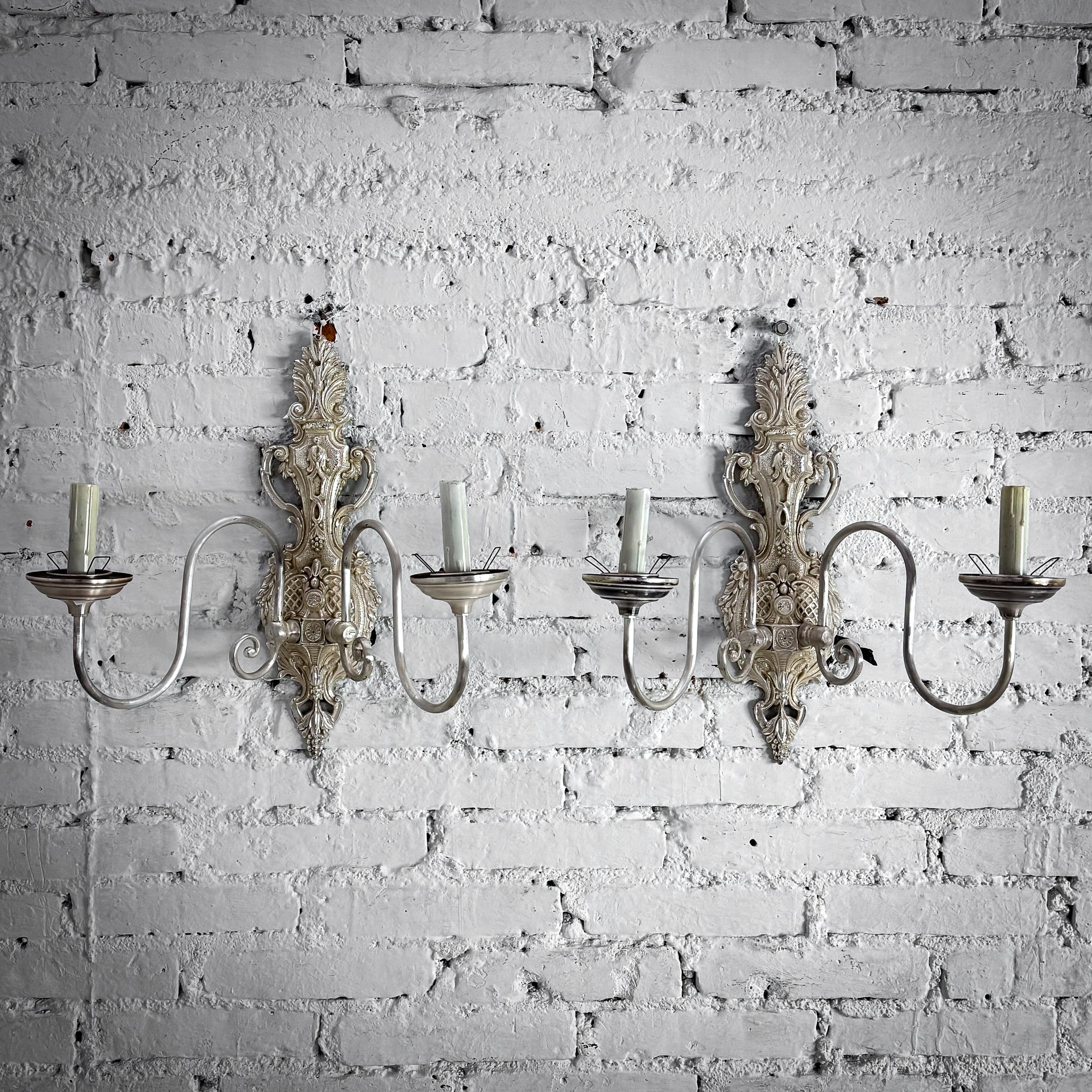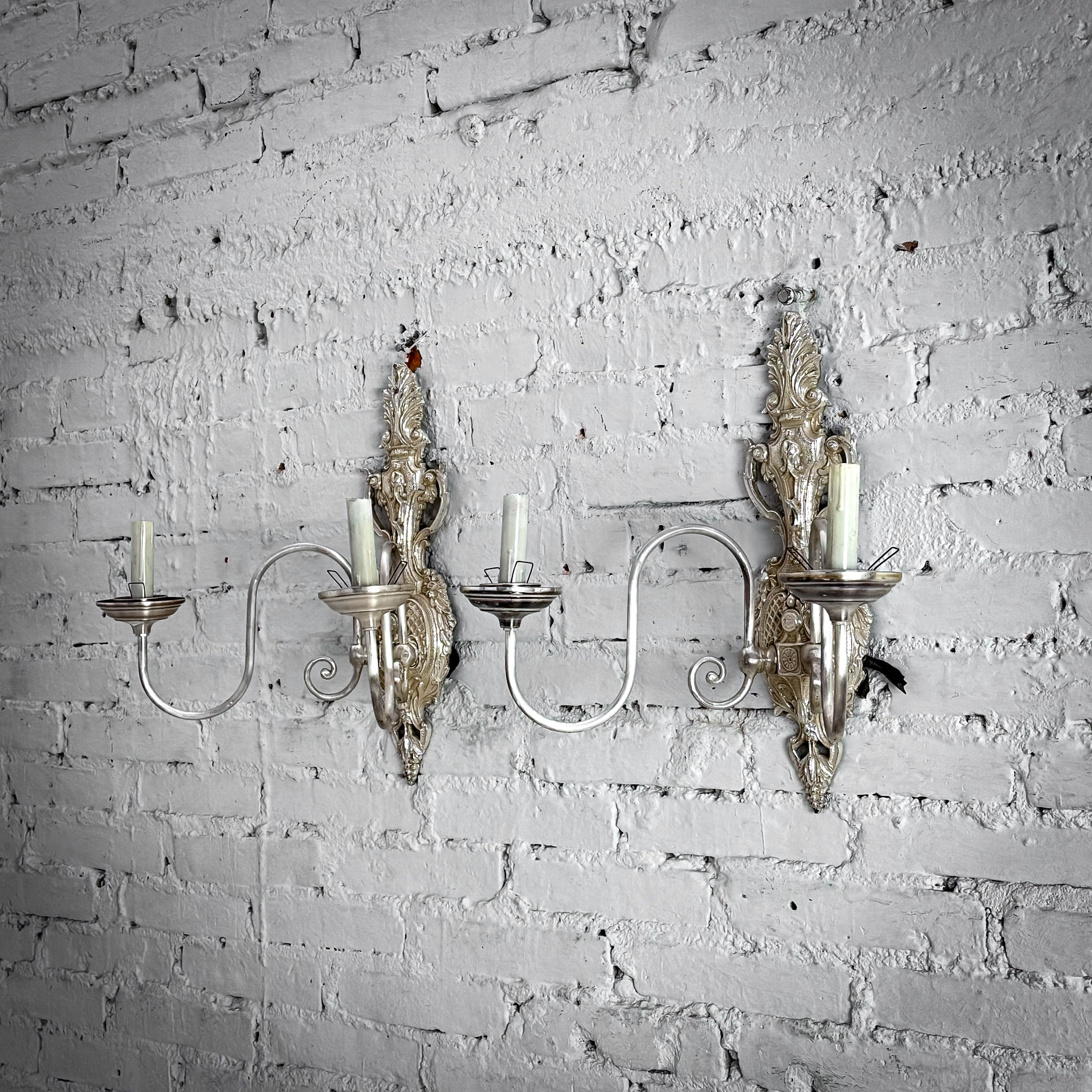 Set of 2 Rococo Revival Nickel Plate Cast Aluminum Flush Mount Sconce