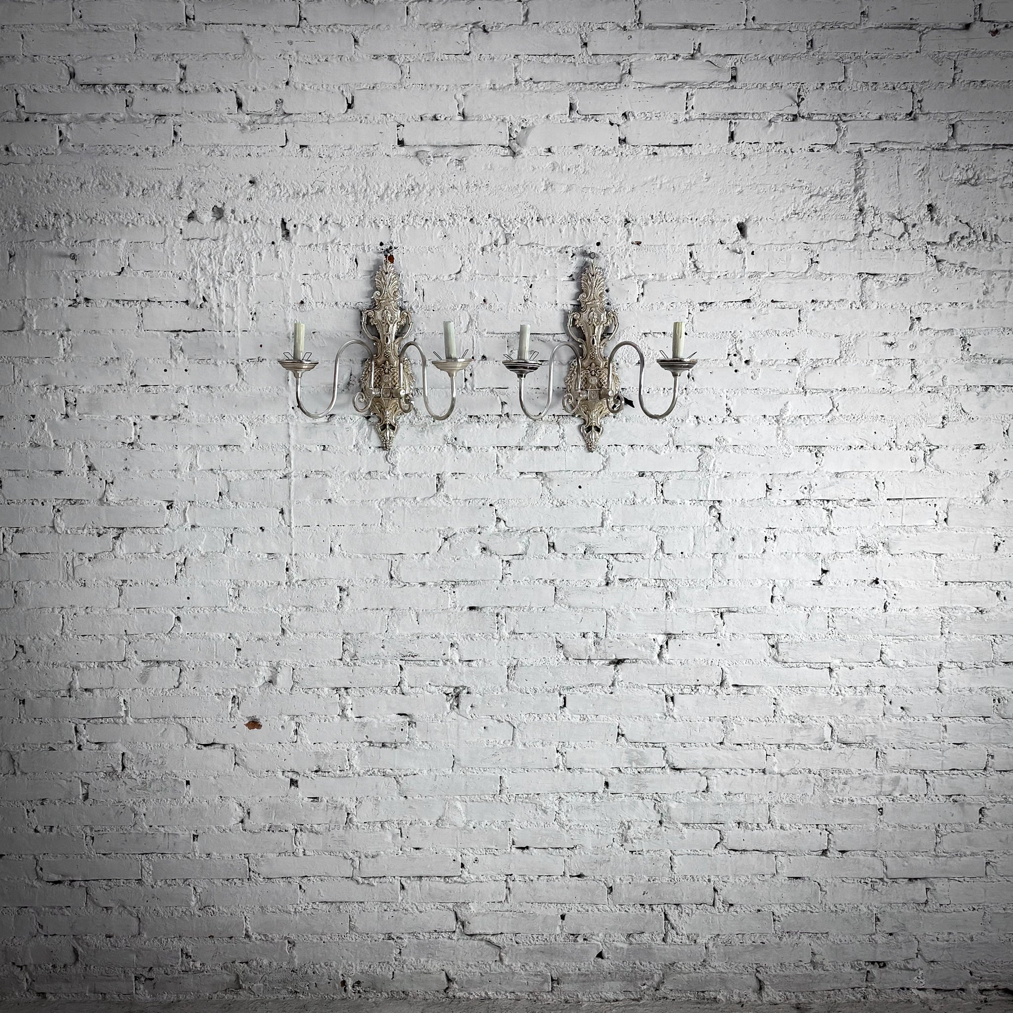 Flush Mount Sconce. Set of 2 Mid-century Rococo-revival two-arm wall sconce in cast aluminium with scrolling acanthus motif and aged gilt finish. Electrified