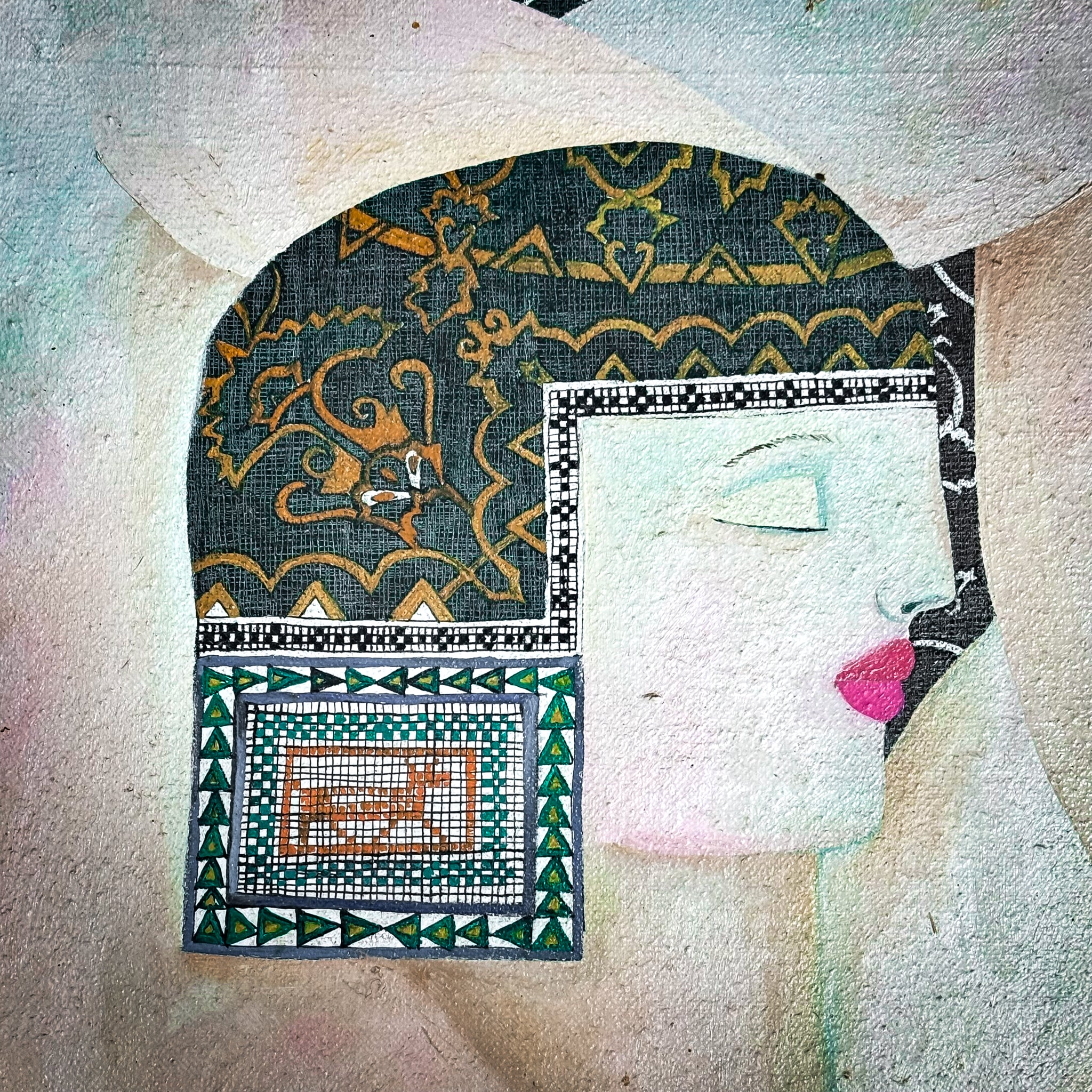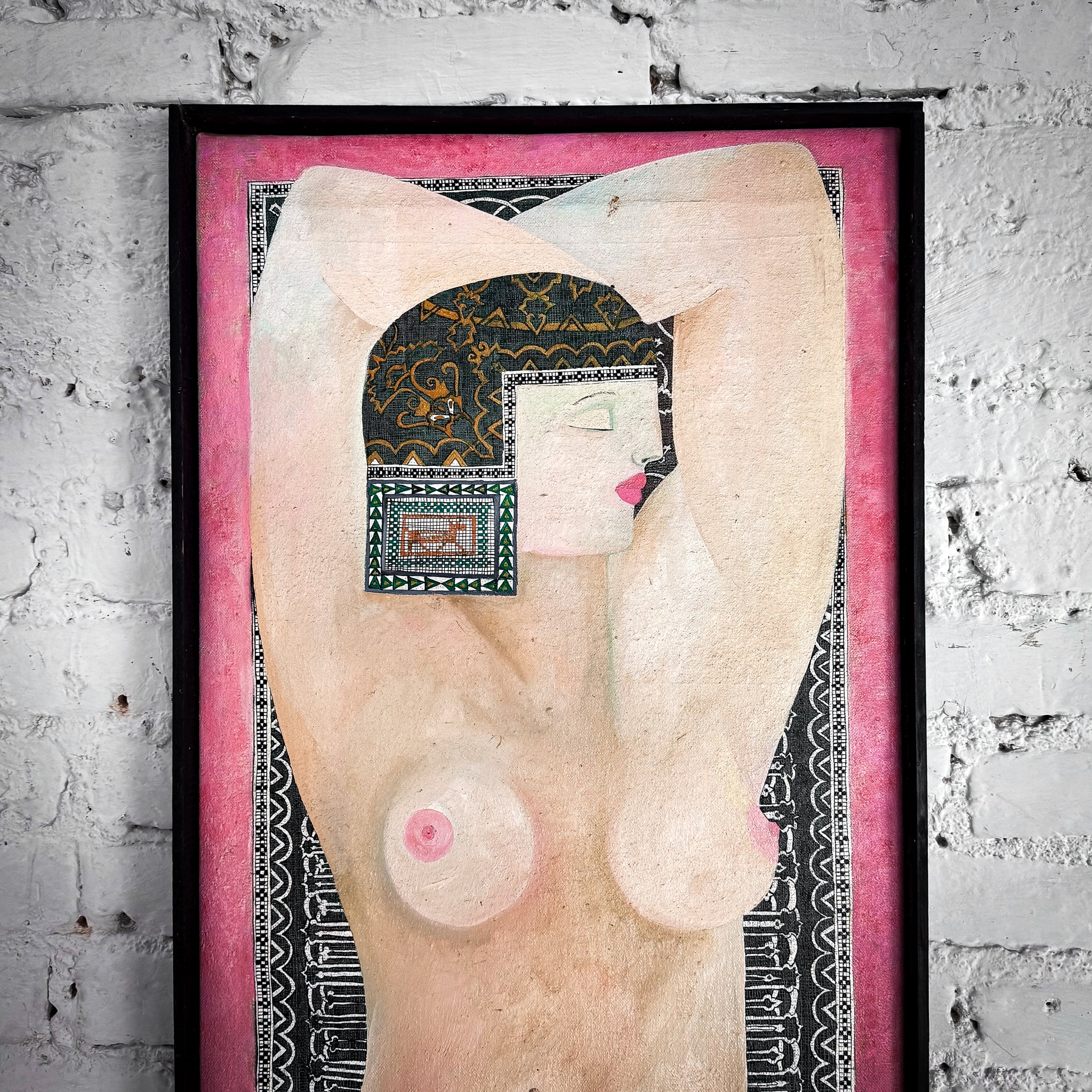 Painting. David Leonardo original painting. Stylized nude female figure with decorative motifs. Black wood frame.