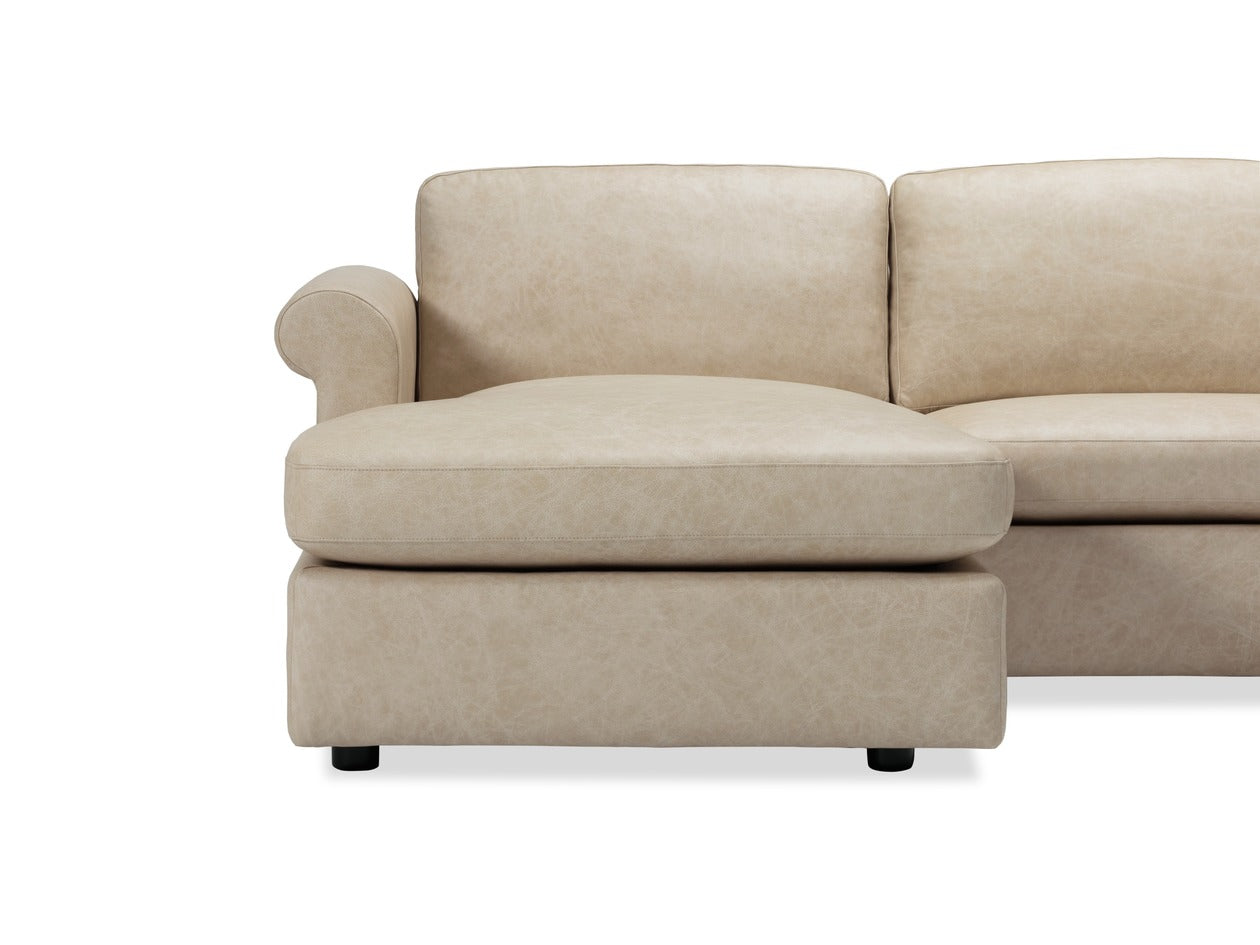 Ensemble Roll Arm 120" Sectional in Appaloosa Cinnamon Leather. Left hand facing chaise, right arm facing sofa.