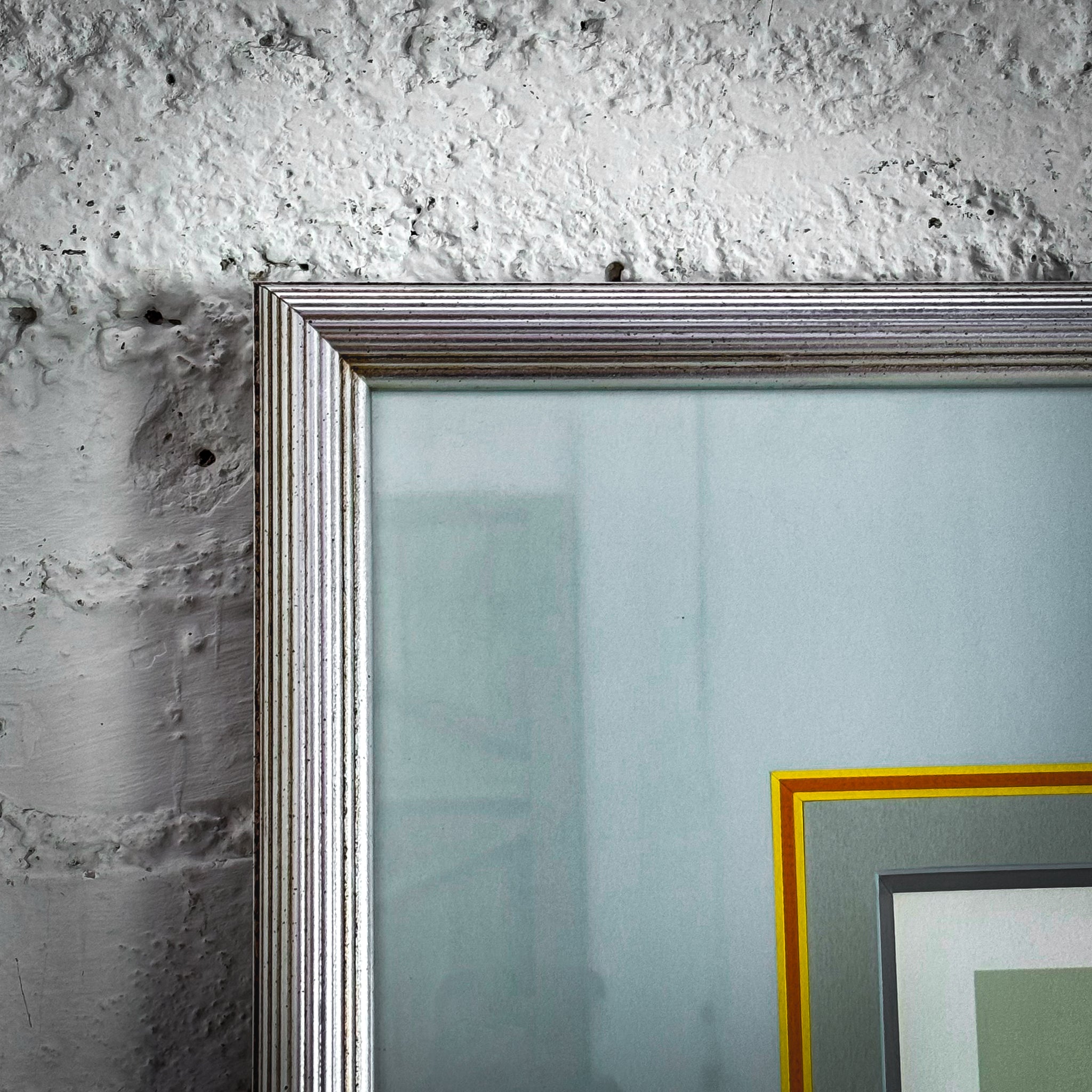 Print. "Resting" by Erté (Romain de Tirtoff) limited edition print, 138/300. Color serigraph on paper. Comprised of a celestial composition of a woman resting on geometric stacked cubes. Silver-tone frame w/ double mat.