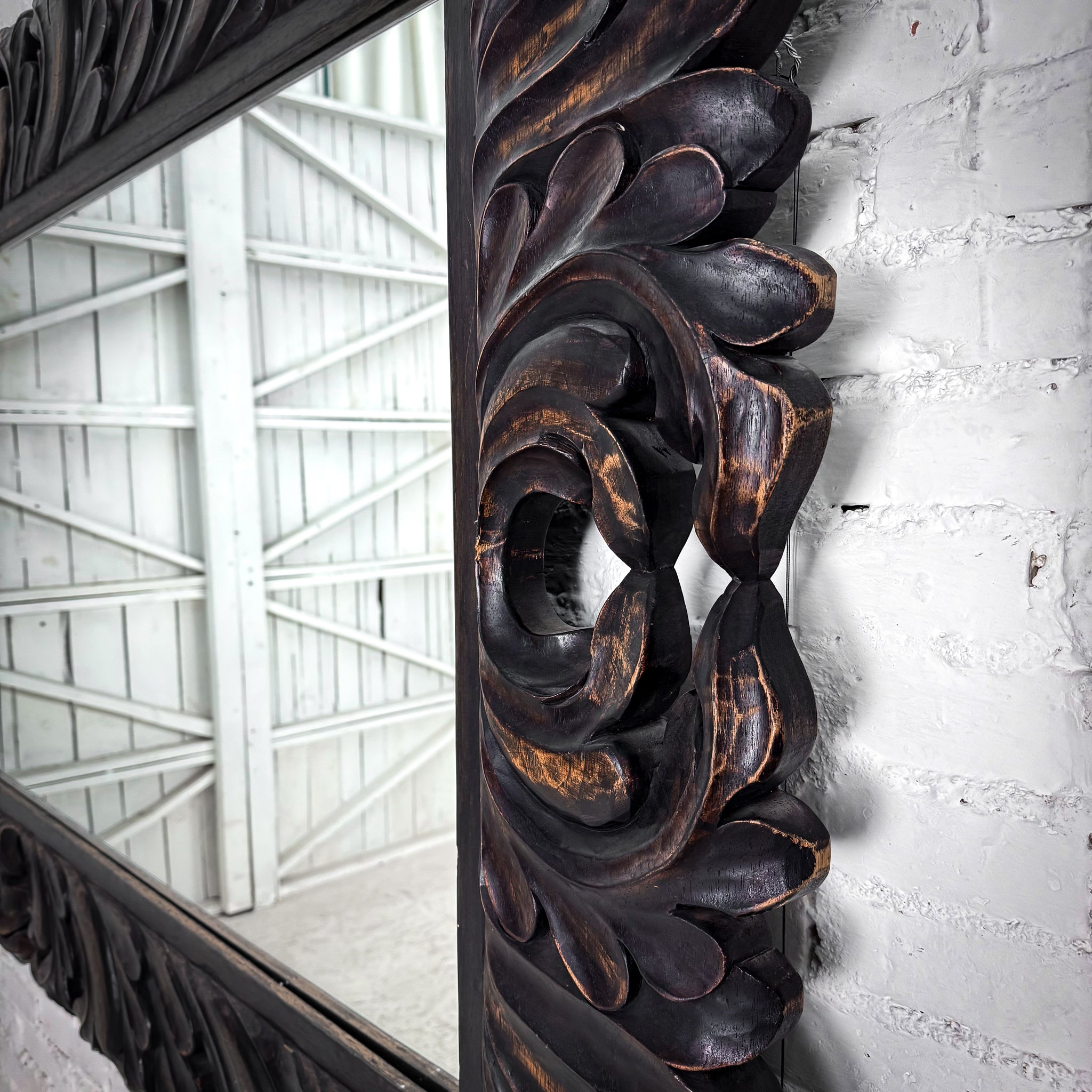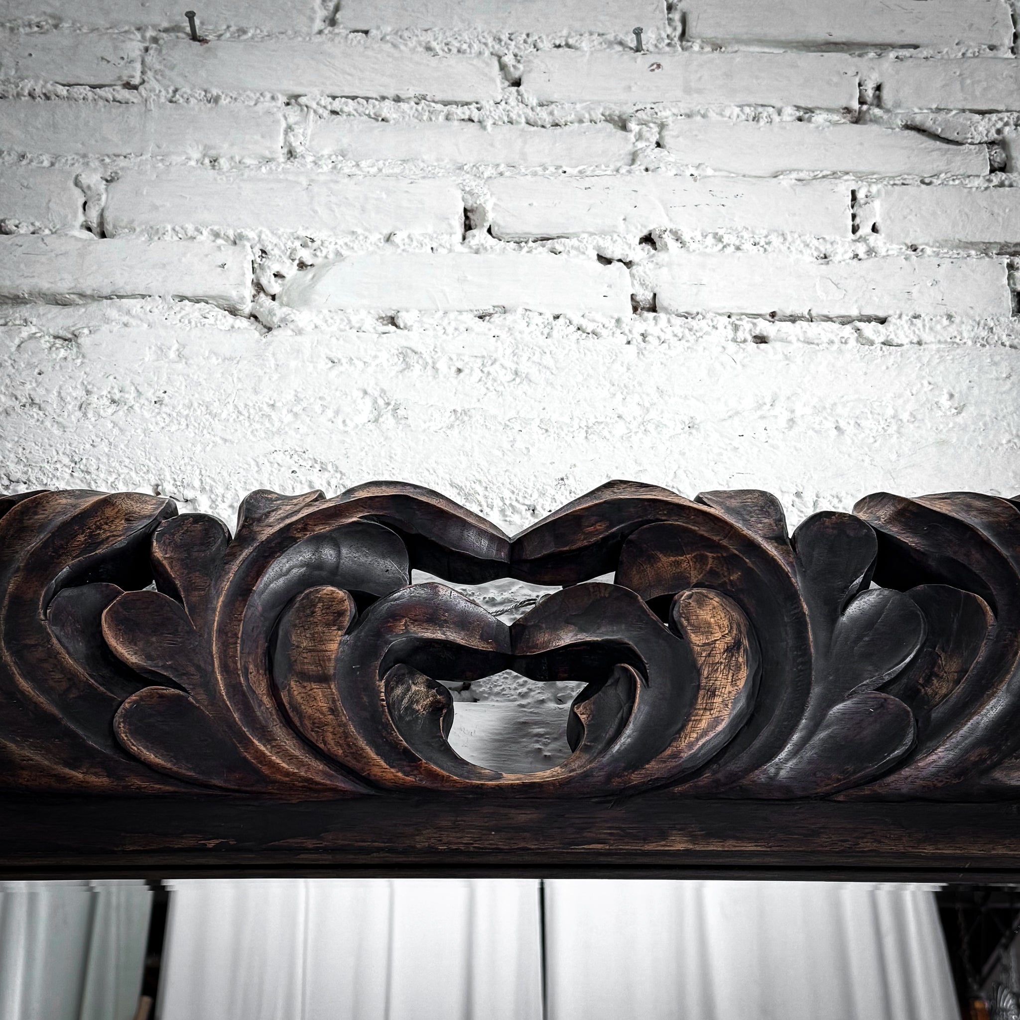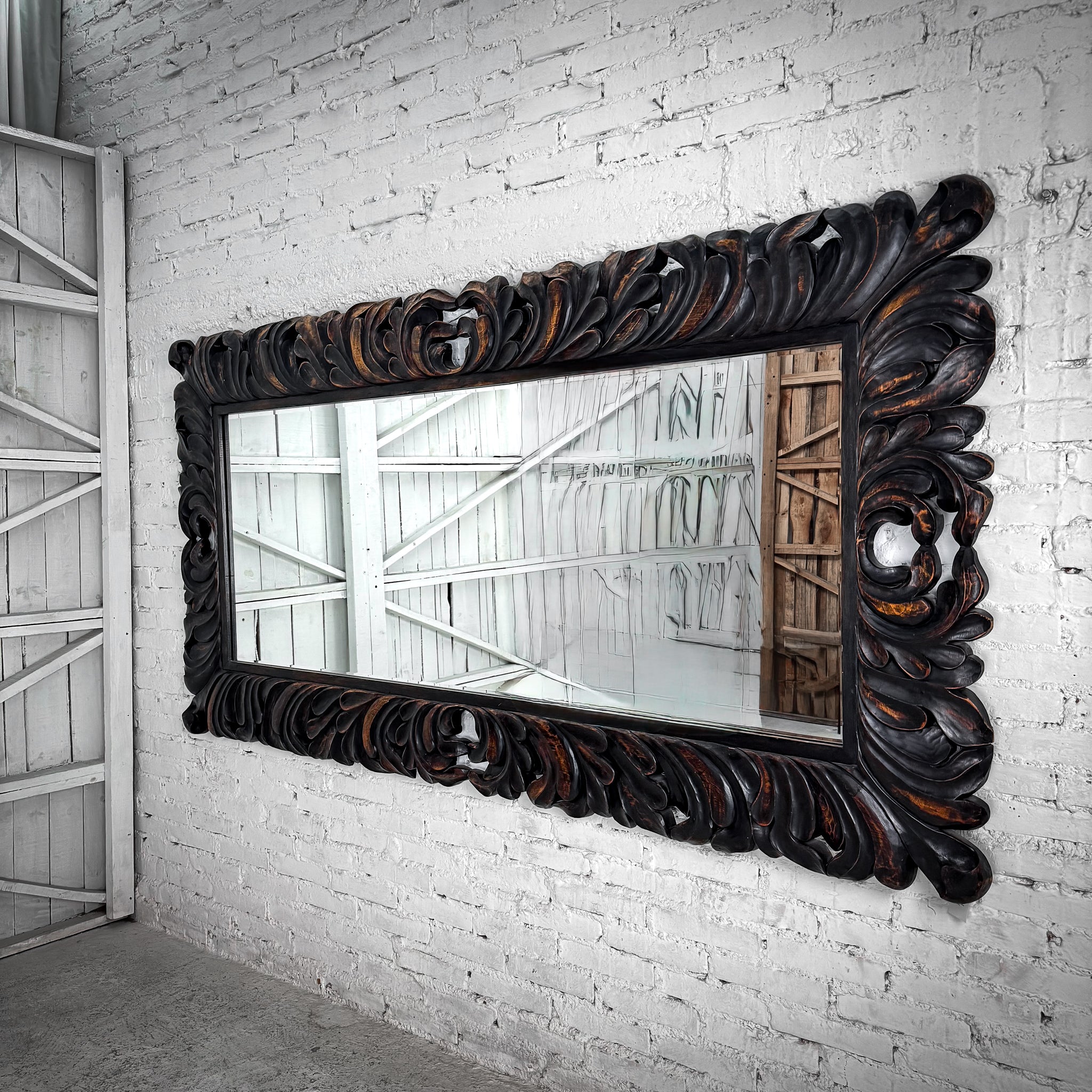 Mirror. Large full length Baroque Revival mirror with hand-carved cedar frame, bold acanthus scroll motifs, and antiqued dark-gold finish.
