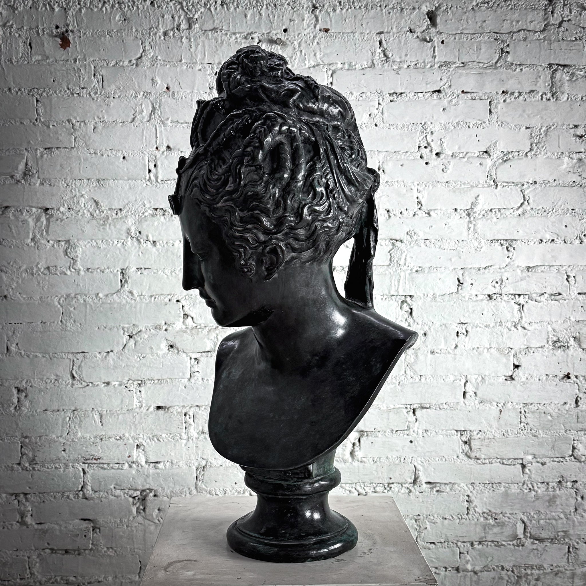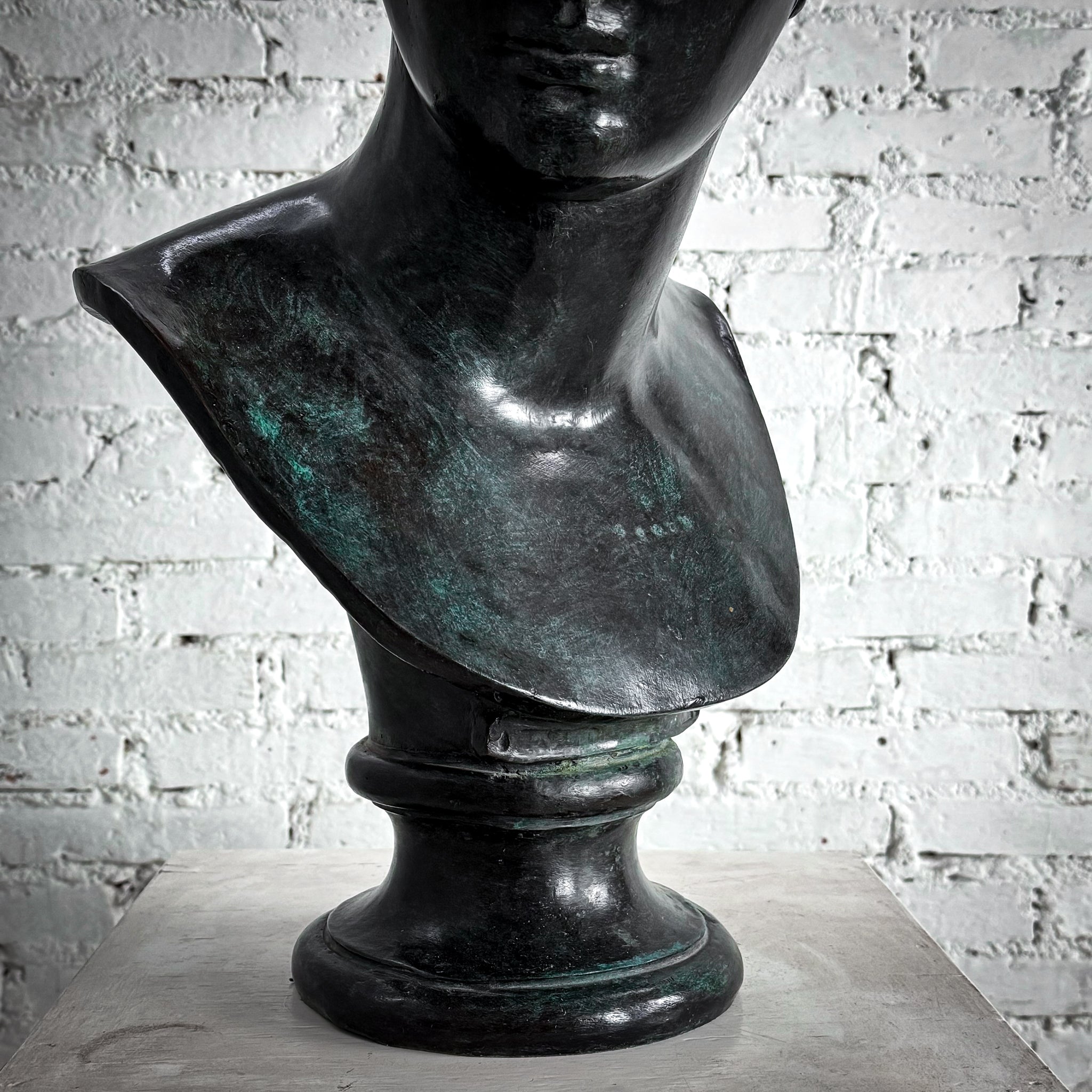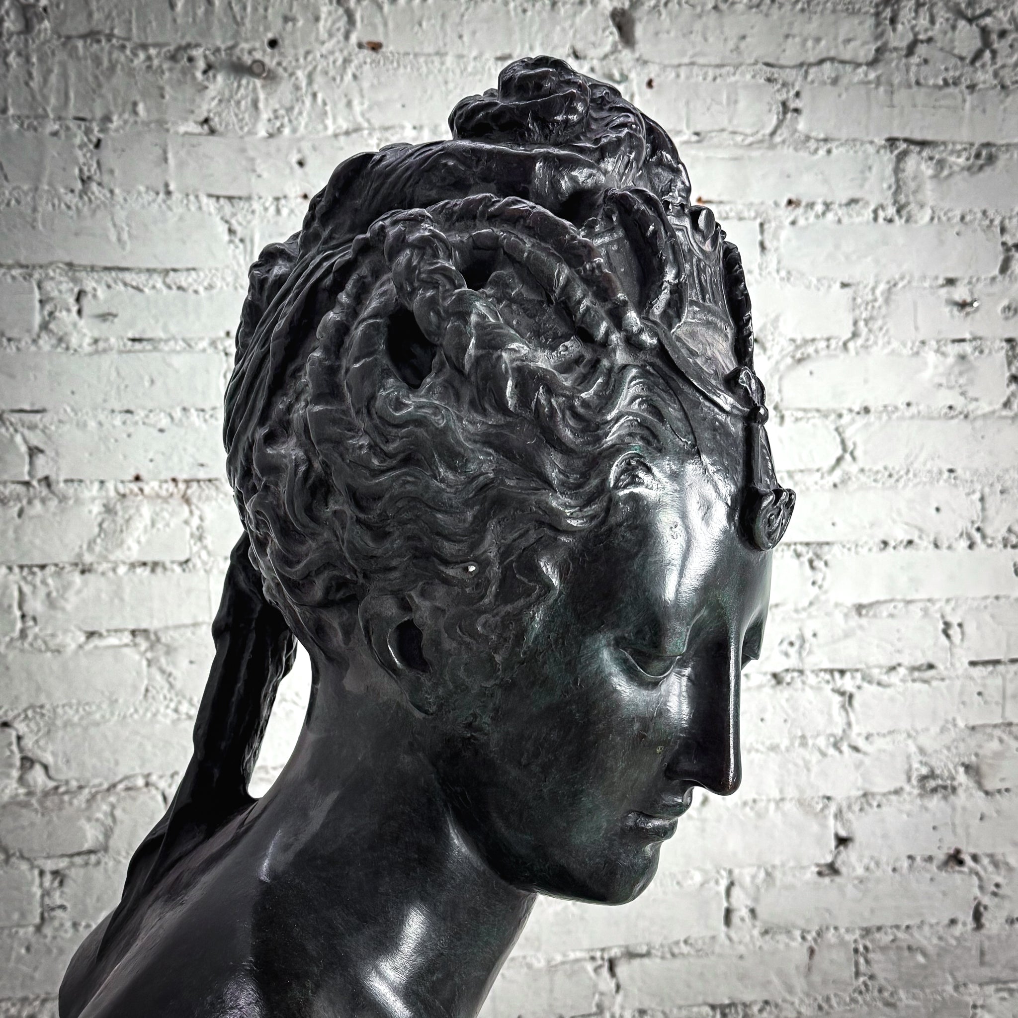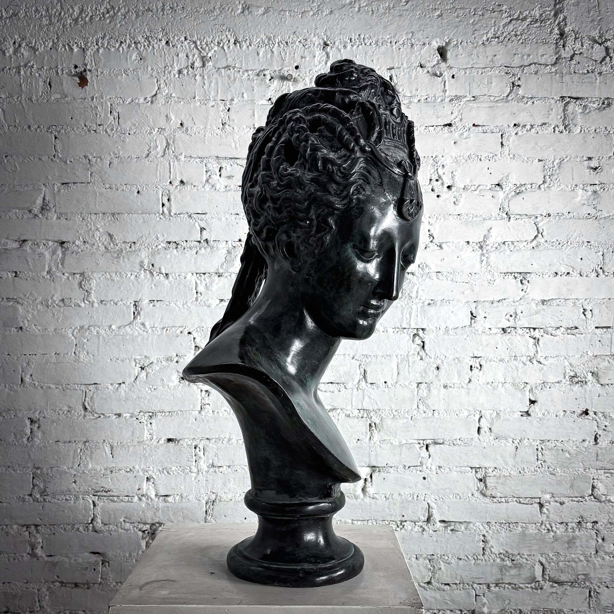 Bronze Sculpture. Monumental Neoclassical revival bronze sculpture bust of a classical woman with lyre headdress and aged verdigris patina.