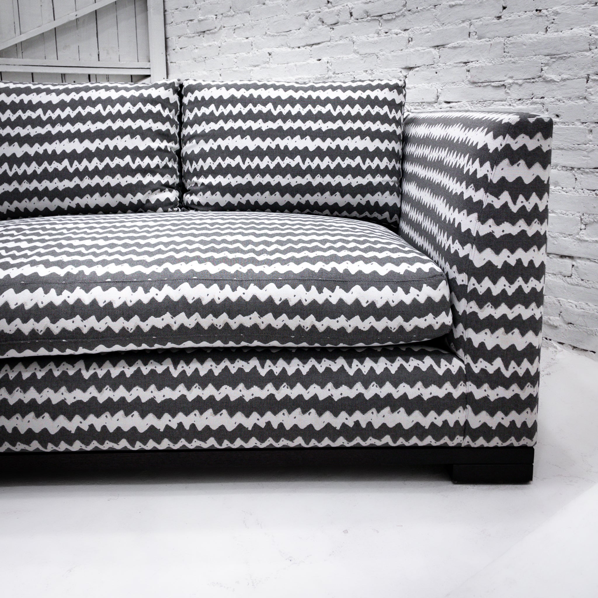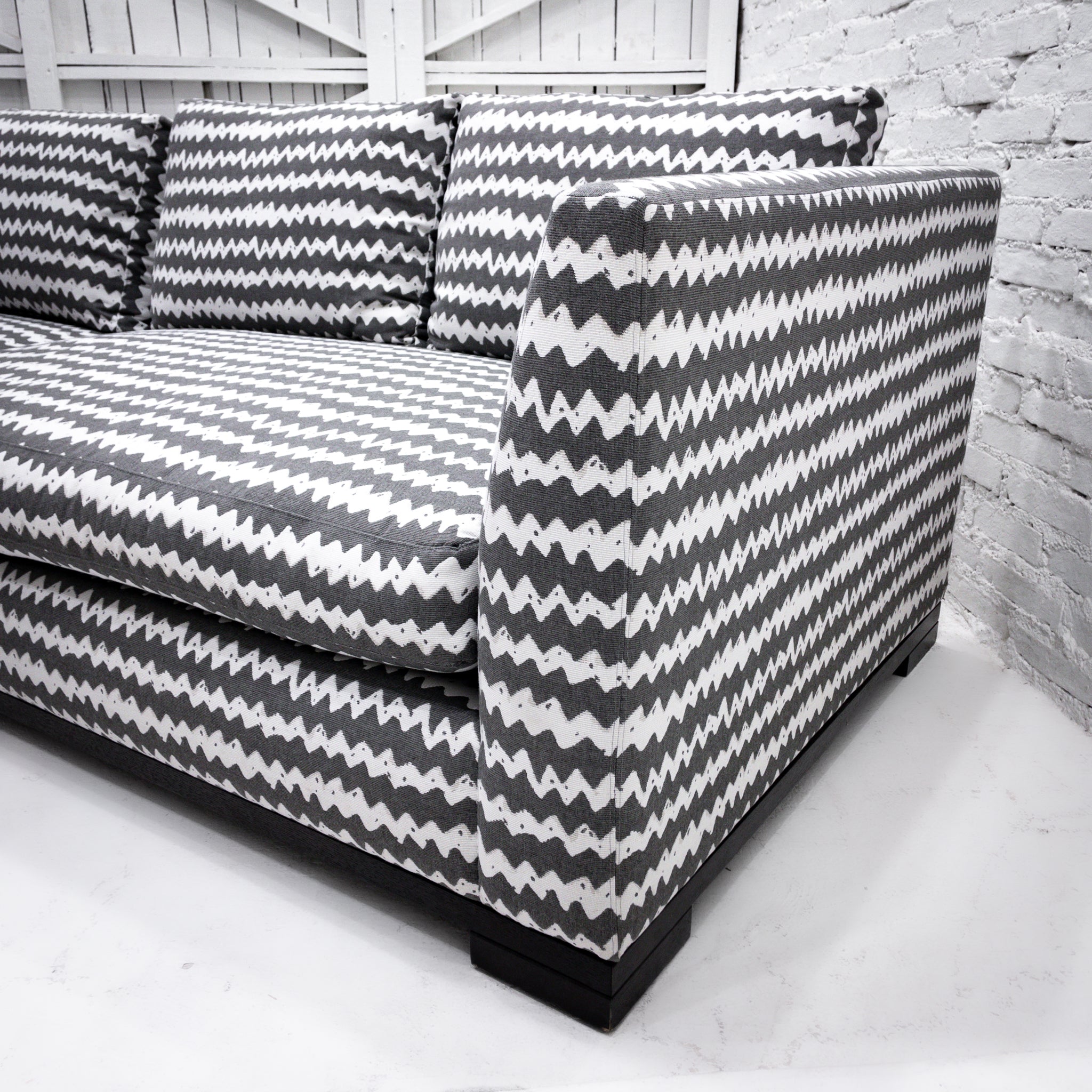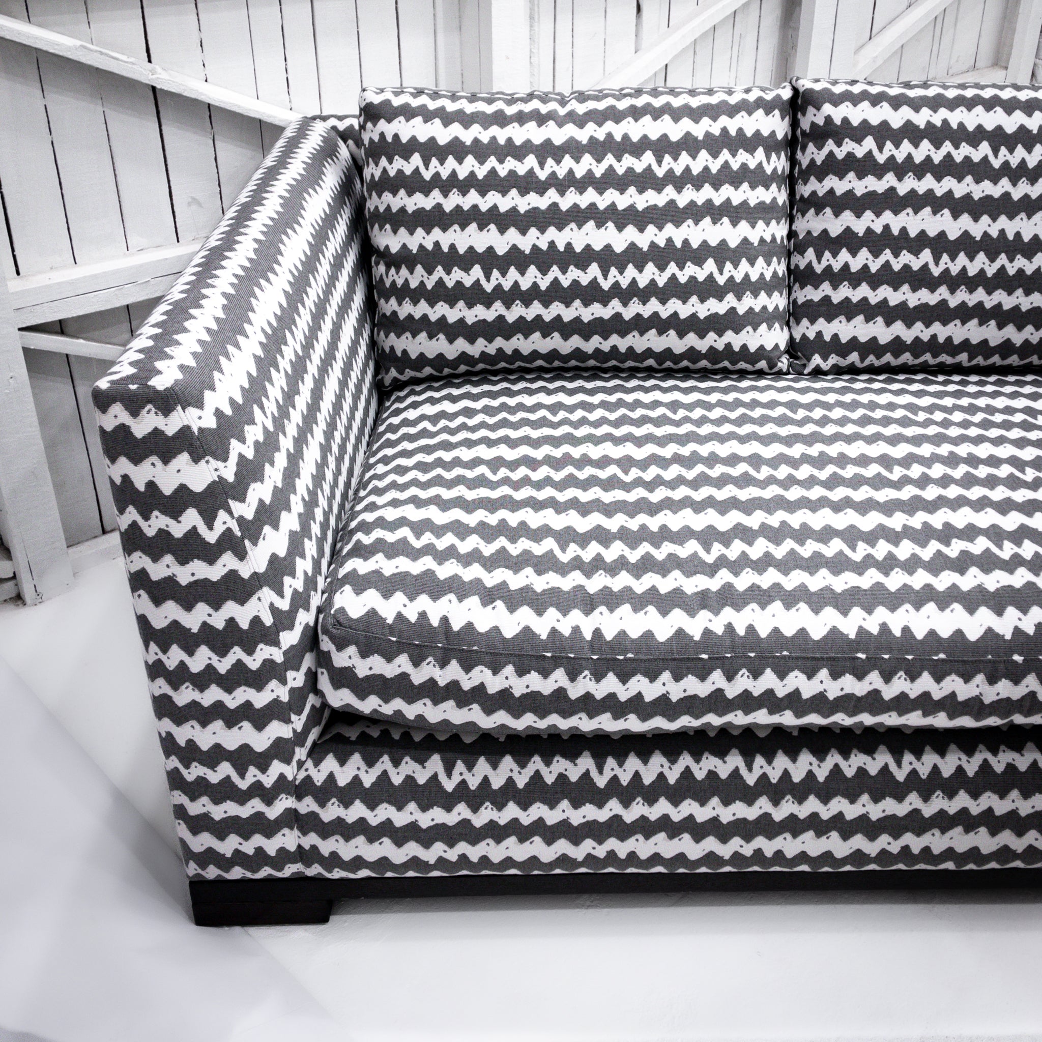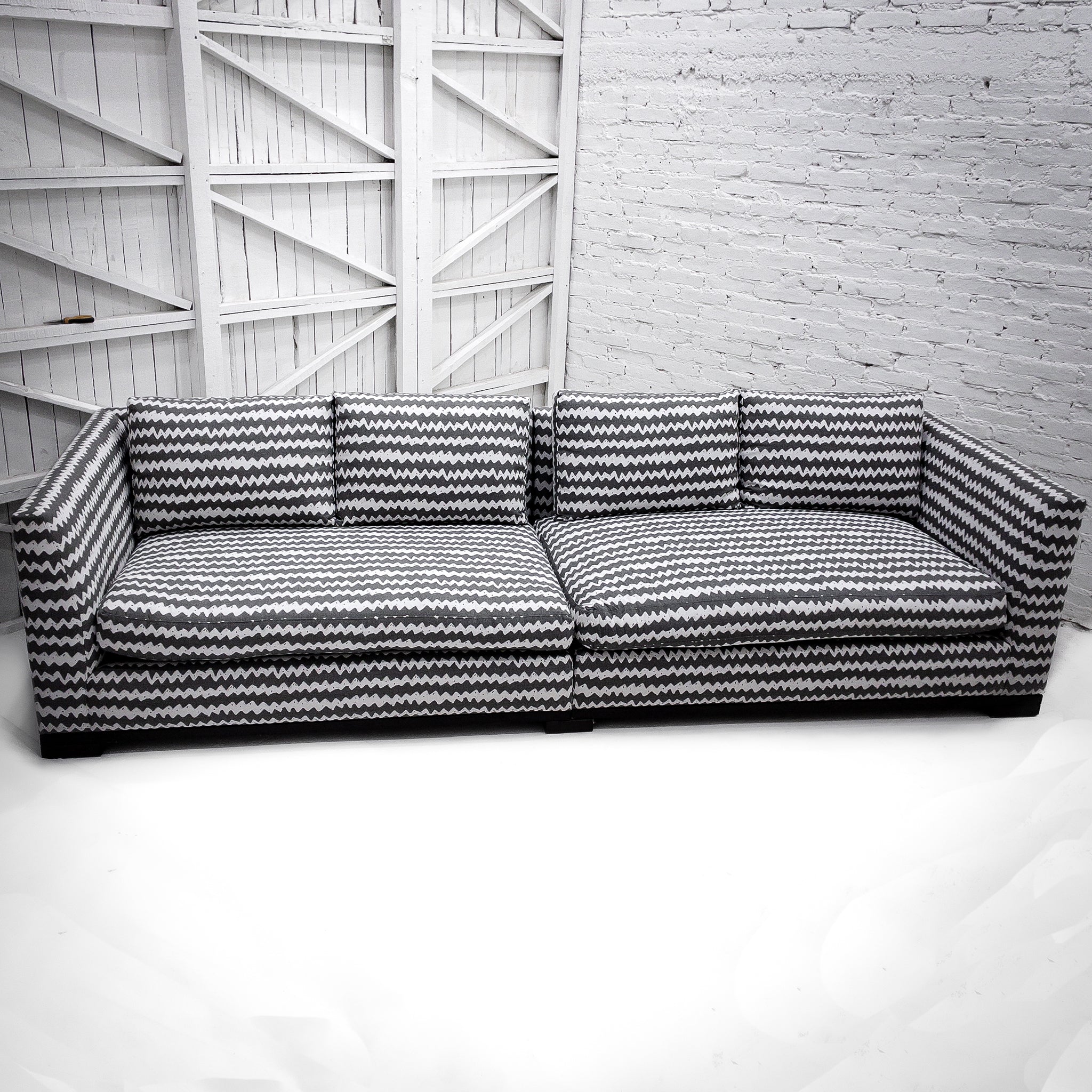 Sectional Sofa. 2 Piece, 120" Perennials indoor/outdoor fabric sofa in white and gray chevron pattern, tuxedo arm, four loose back cushions and two bench seat cushions in feather wrap, and blackened wood base with lap joint.