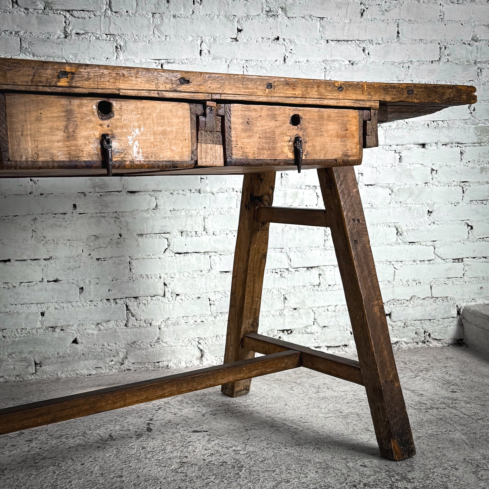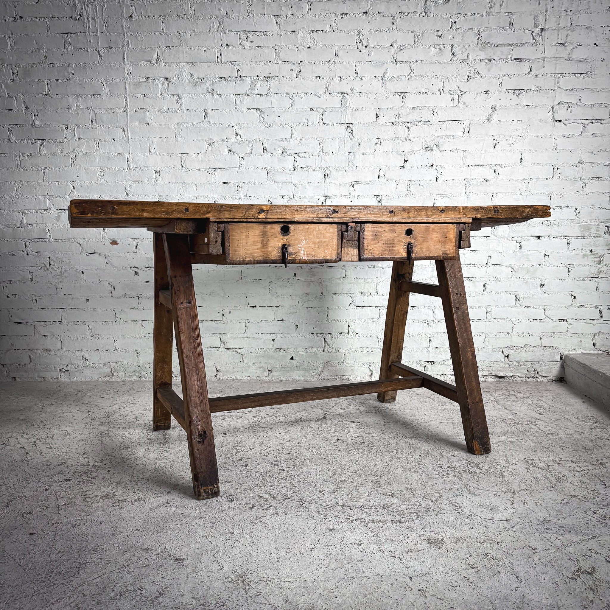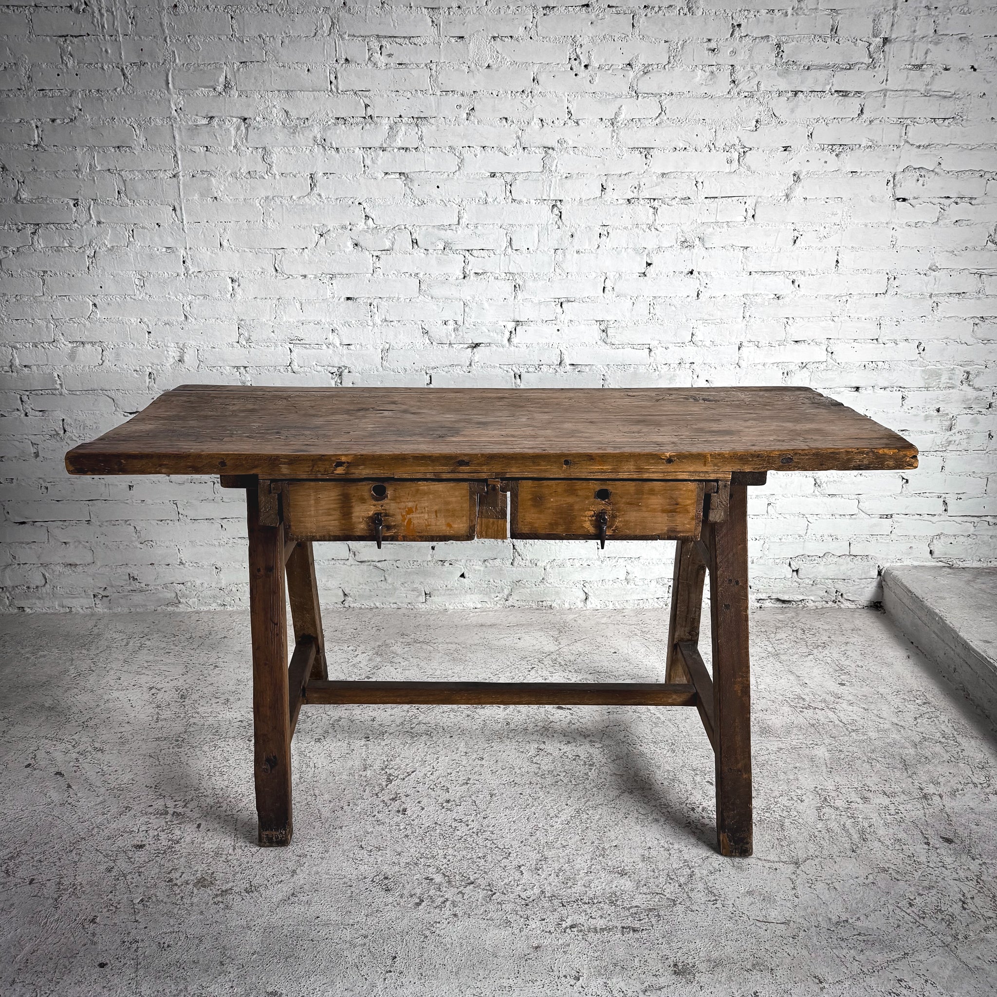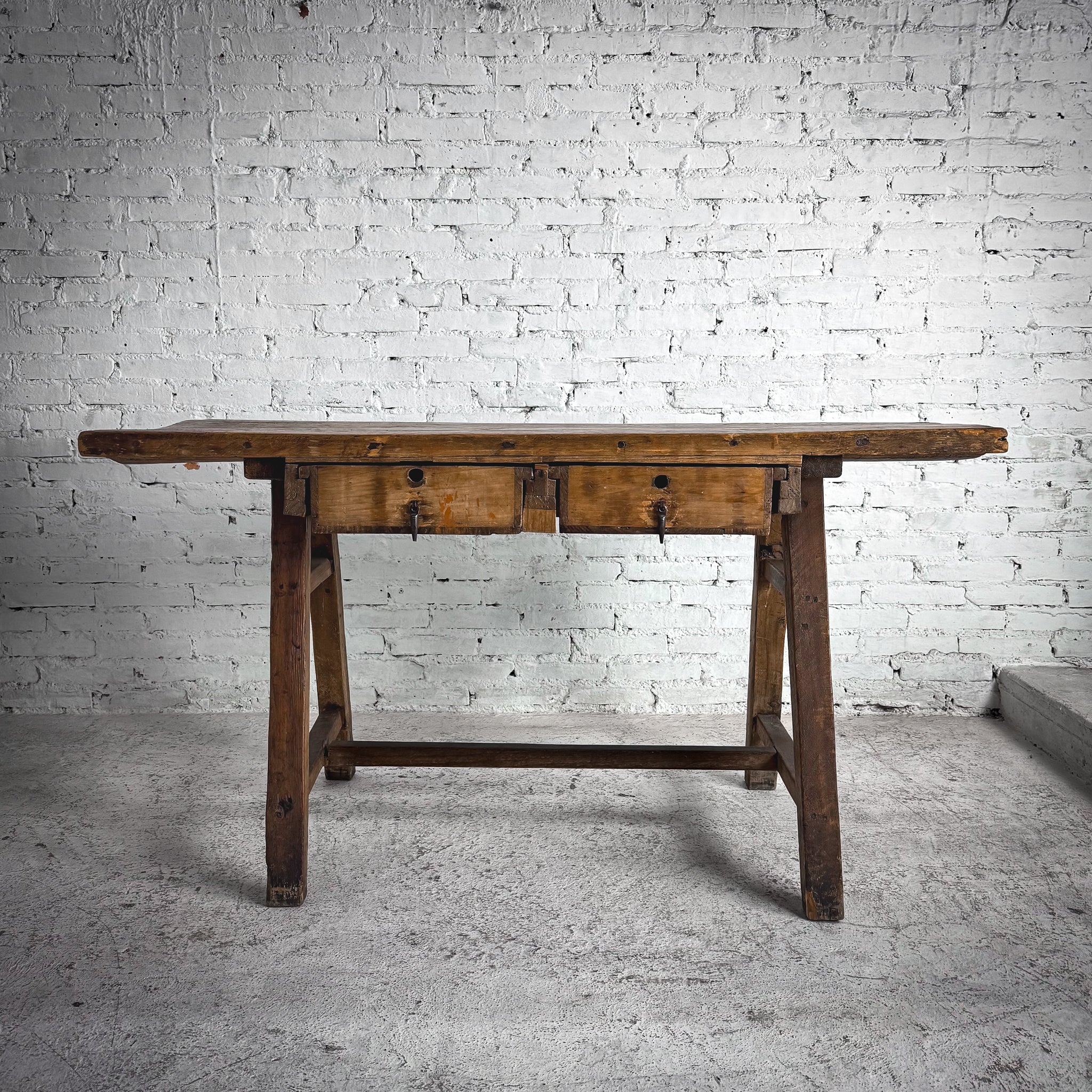 Kitchen island. Antique country work table handcrafted in blonde wood w/ a sun-warmed patina. The rectangular plank top rests over a trestle-style base. Twin drawers provide utilitarian charm, accented w/ timeworn hardware.