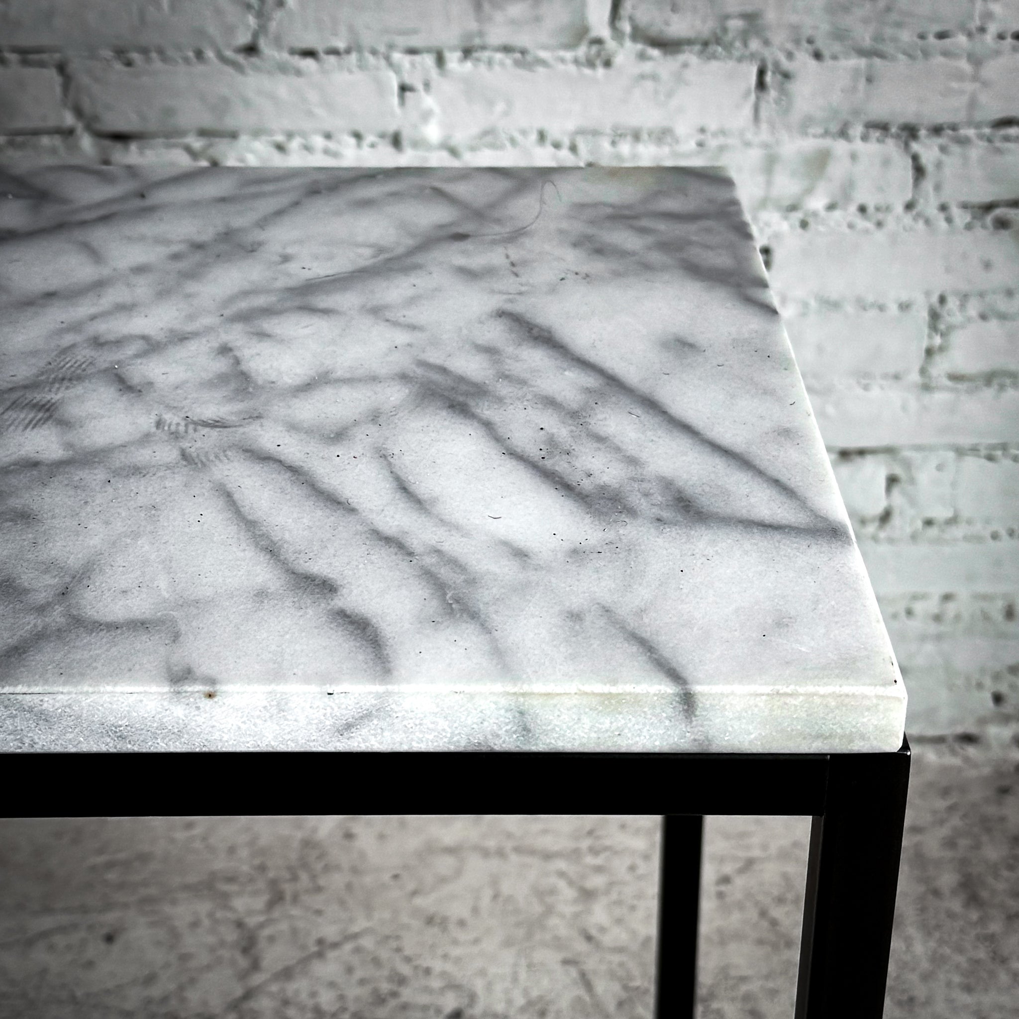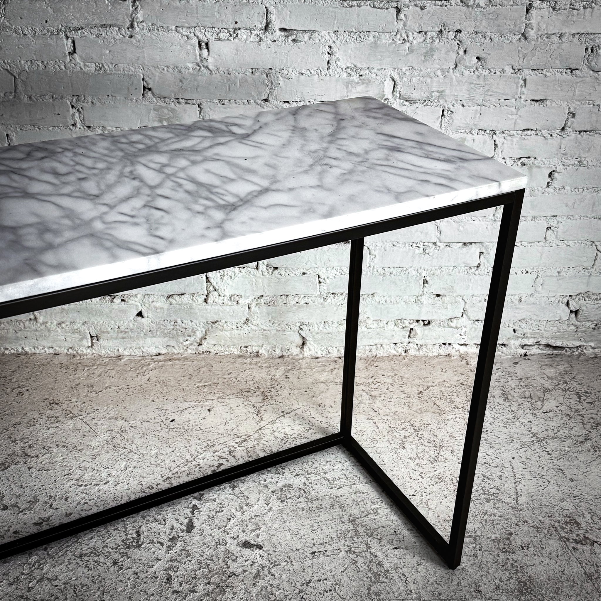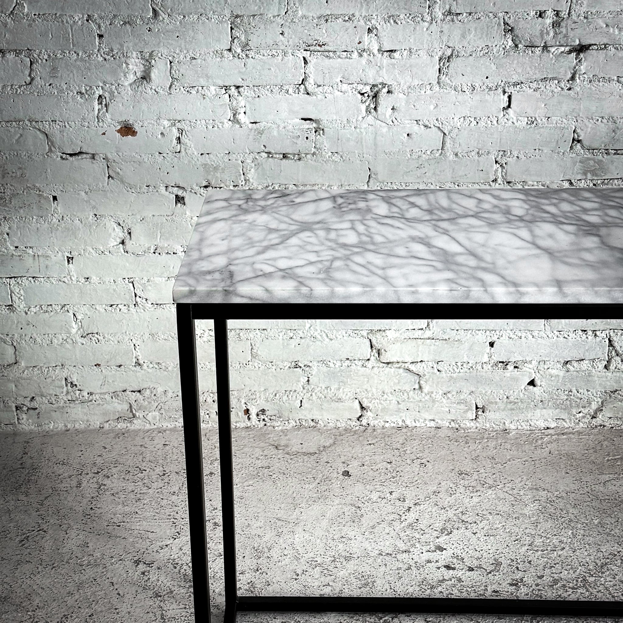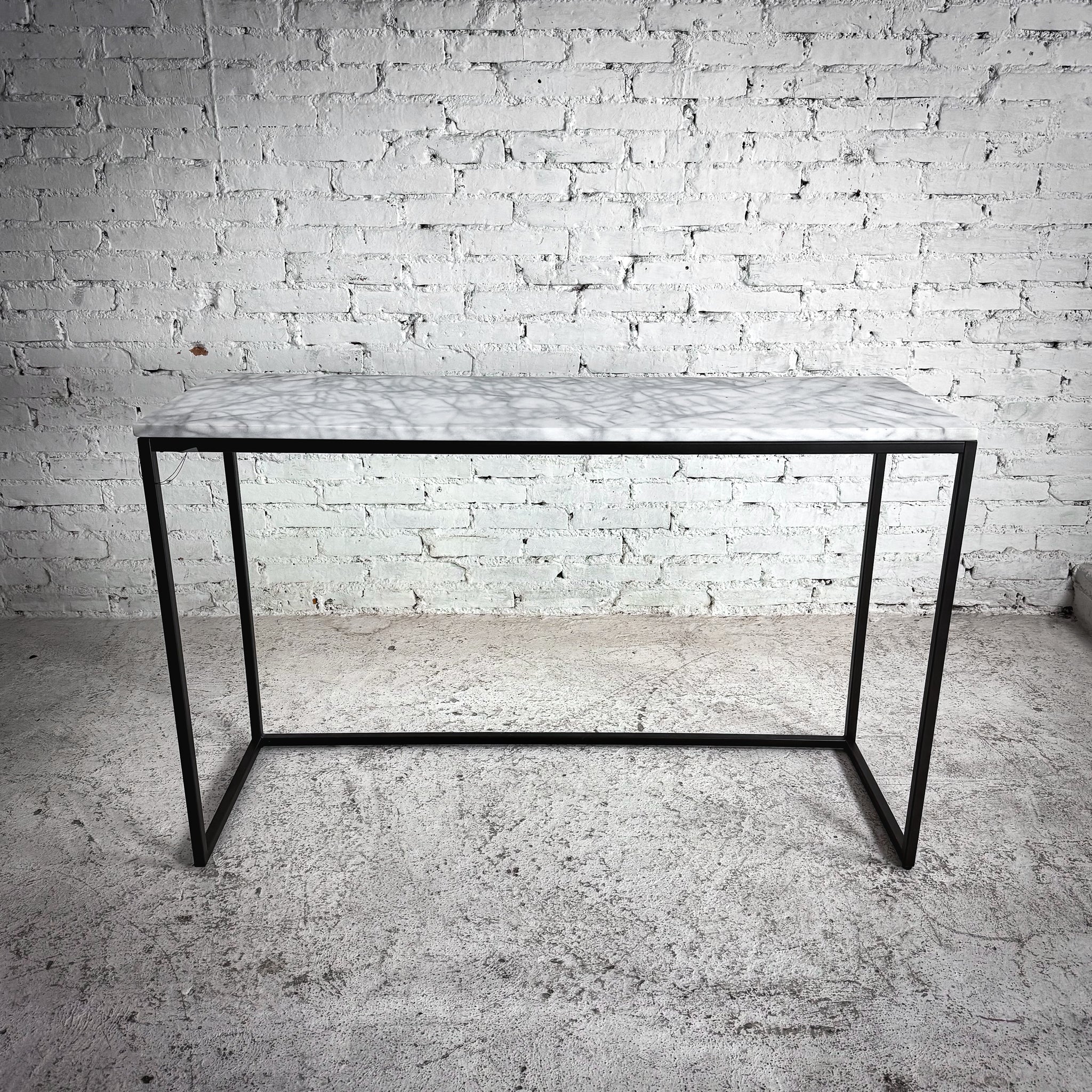 Console. Carrara marble top console table featuring a sleek rectangular slab set on a minimalist graphite powder-coated metal frame.