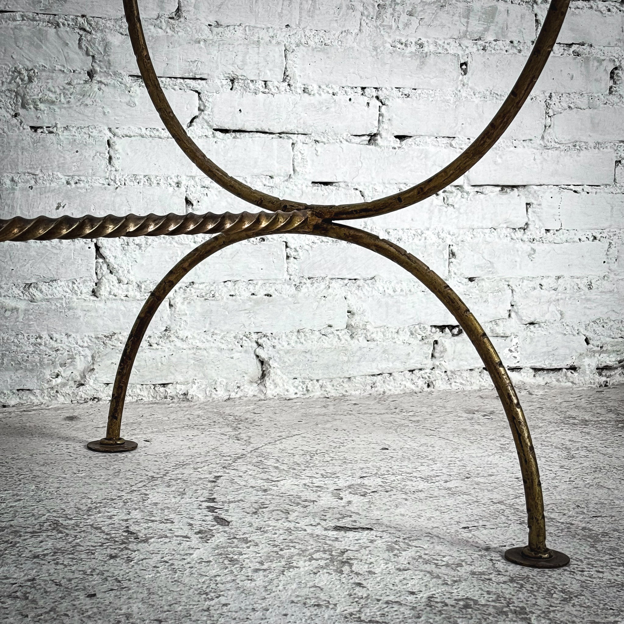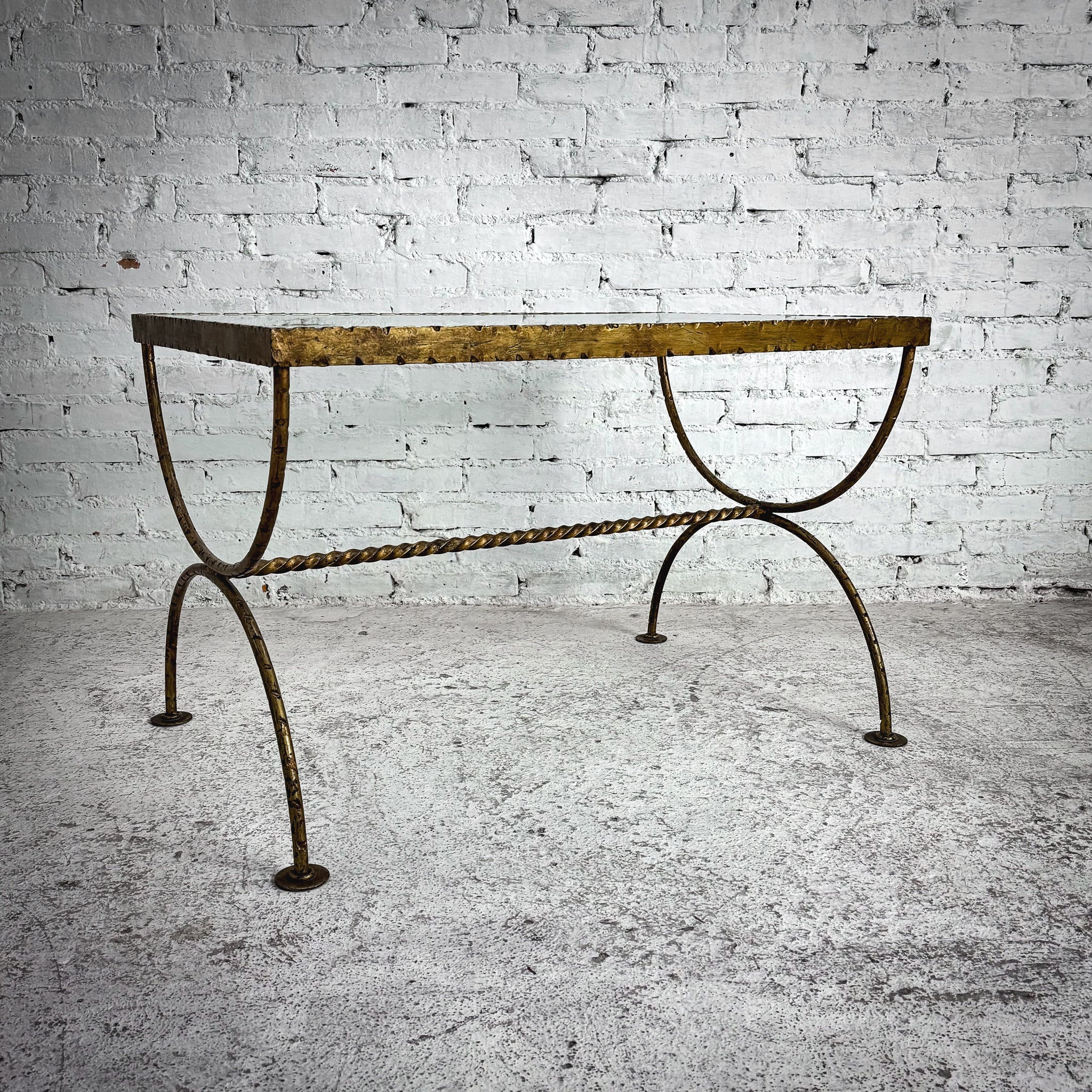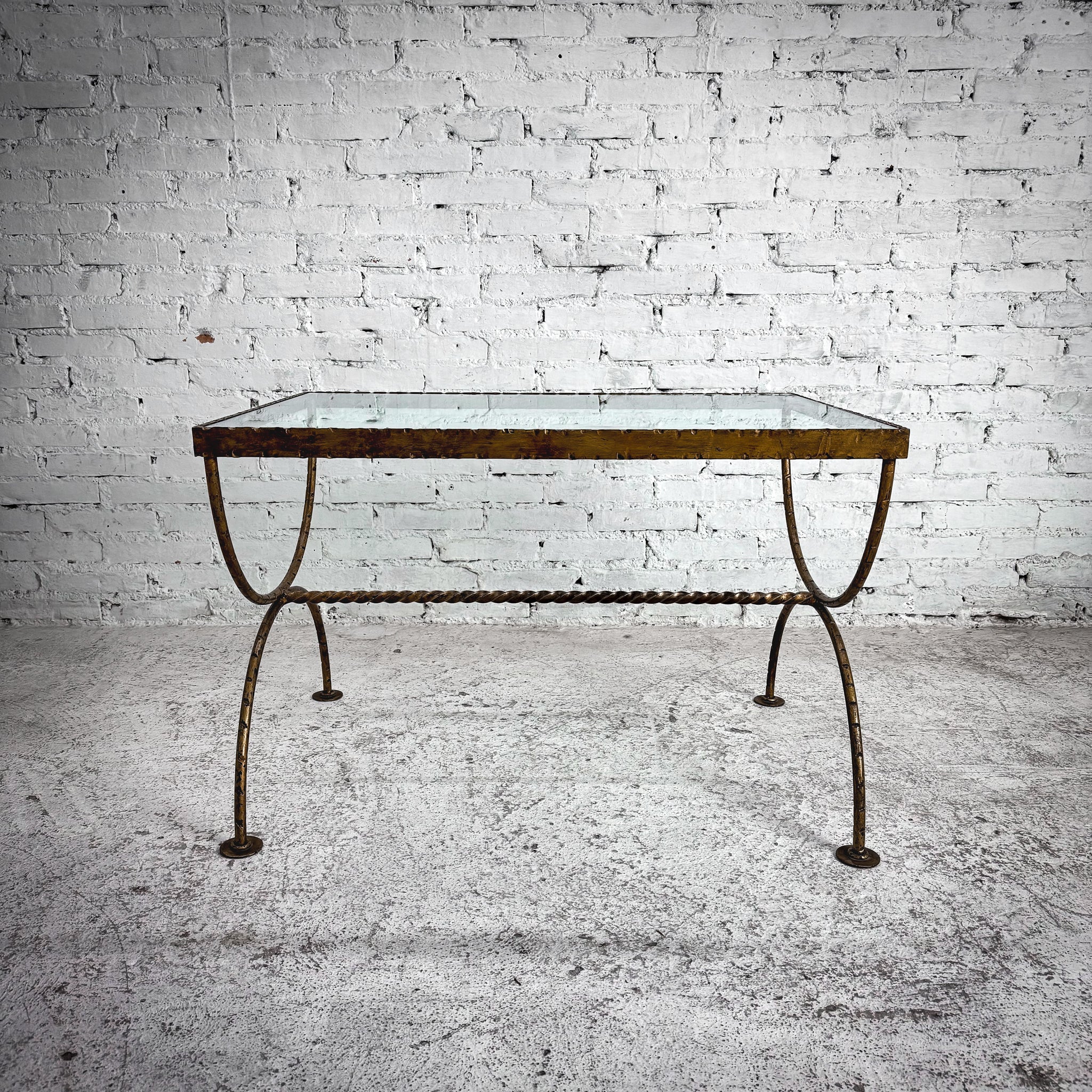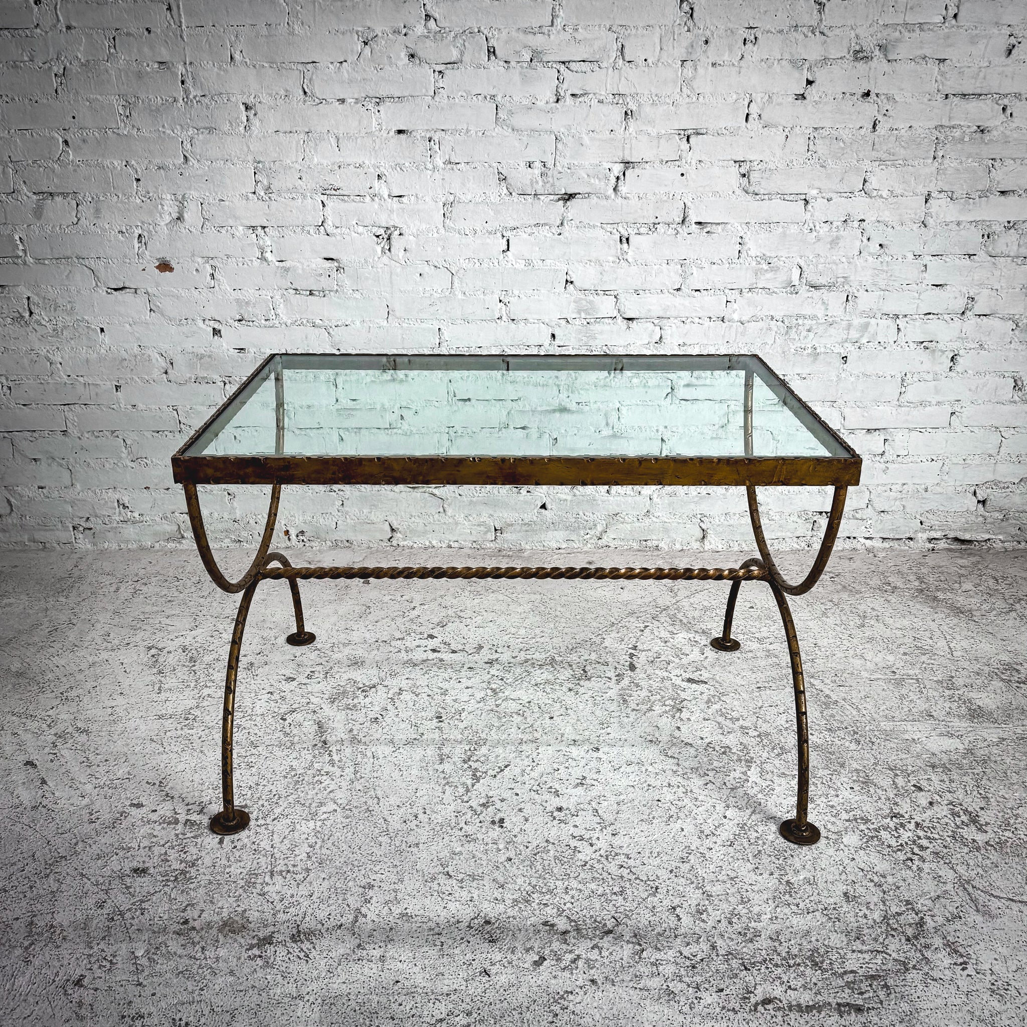 Cocktail Table. Hammered iron cocktail table featuring a rectangular glass top with scrolled loop legs joined by a twisted stretcher, and a distressed gilt finish. Age-appropriate wear.