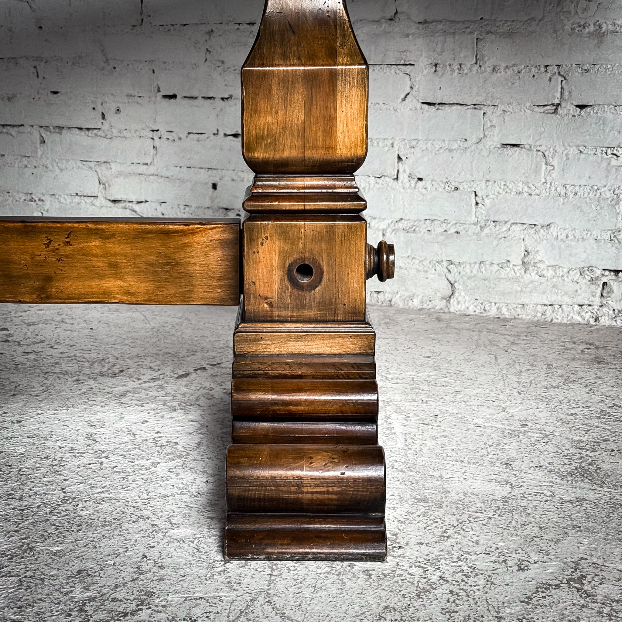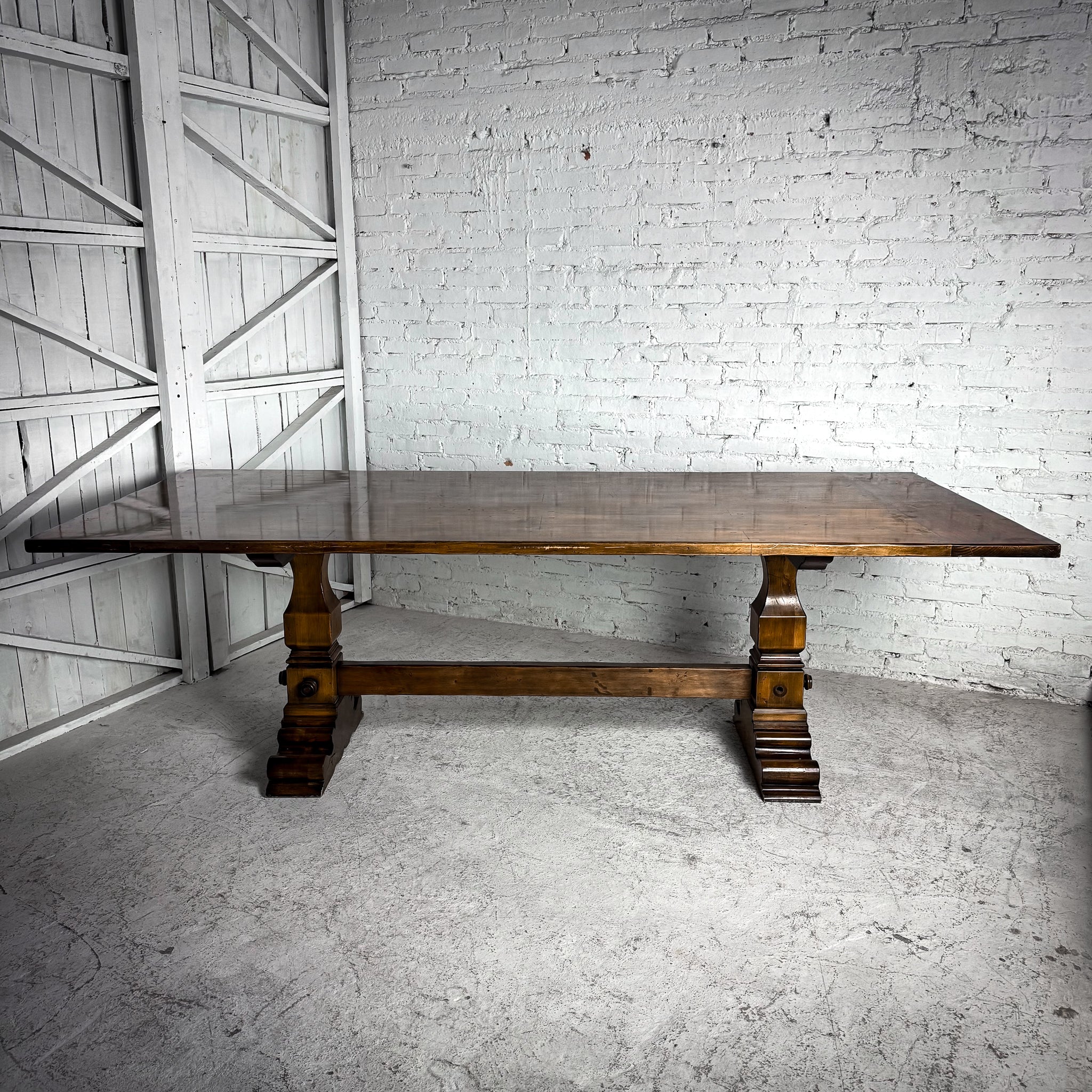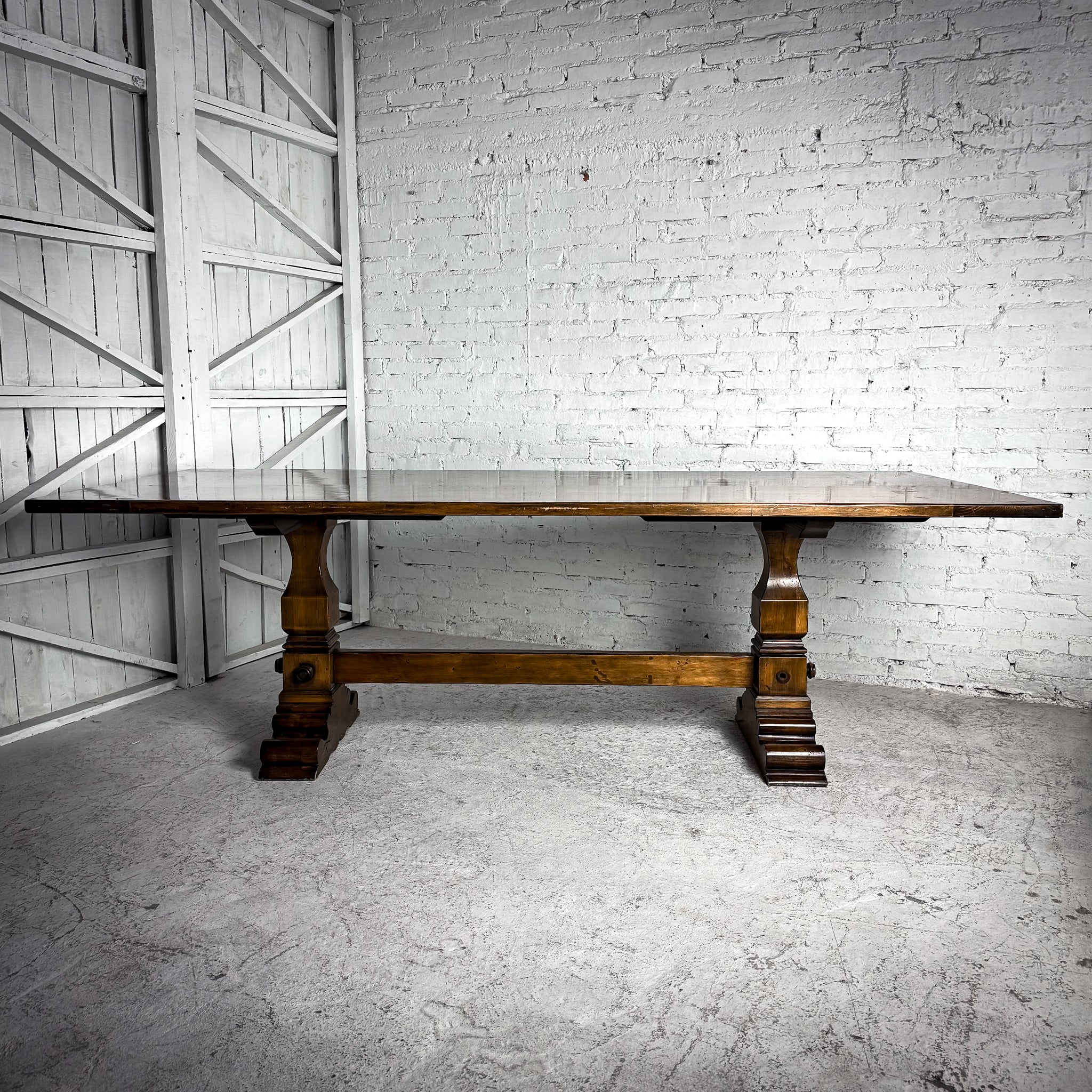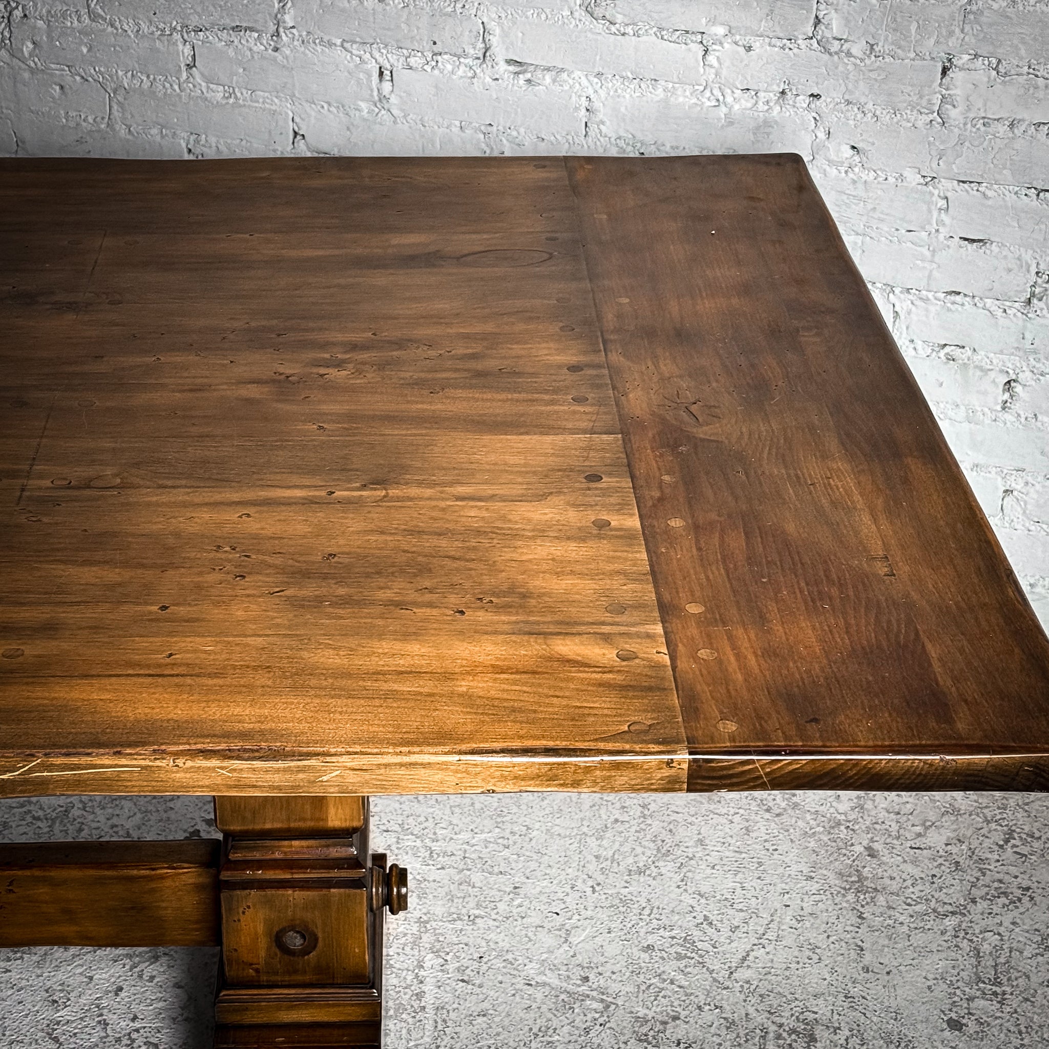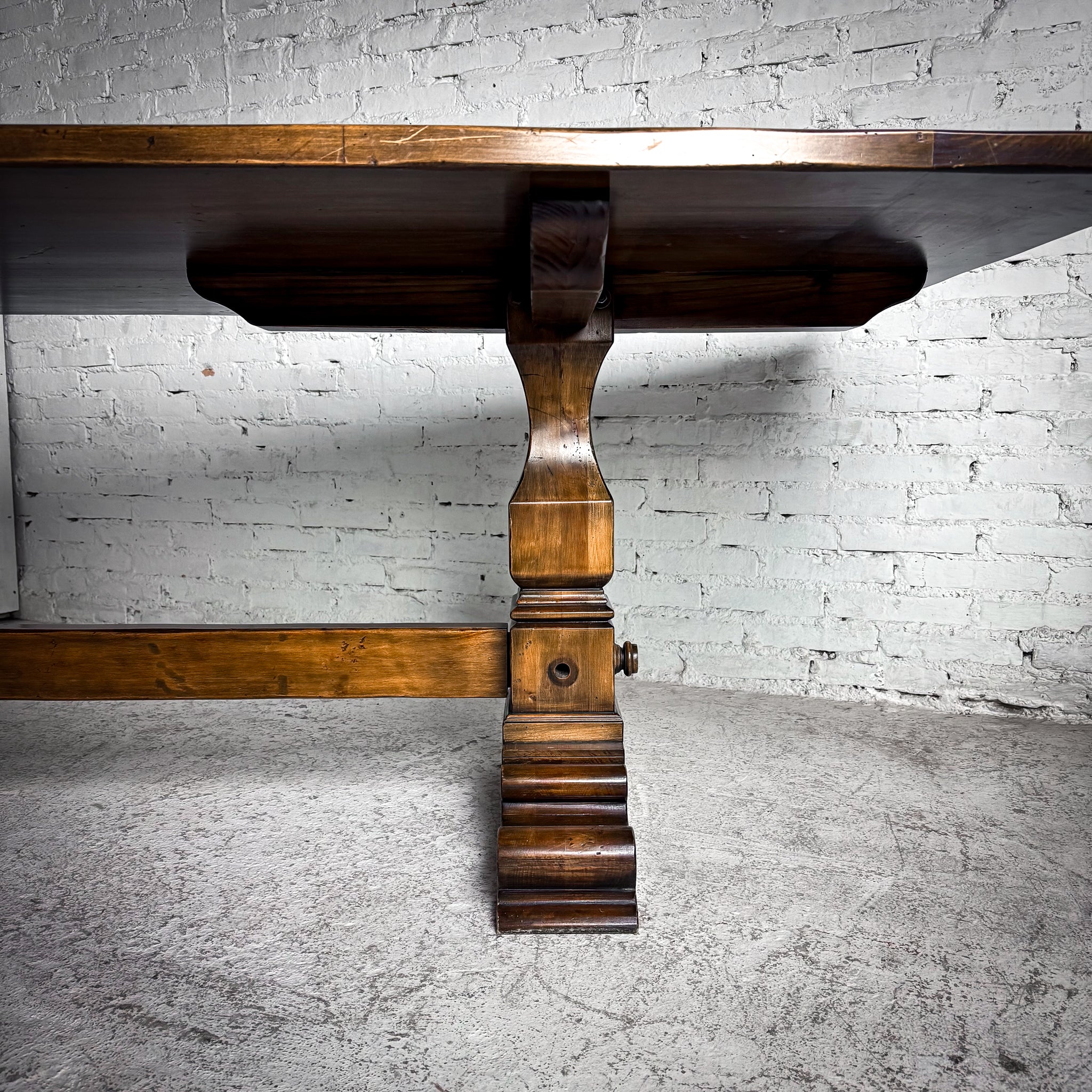 Dining Table. Evos W37 Retail $3,062 USD. Vintage Rustic Spanish Colonial Solid Pine Dining Table. Pegged plank top, carved pedestal bases, heavy stretcher. Good condition with minor surface wear.