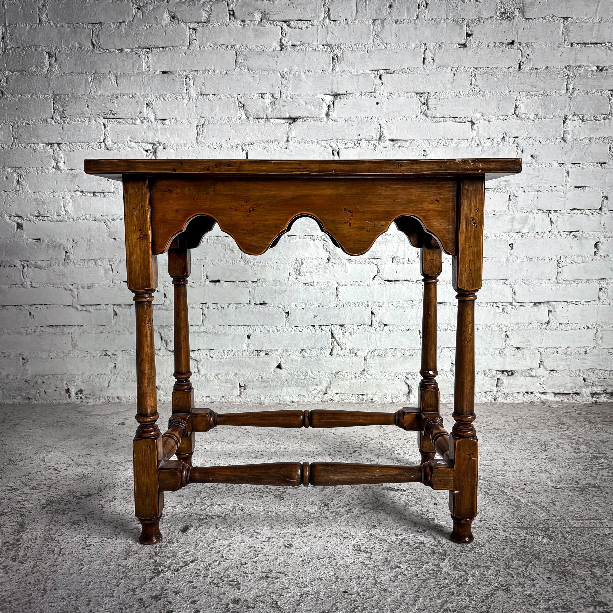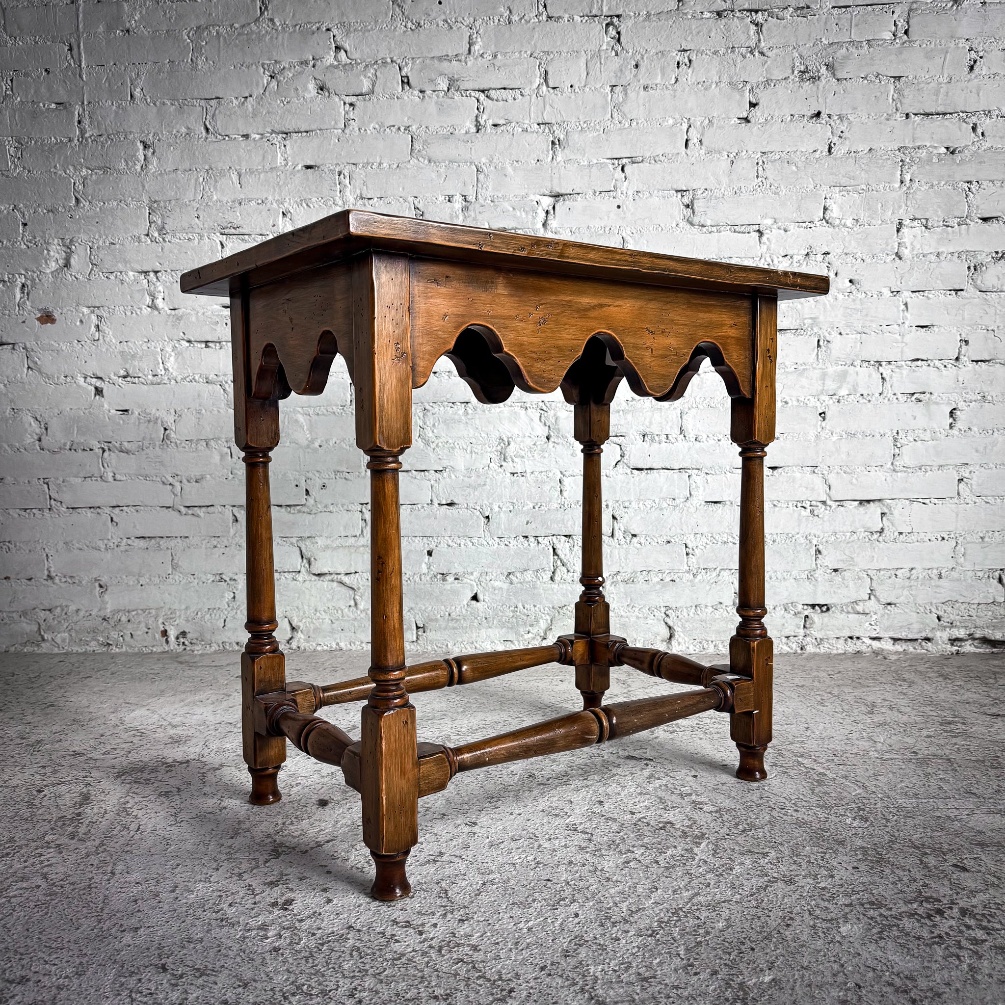 Side Table. Rectangular alder side table with scalloped apron, turned legs, and a box stretcher base, all finished in a warm honey tone.