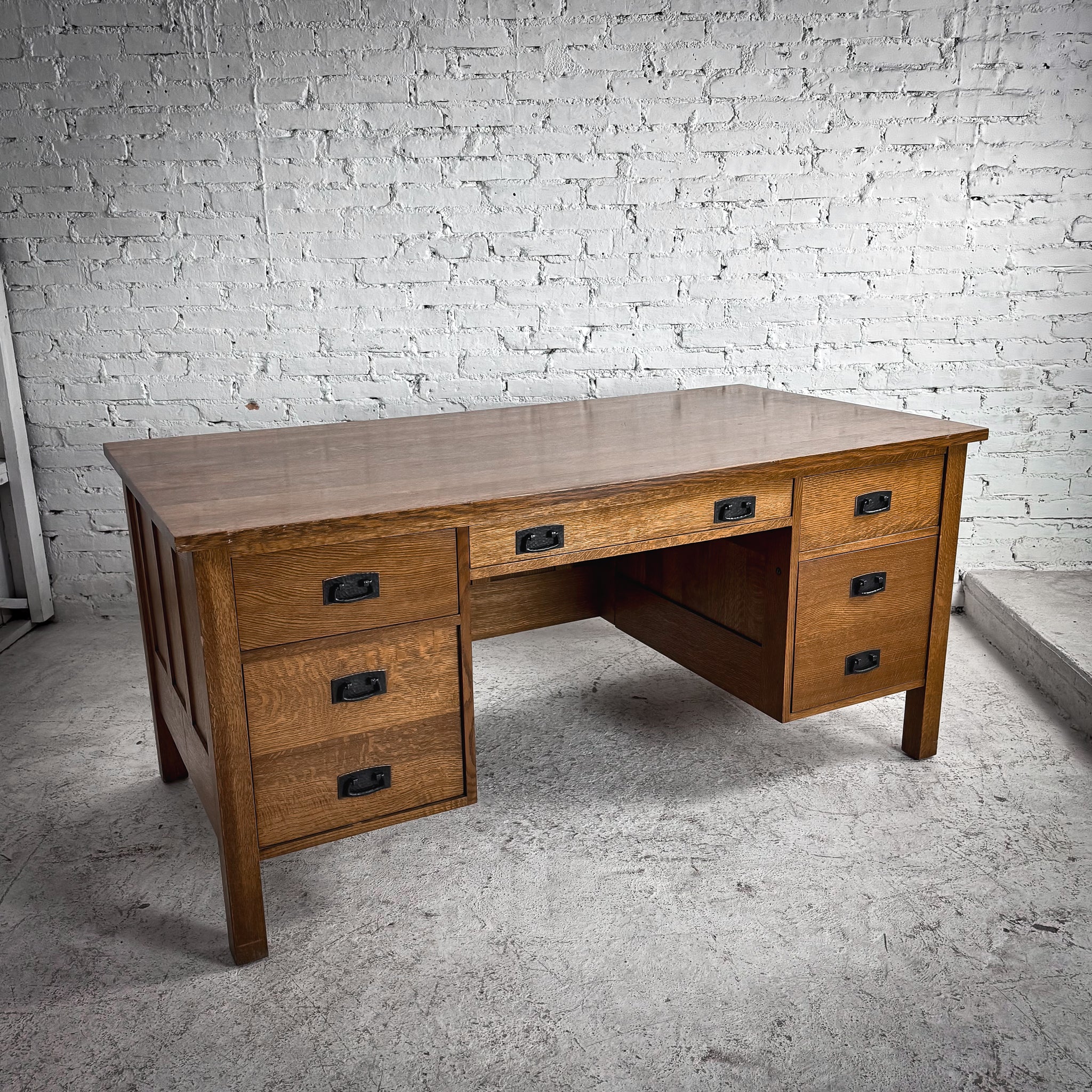 Desk. Late 20th century to early 21st century piece Stickley oak desk. Quartersawn oak with paneled sides, recessed metal pulls, and warm satin finish. Handcrafted in Manlius, NY.