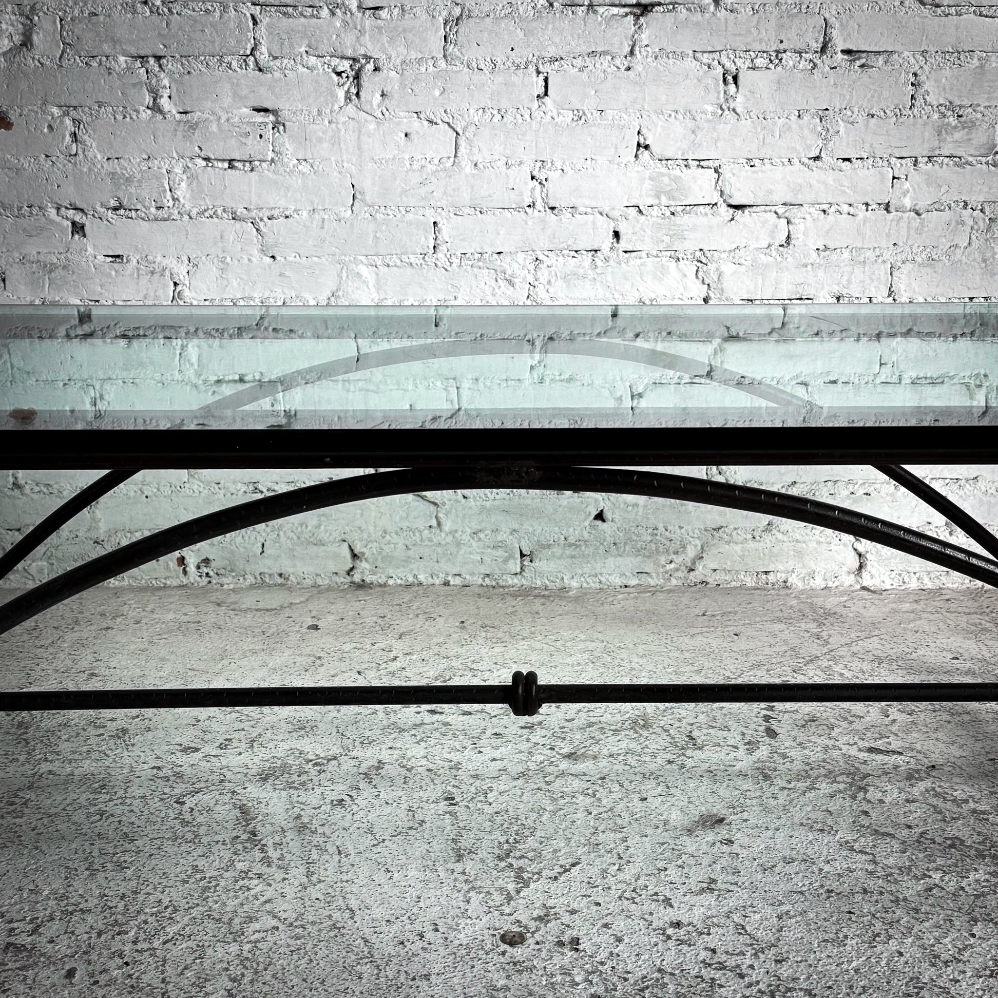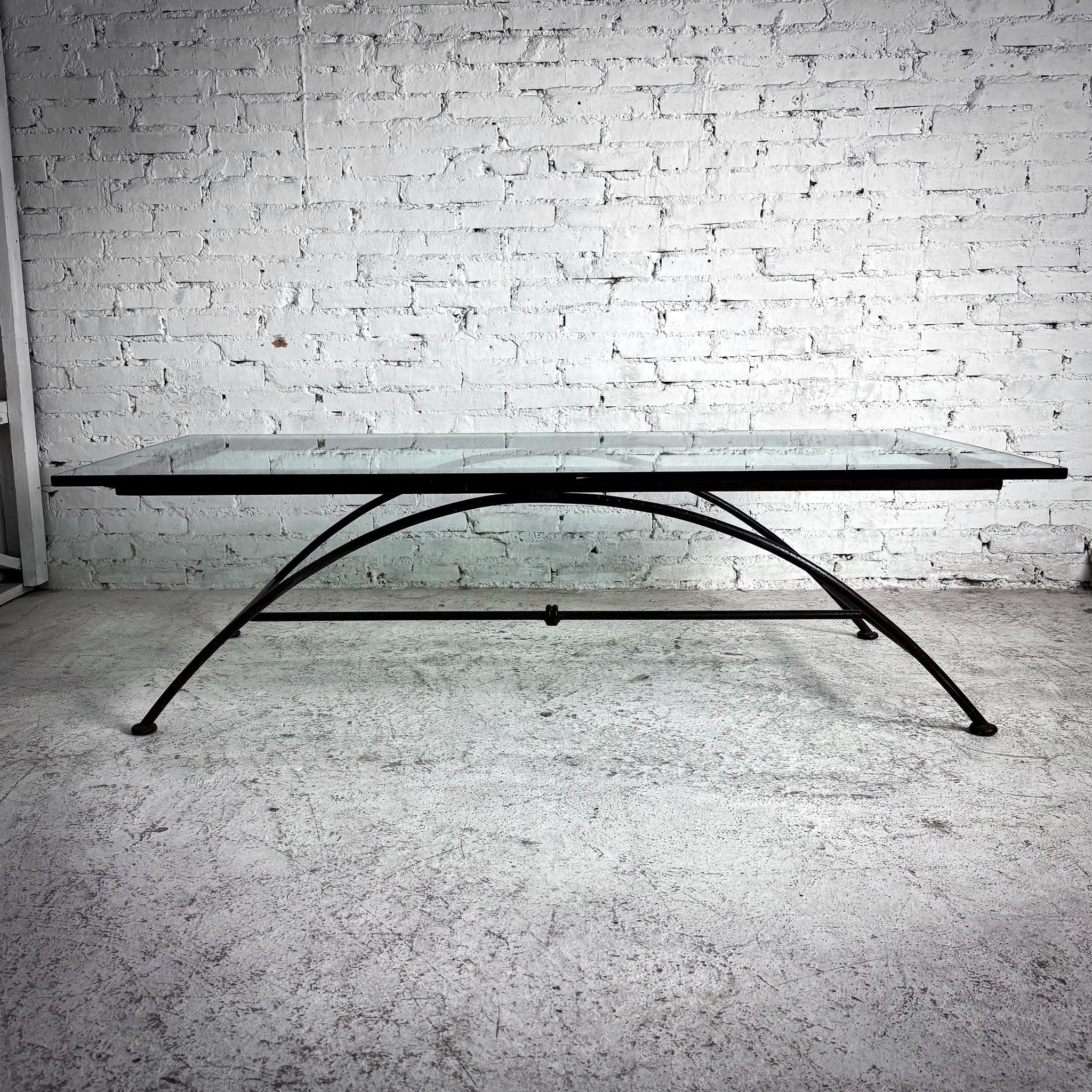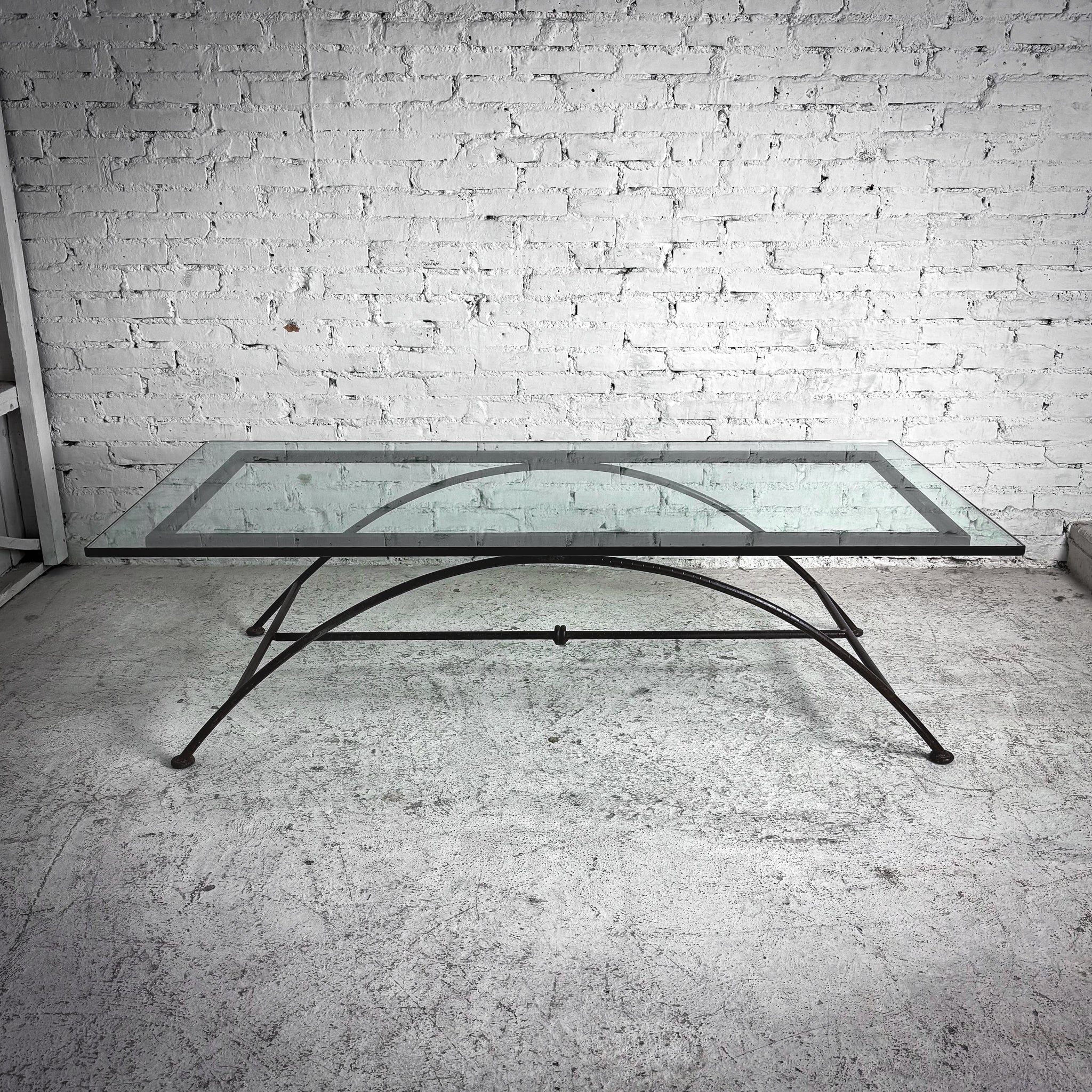 Cocktail Table. Contemporary rustic wrought iron and glass cocktail table. Rectangular 3/4" beveled glass top over arched dark metal base with ring stretcher.