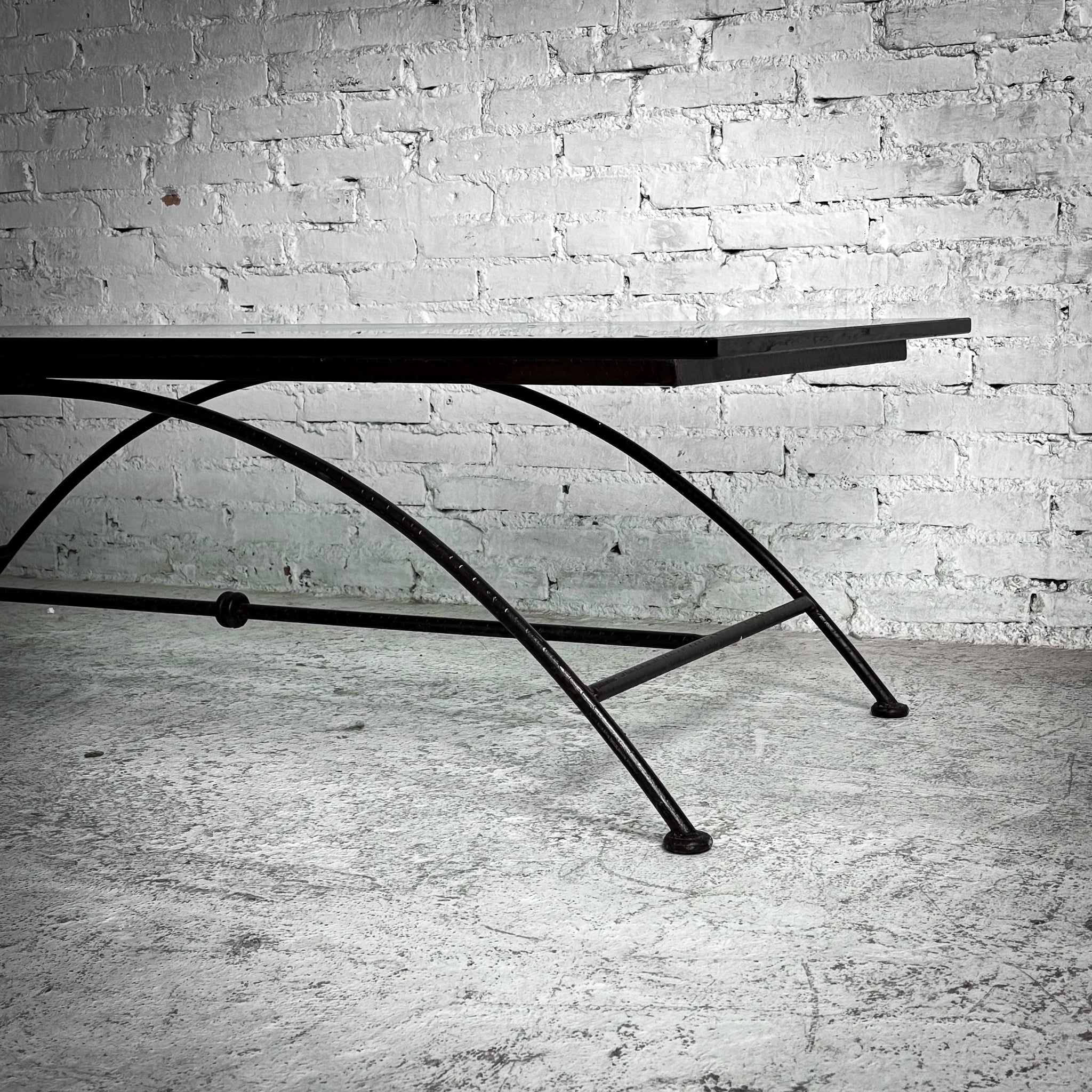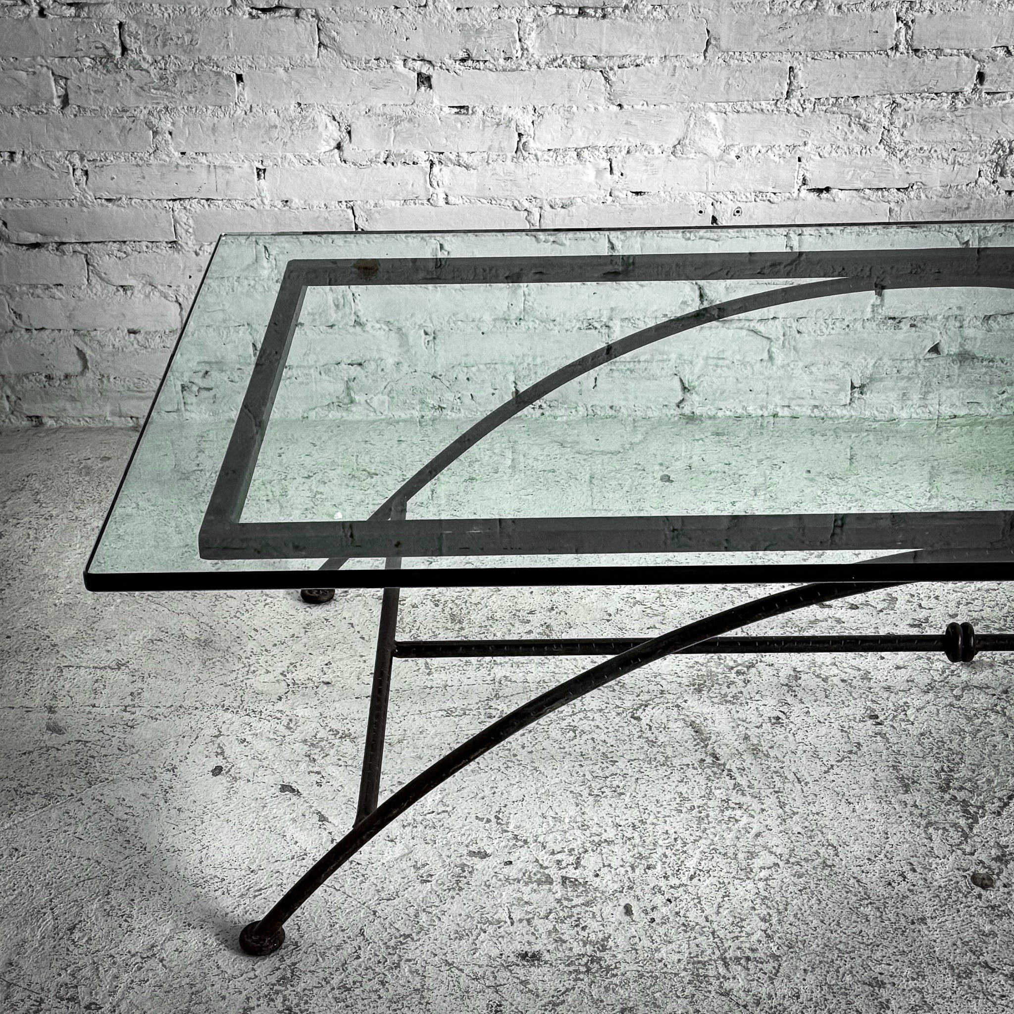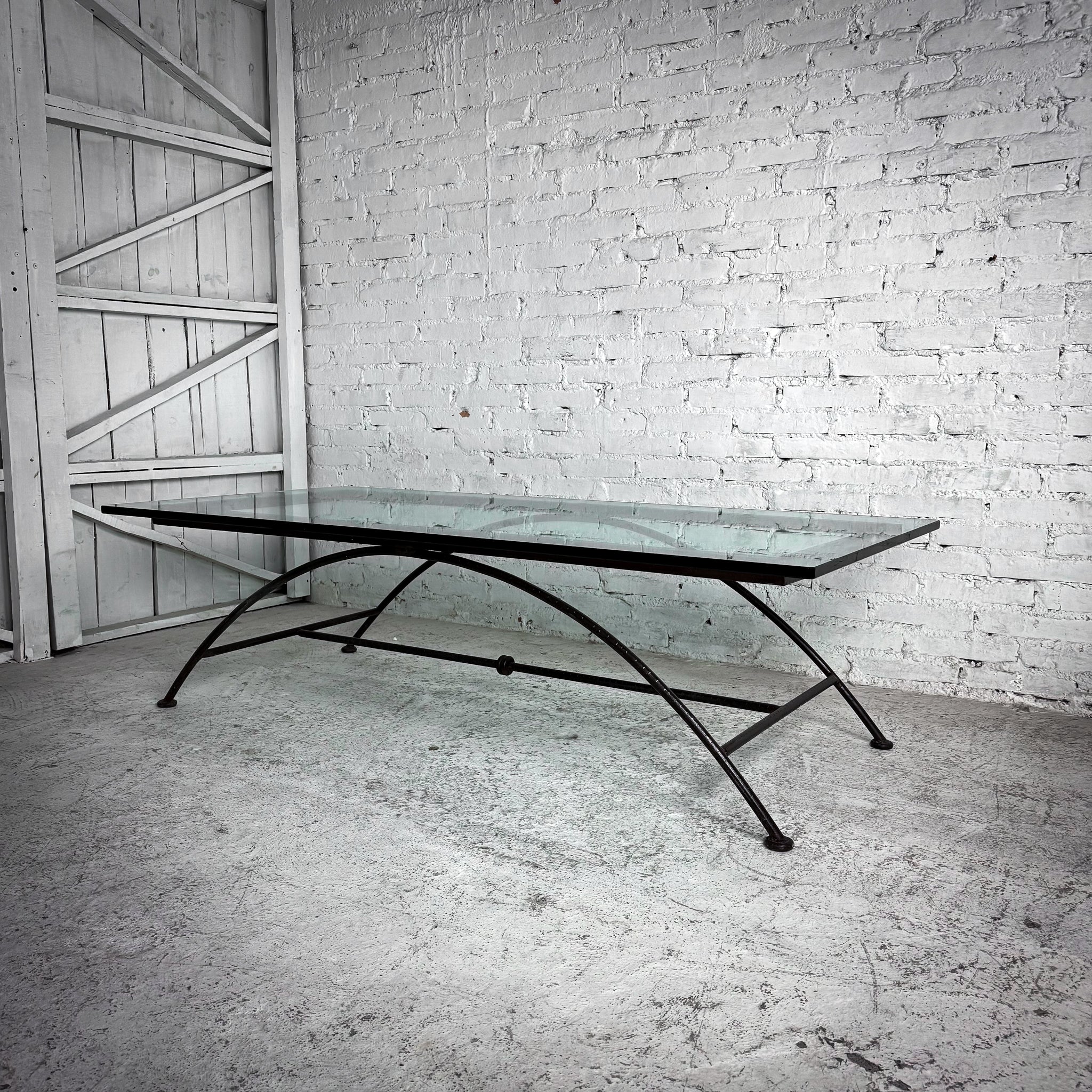 Cocktail Table. Contemporary rustic wrought iron and glass cocktail table. Rectangular 3/4" beveled glass top over arched dark metal base with ring stretcher.