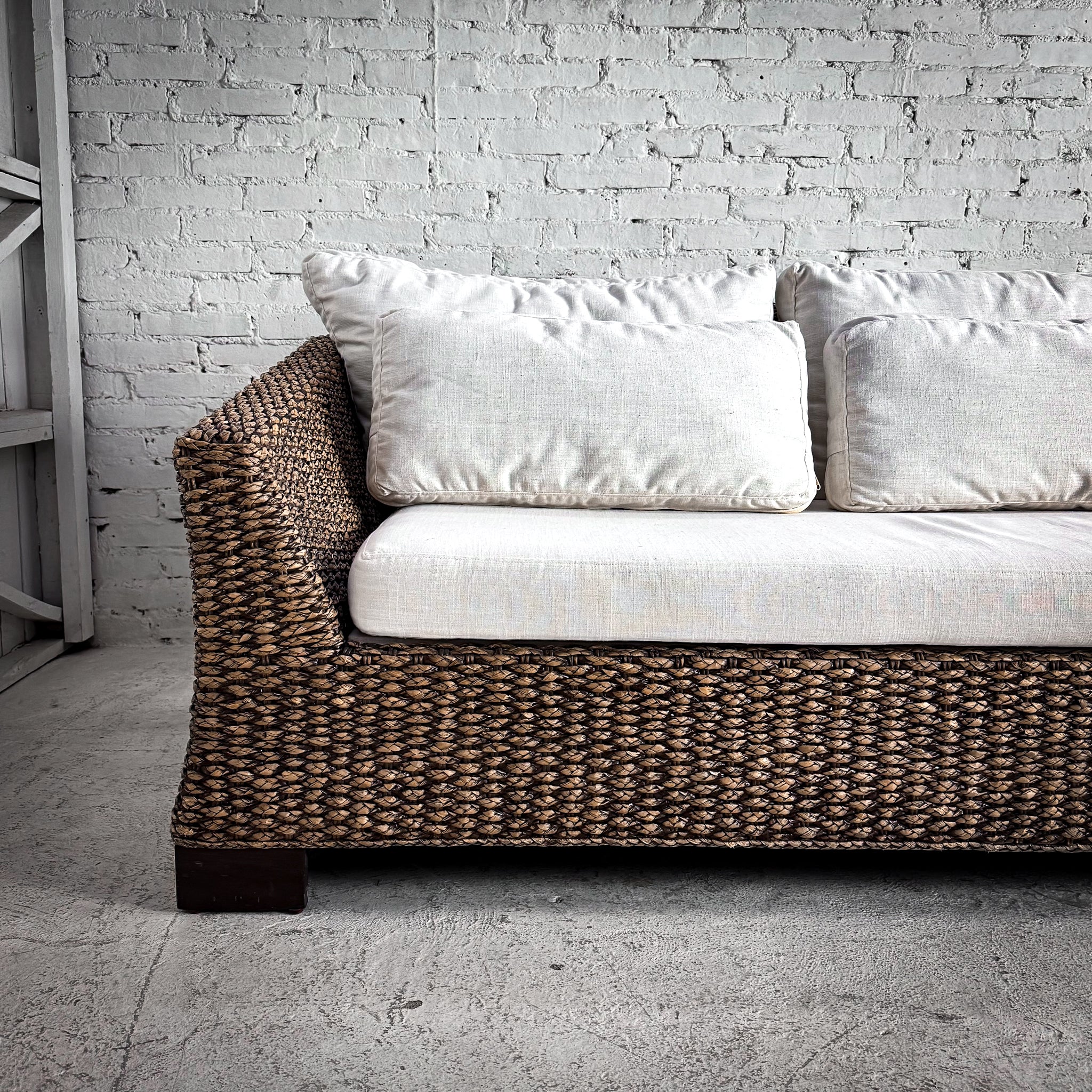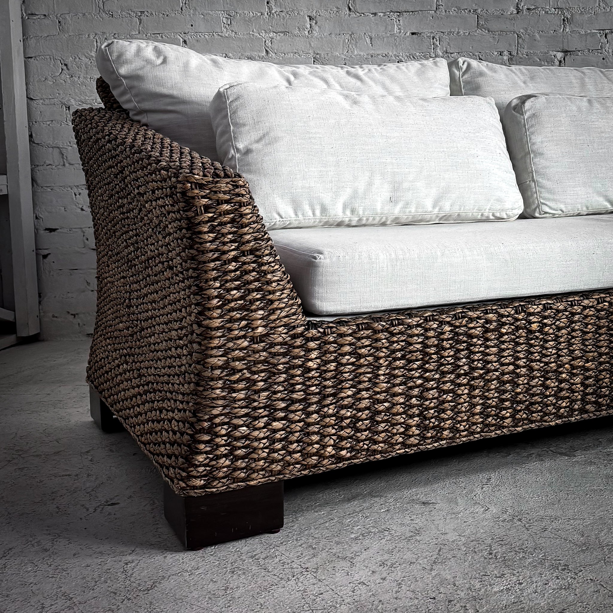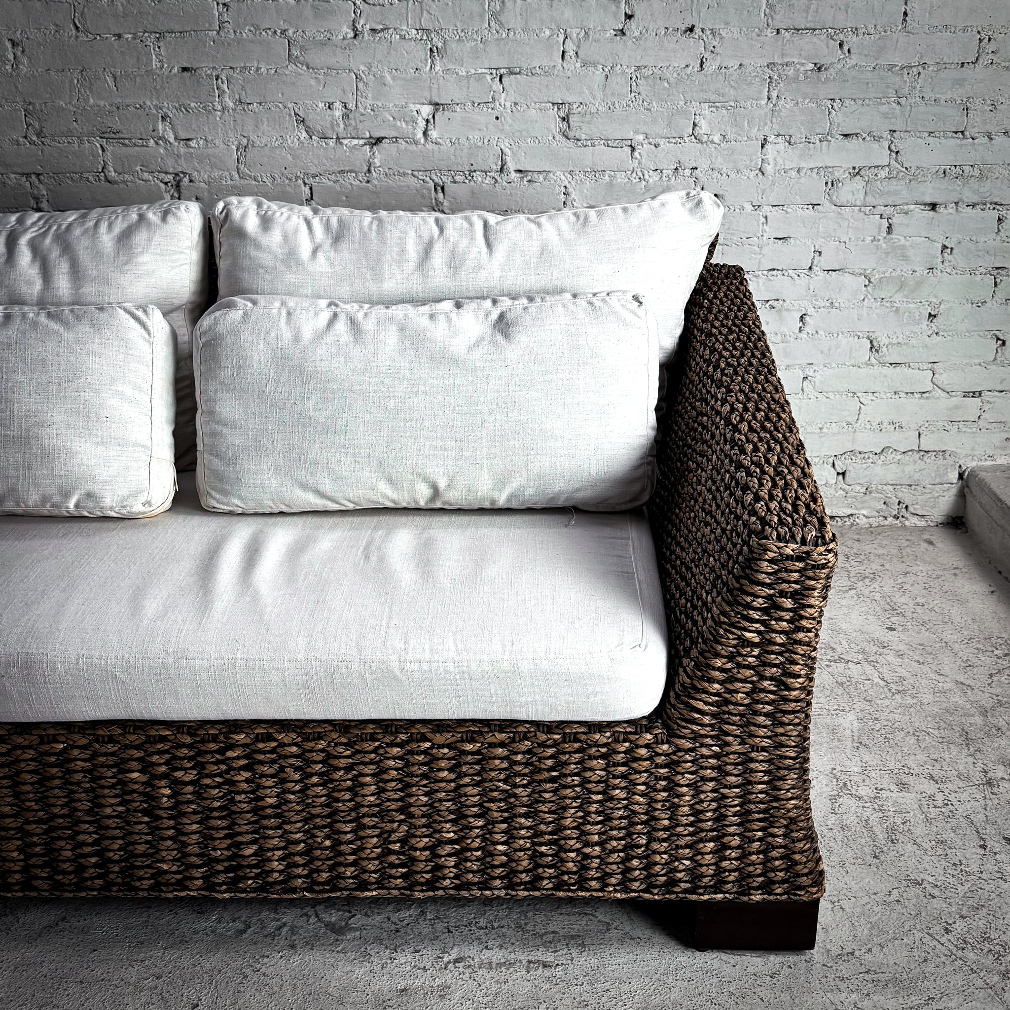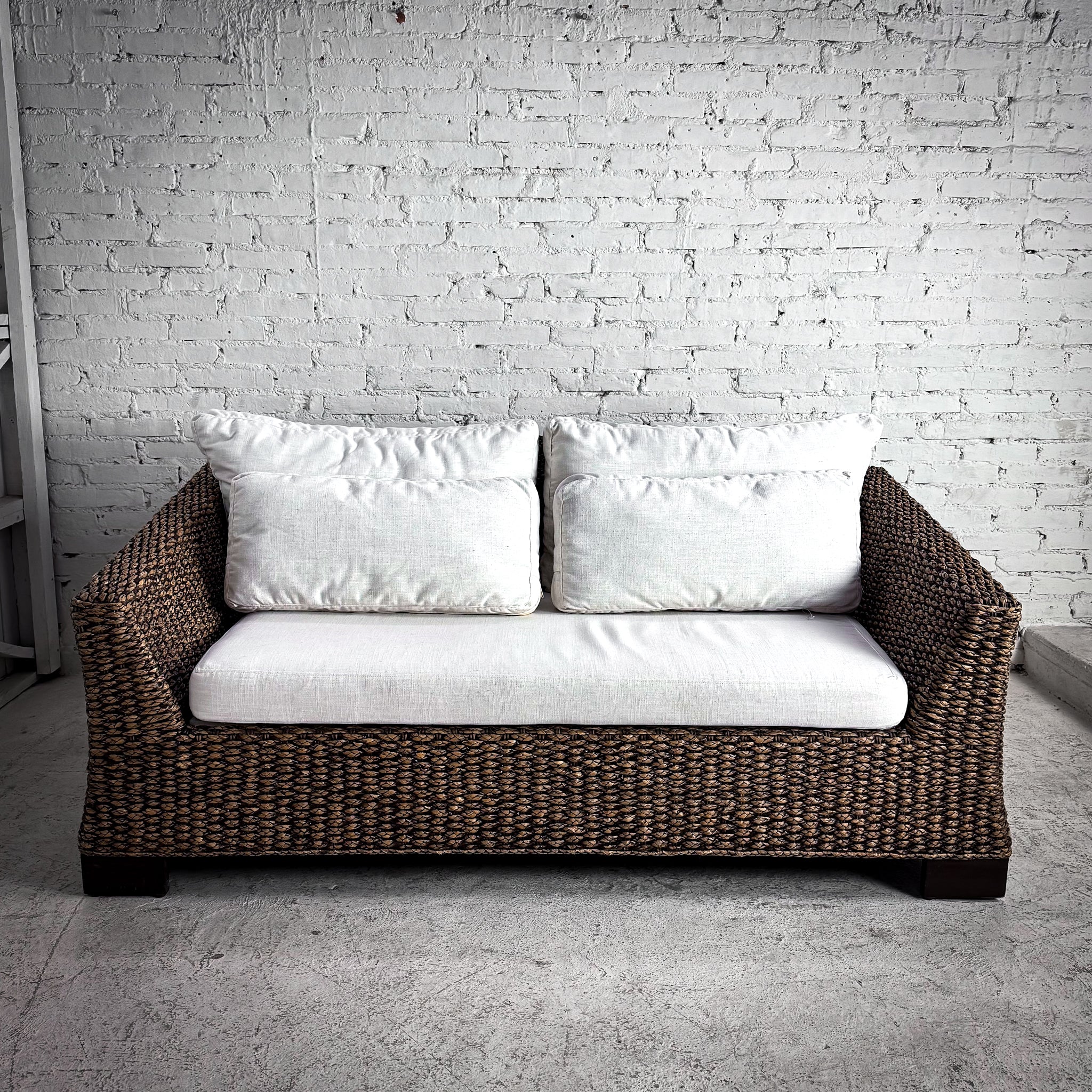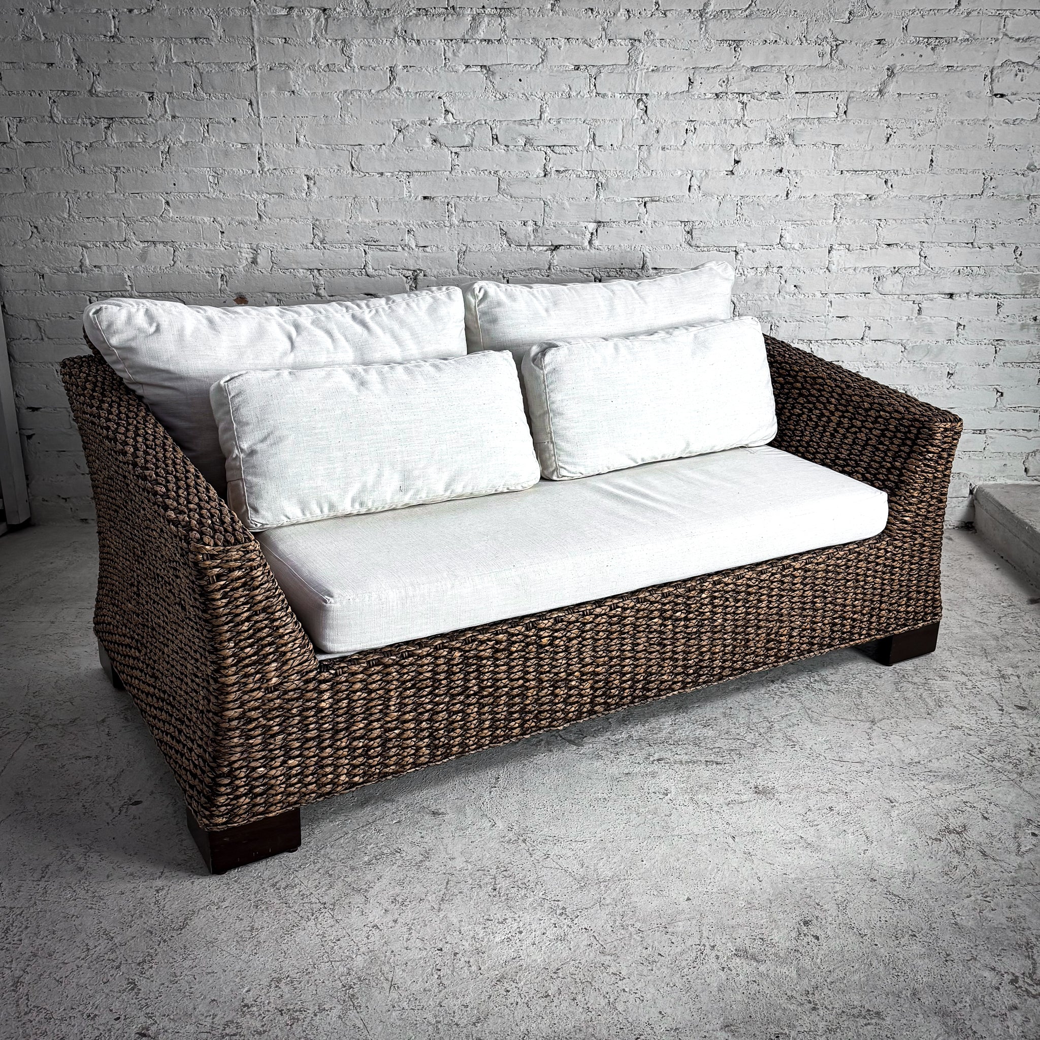 Loveseat. Handwoven rattan sofa in braided wicker with warm brown undertones. Features plush white linen cushions nestled within a curved frame.