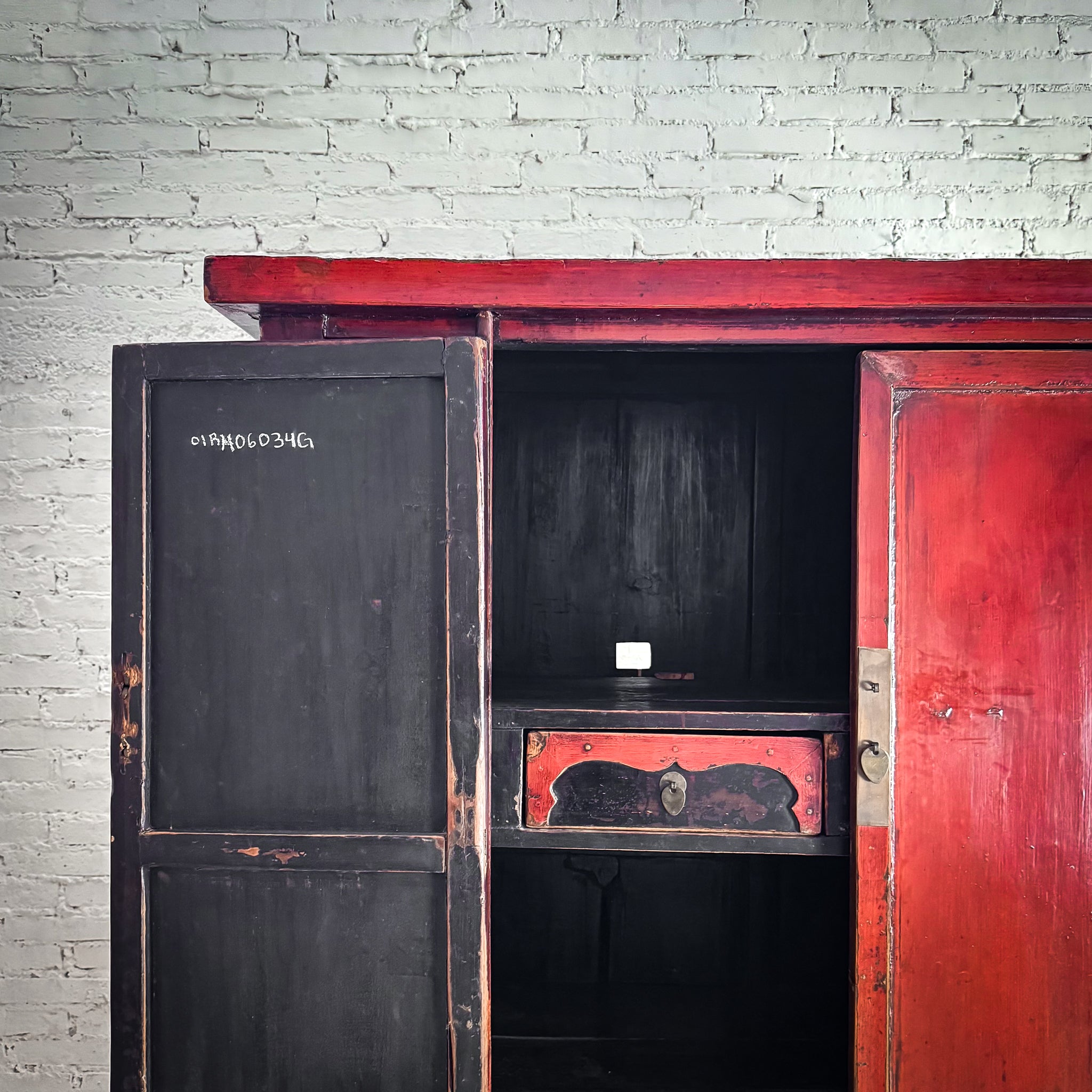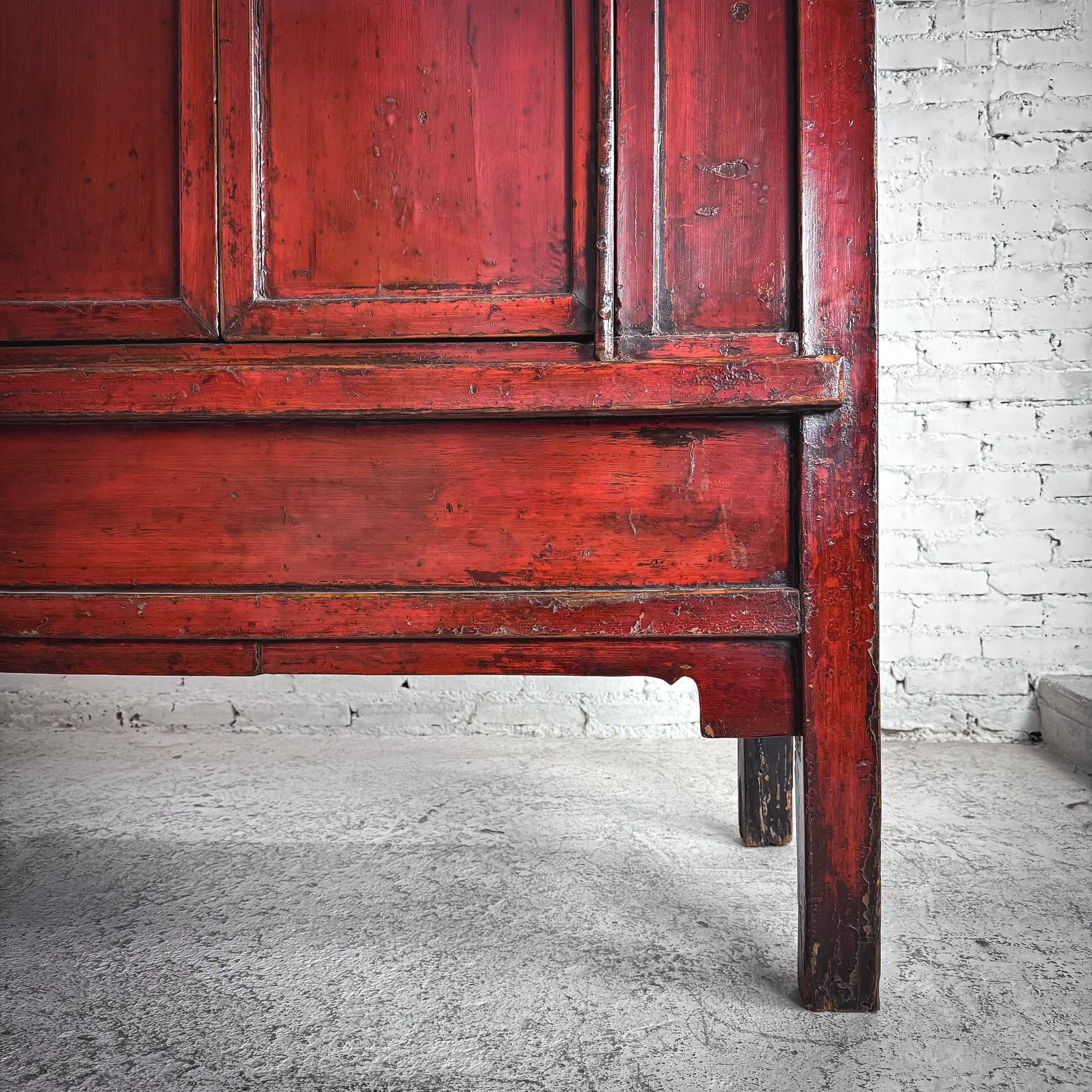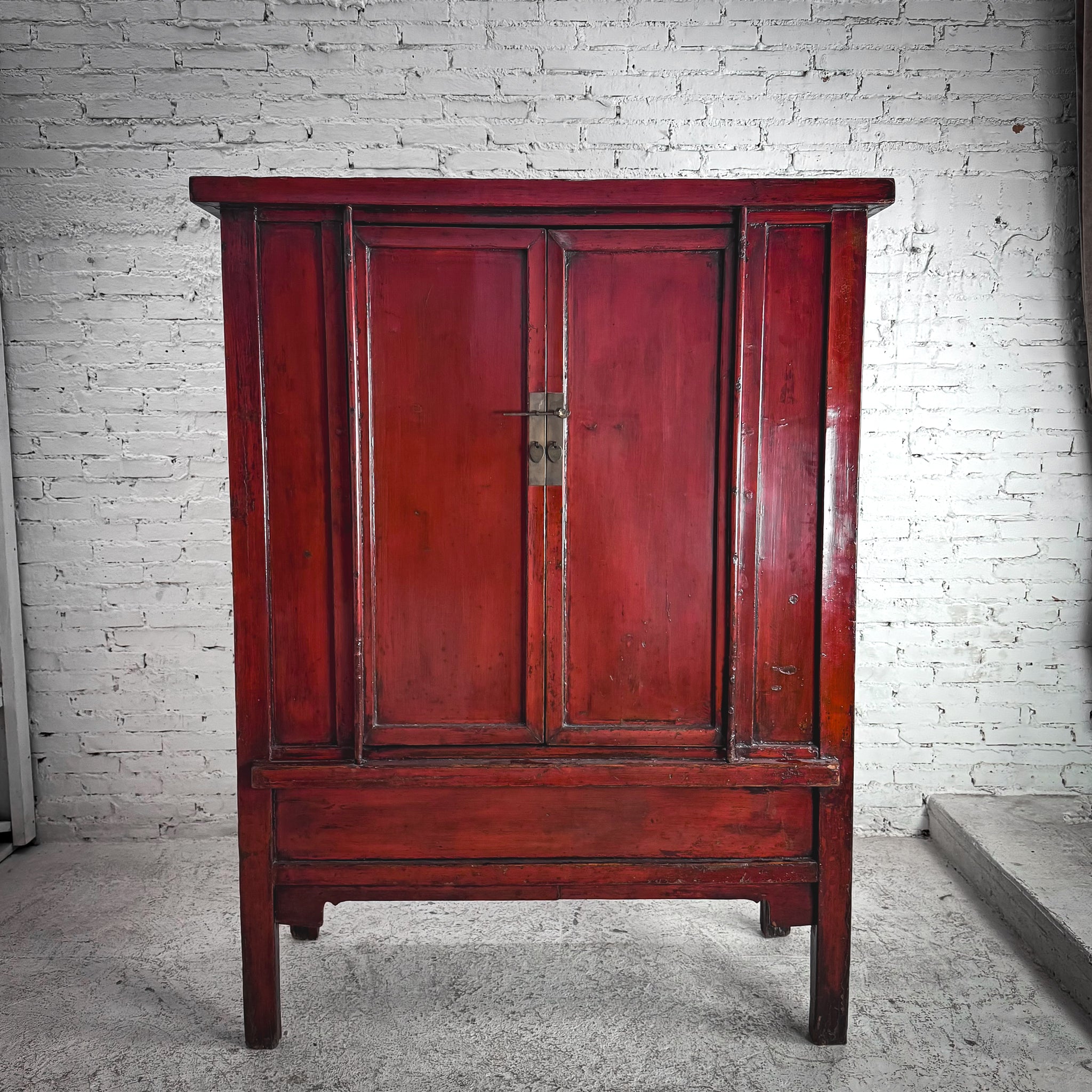 Cabinet. Antique Chinese red lacquer elm altar cabinet in Ming style with four legs, double doors over interior shelf. Two small drawers, worn patina.