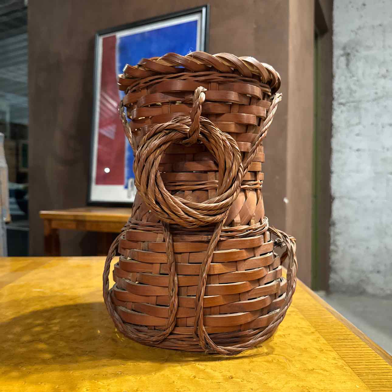 Basket. Vintage Japanese Iekbana bamboo basket. Hand woven, urn body with 2 large attached twisted bamboo handles. Single twist roped detail wrapped around flat bamboo interwoven body. Chevron woven rimmed top with interior metal container.