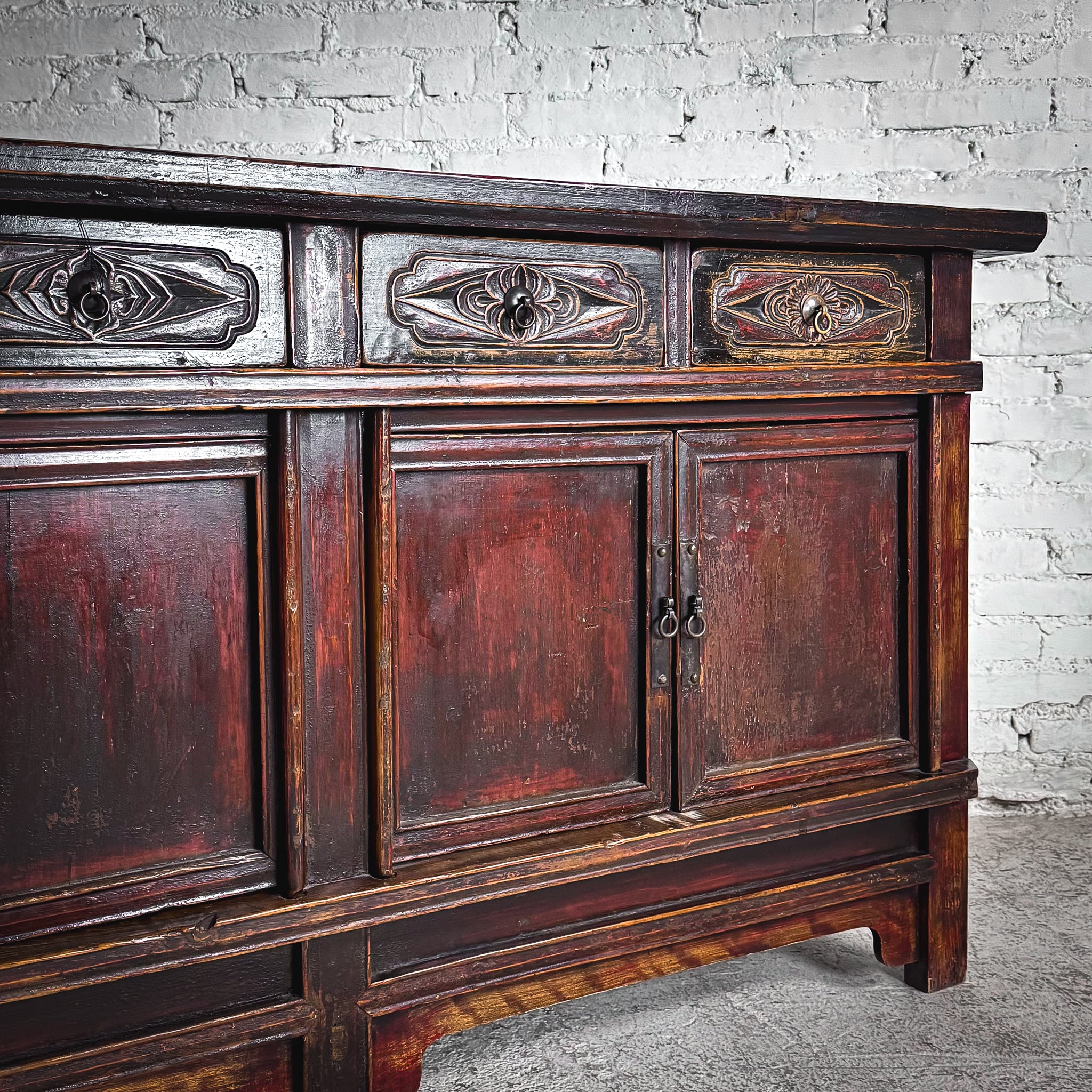 Sideboard. Antique Shanxi console sideboard. Solid elm with overhanging plank top, three carved floral drawers, and double-door base. Rich aged brown patina, Qing provincial craftsmanship.