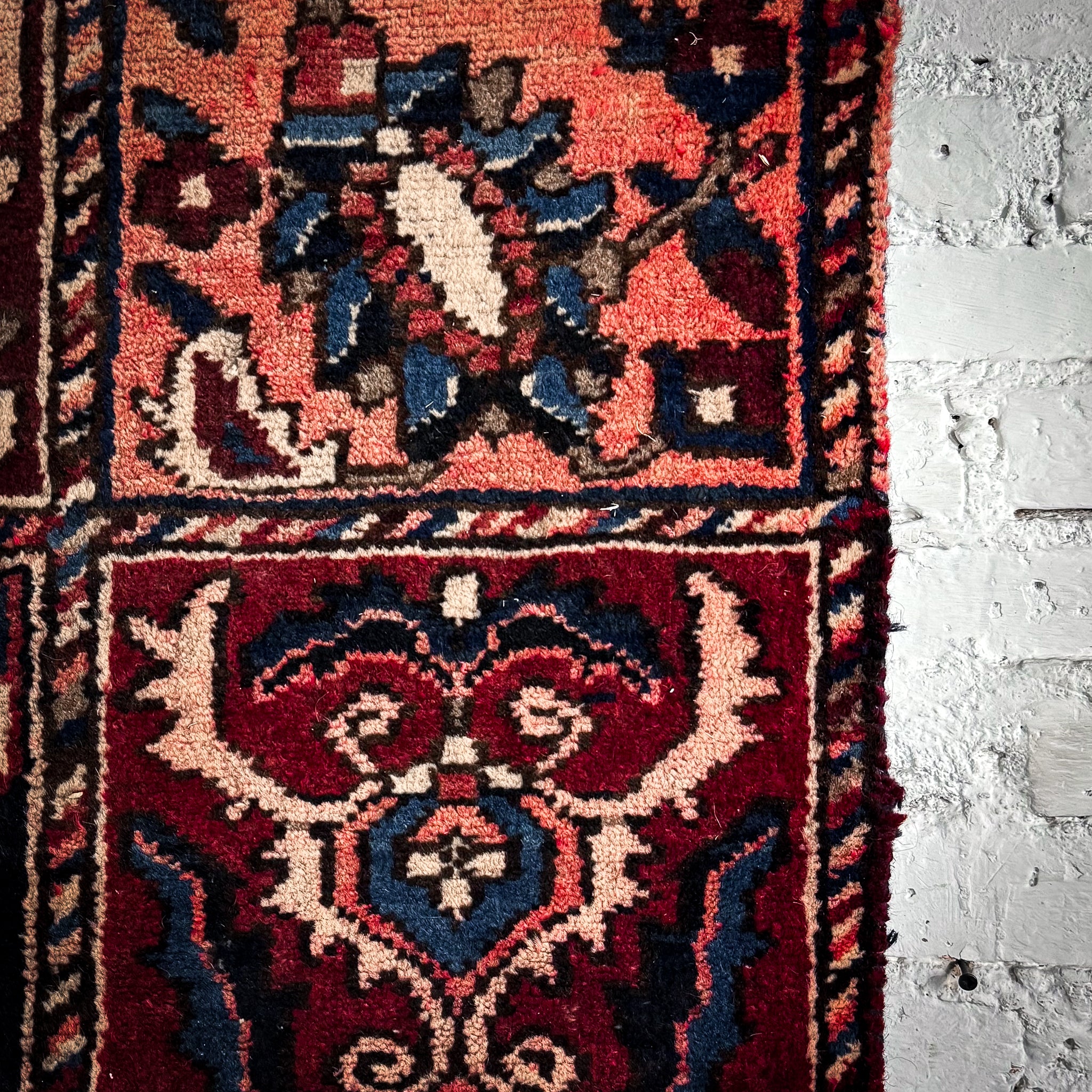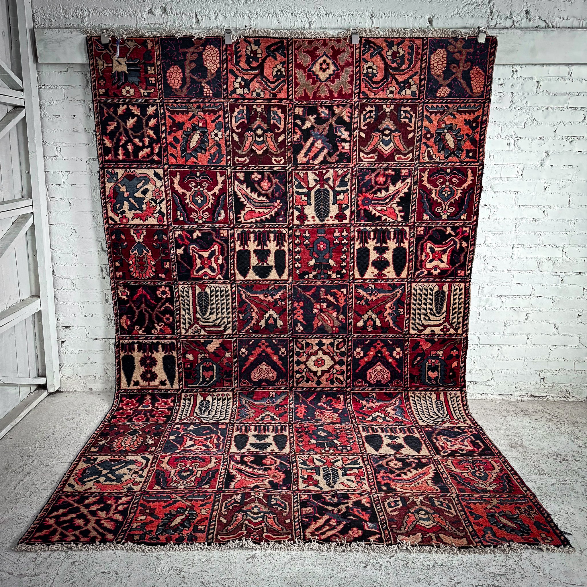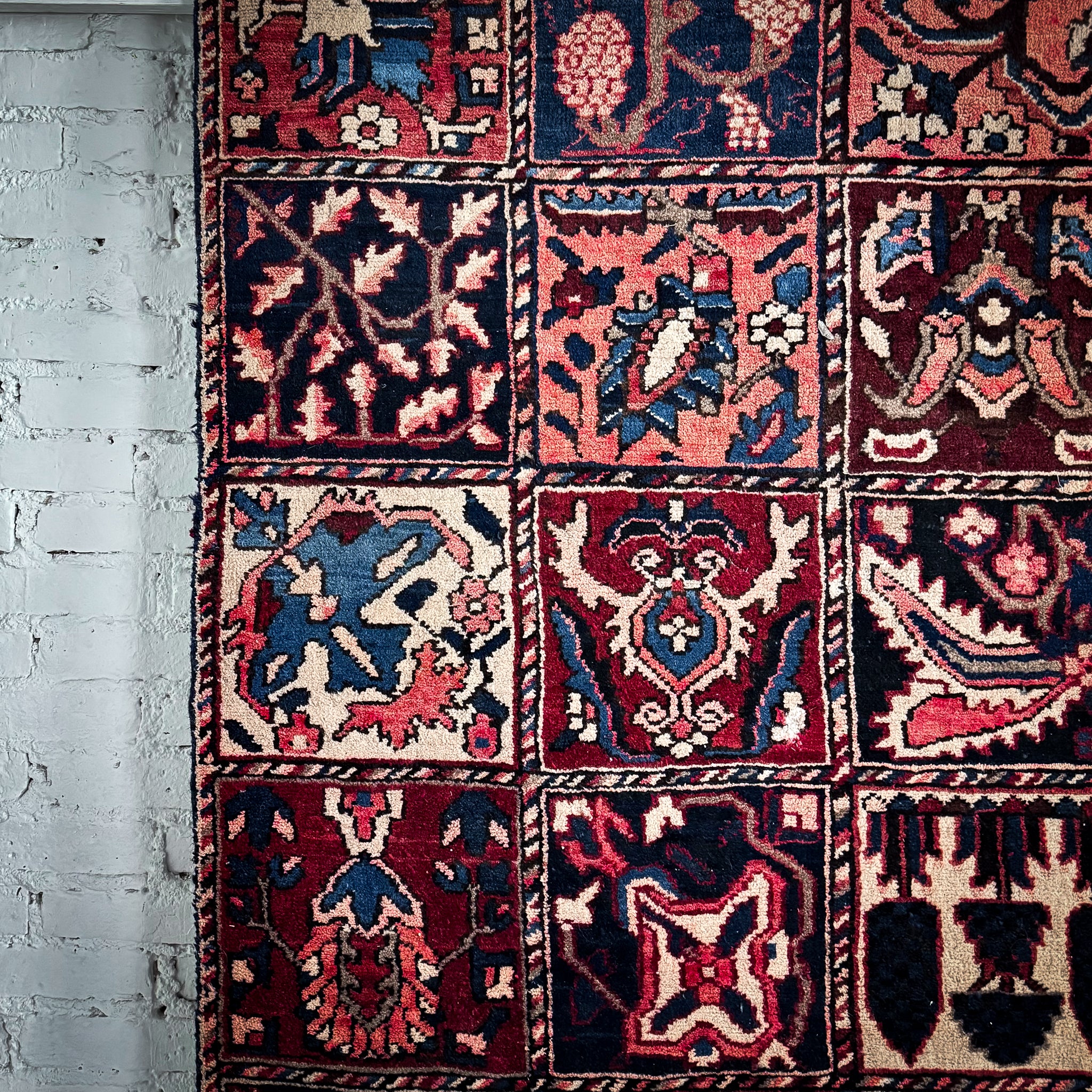 Rug. Persian Bakhtiari “garden” windowpane panel design wool knotted rug with weeping willows, twinned feathery fronds and blossoming stems in deep reds, blues, and beige colors.
