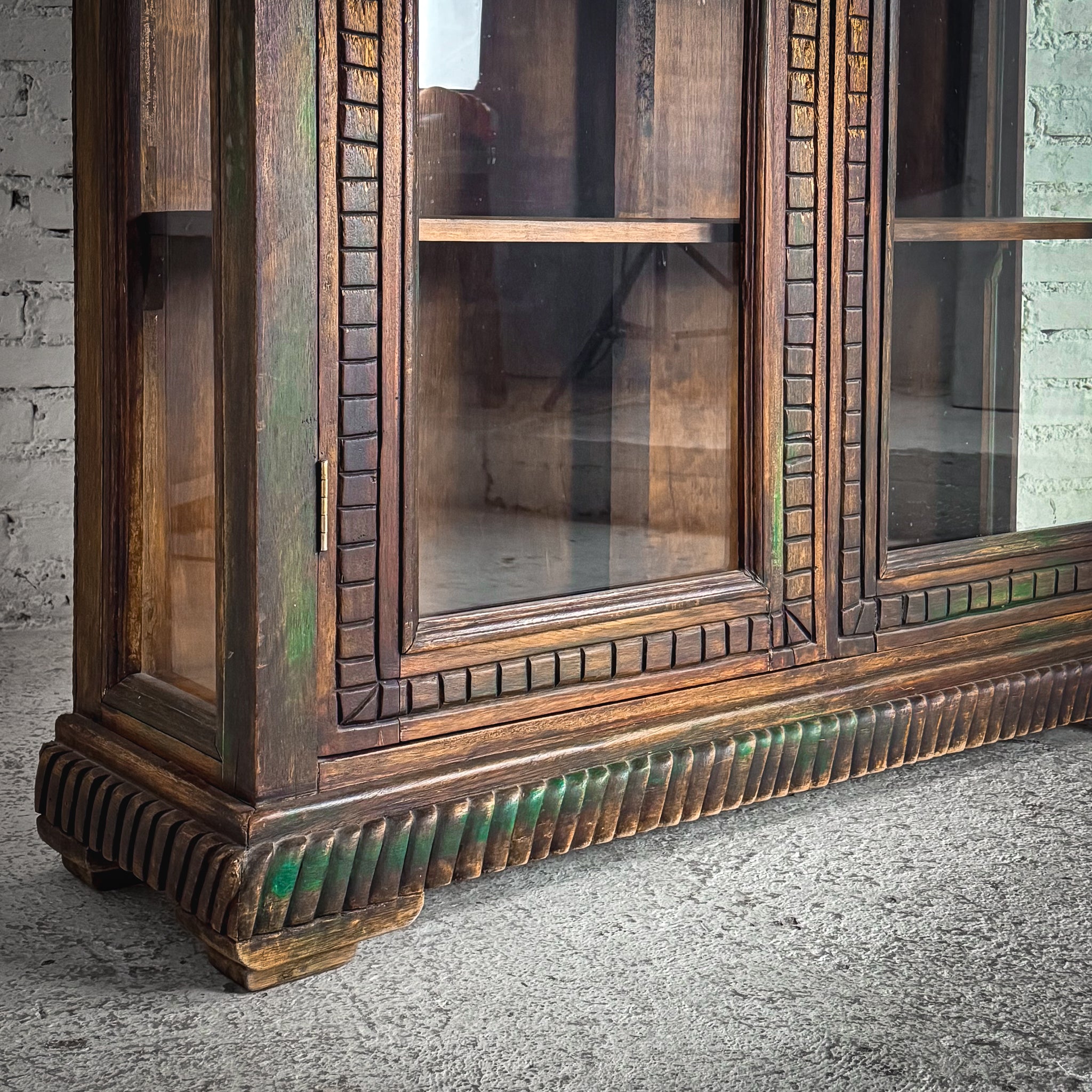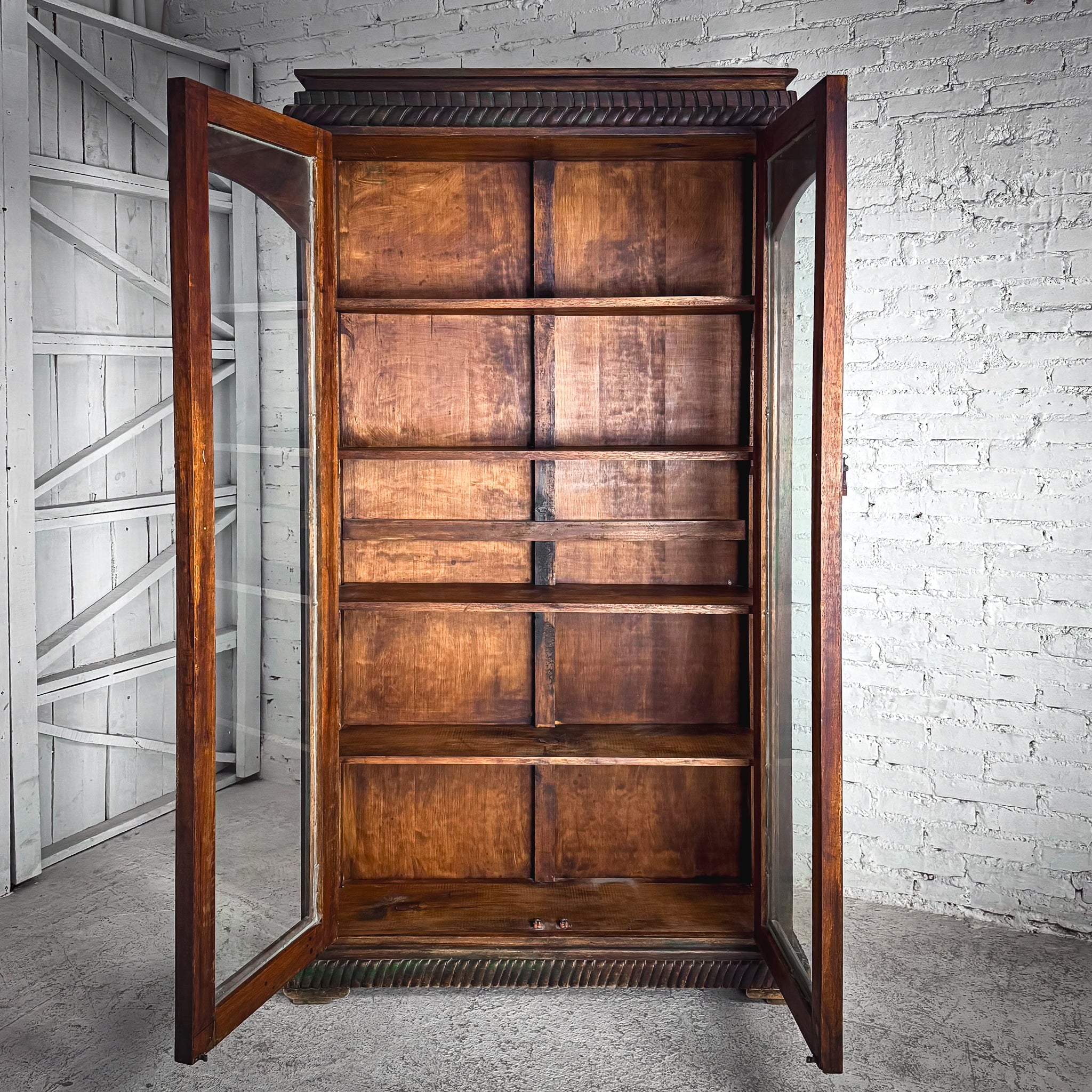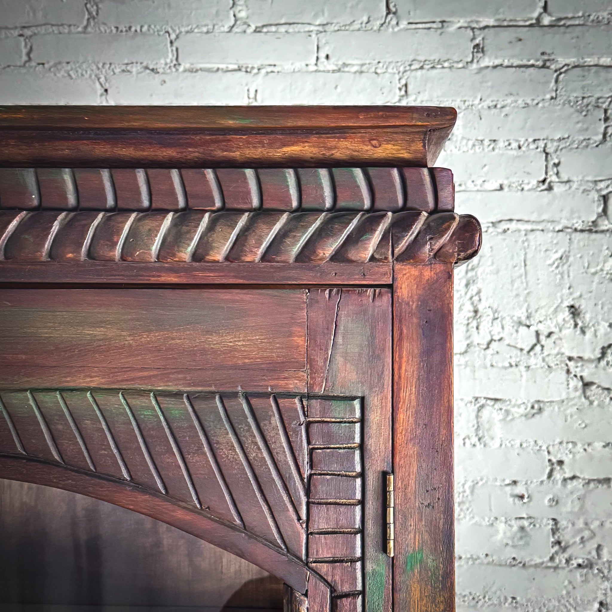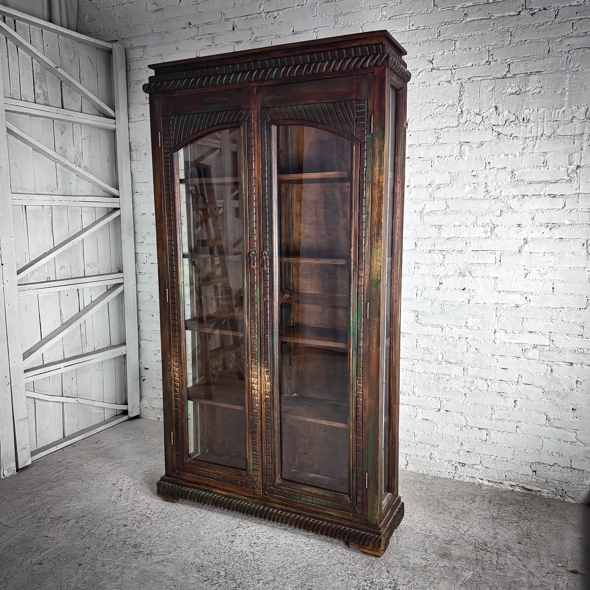 Cabinet. Vintage Mexican Colonial-style cabinet. Hand-carved hardwood with twisted rope molding, arched glass doors, and a distressed dark finish with verdigris-like accents.