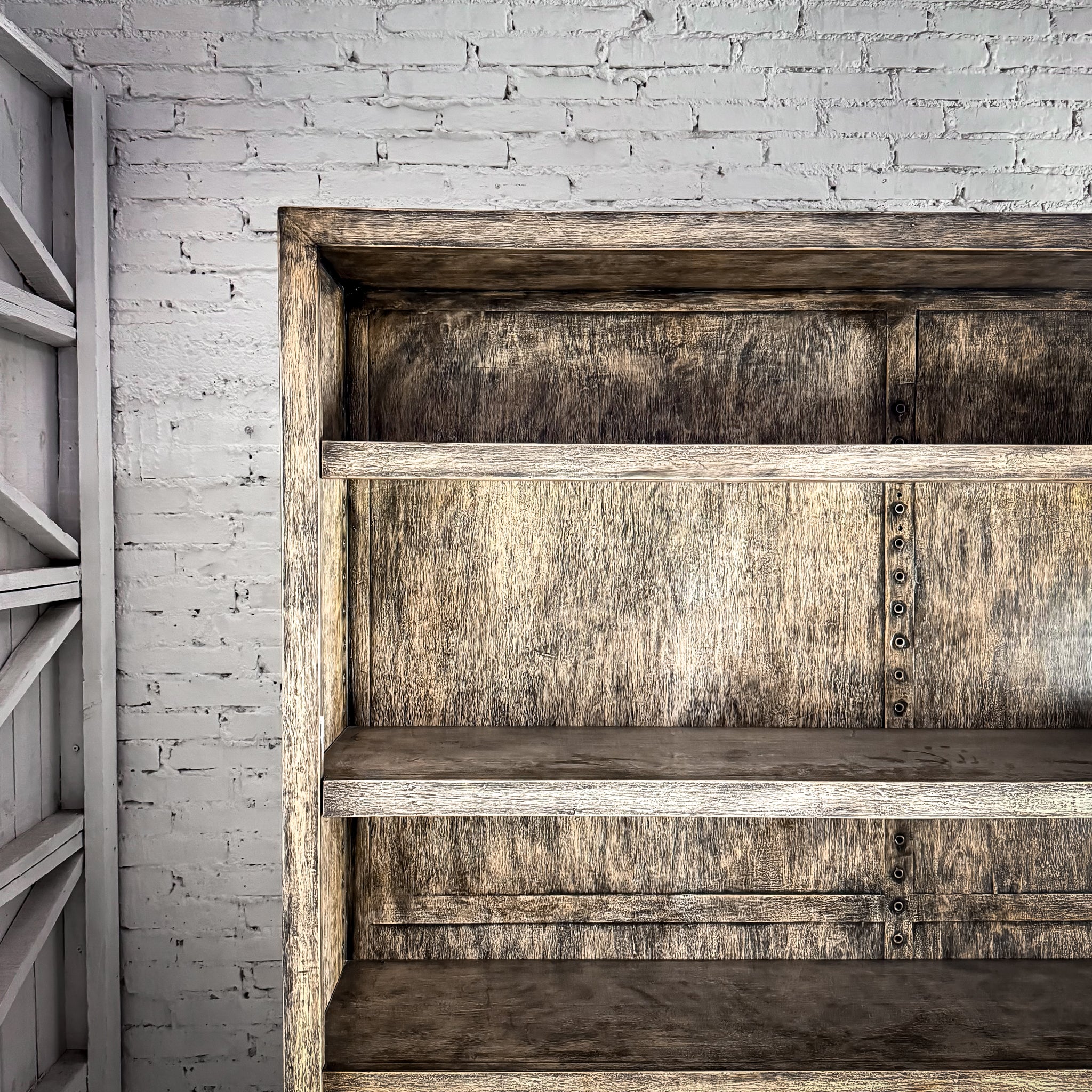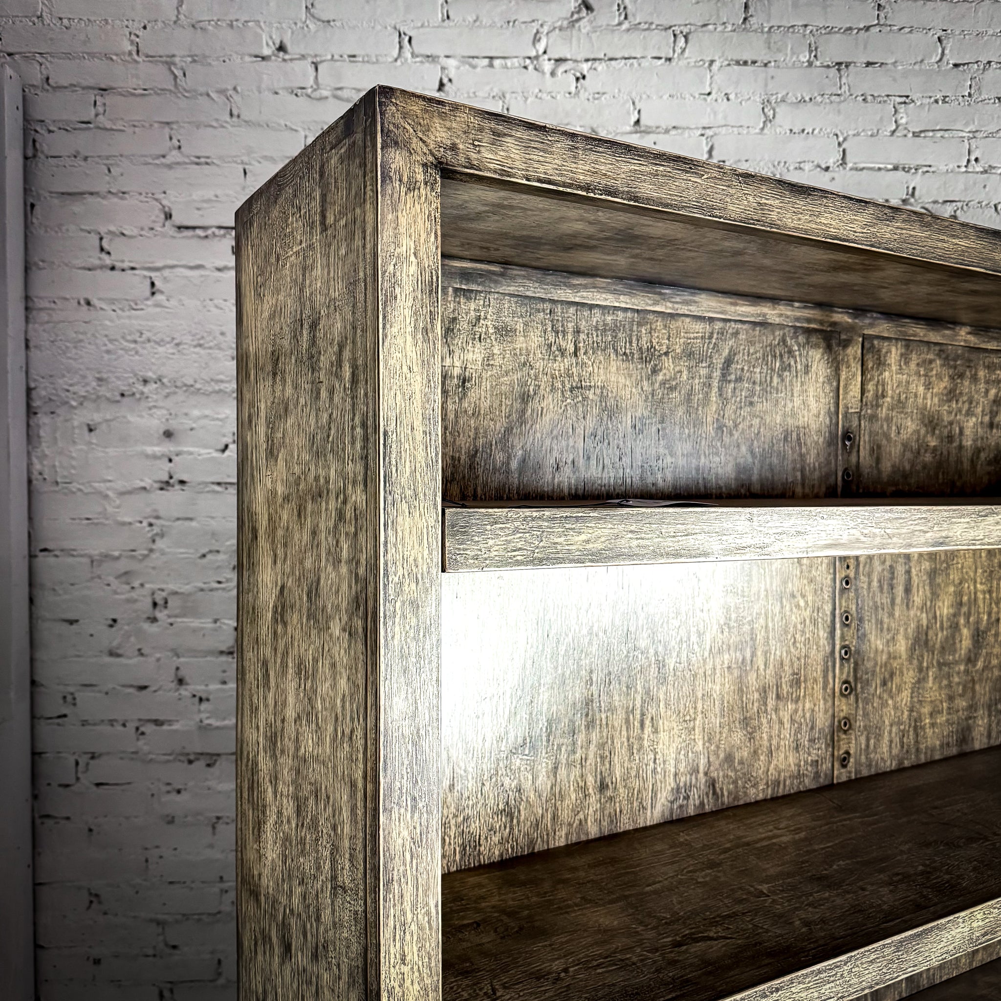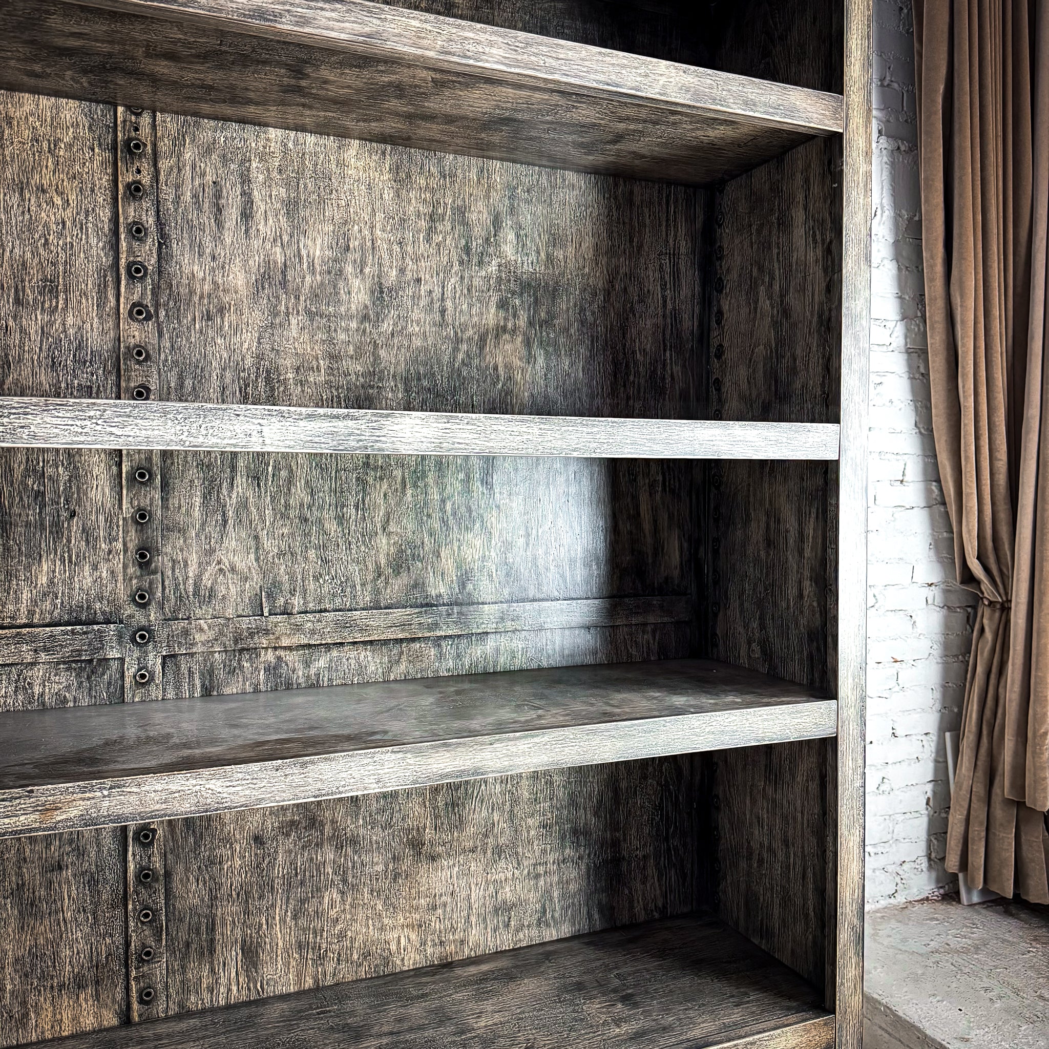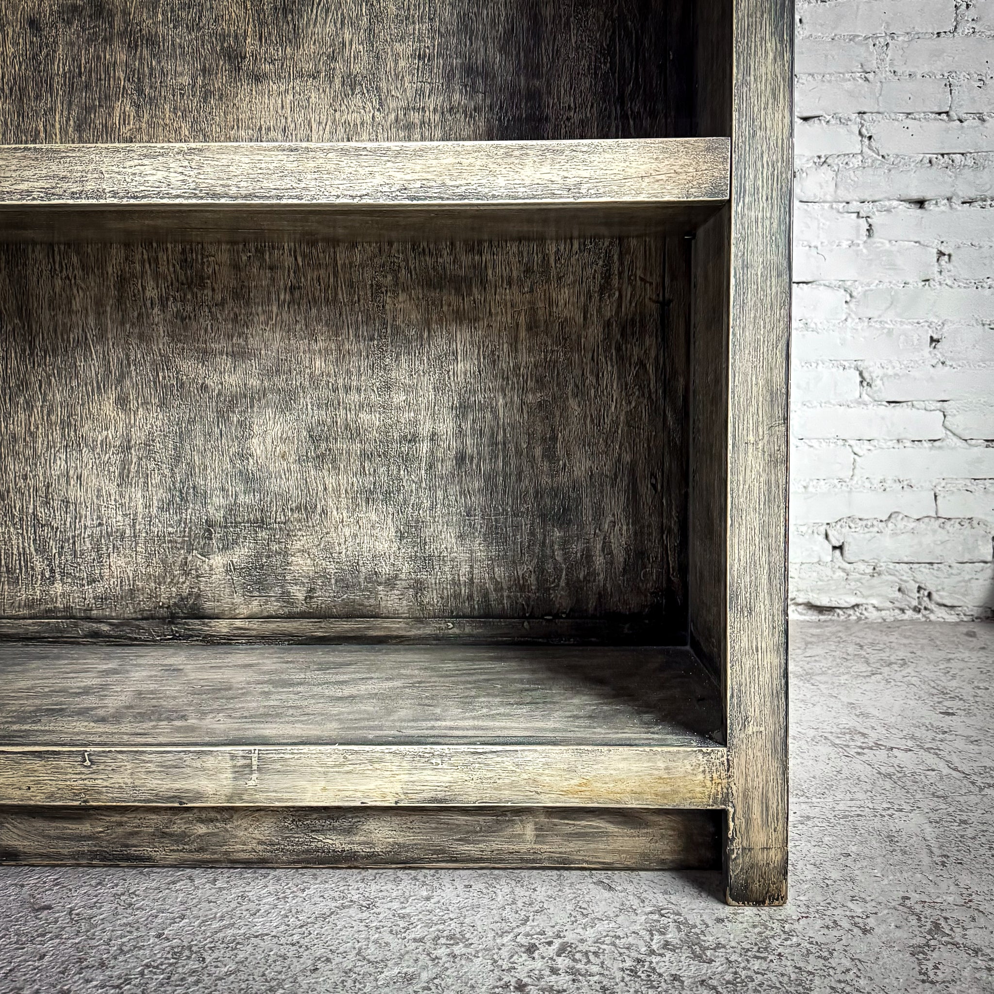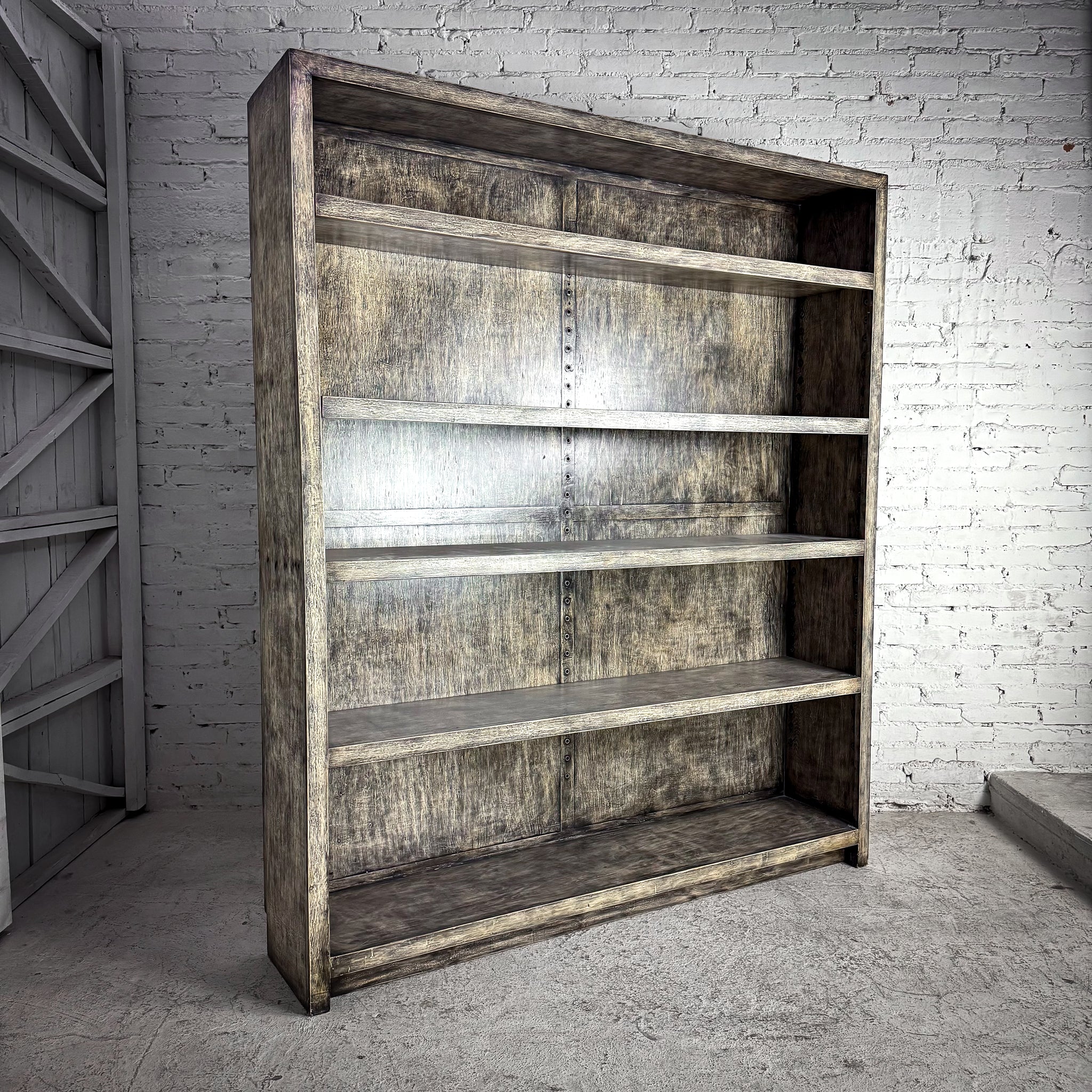 Bookcase. Large farmhouse-style open bookcase. Weathered gray veneer-wood finish, 4 adjustable shelves, and clean modern lines.
