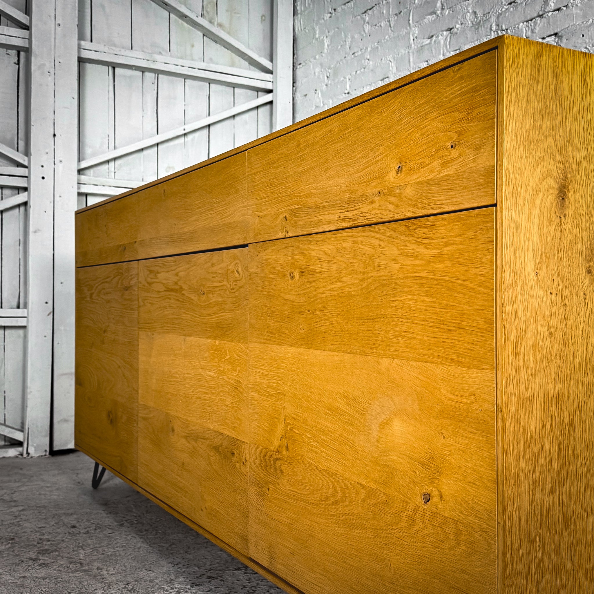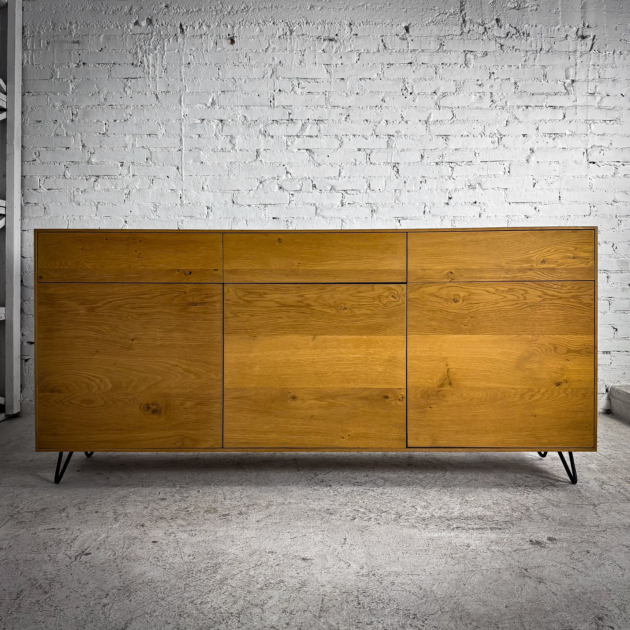 Sideboard. Scandinavian-inspired "Nordic" sideboard. White Oak veneer with push-to-open mechanism, four drawers, two cabinet doors, and black metal hairpin-style legs. Made in Spain