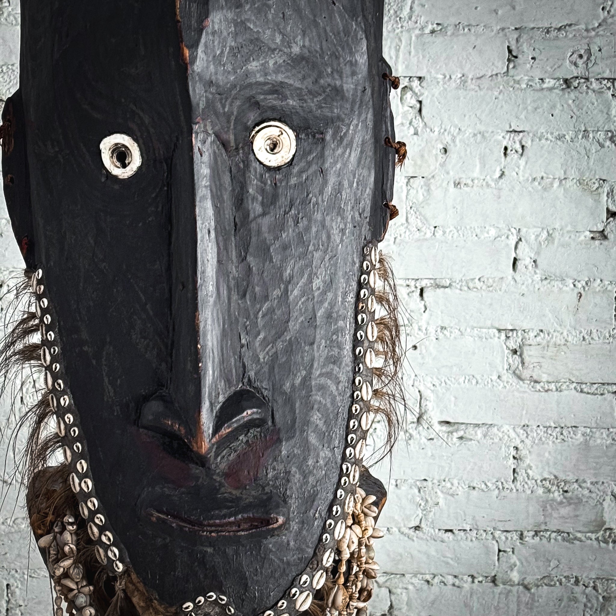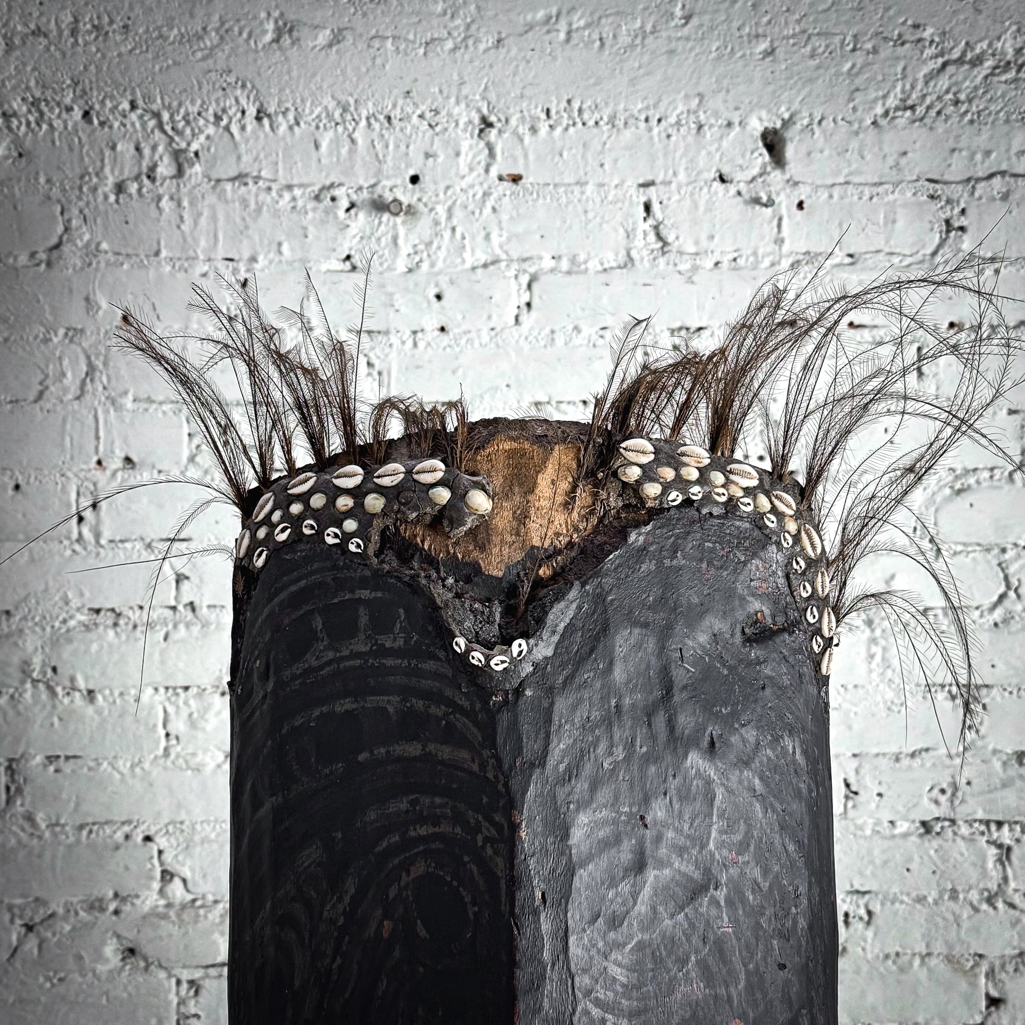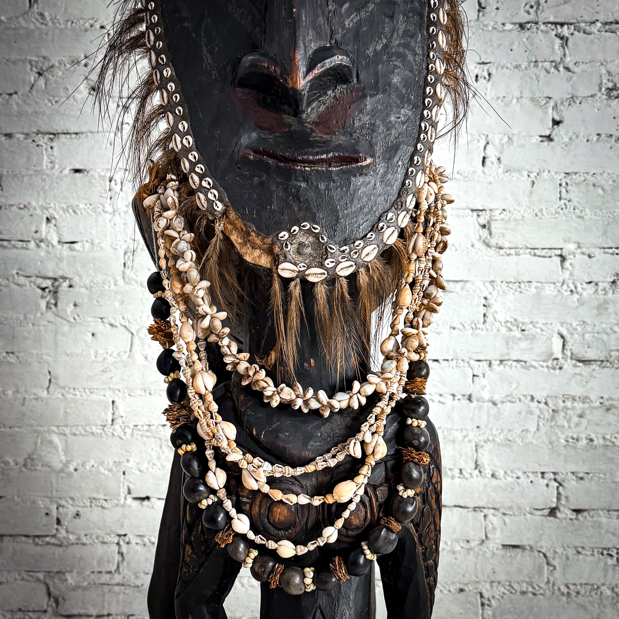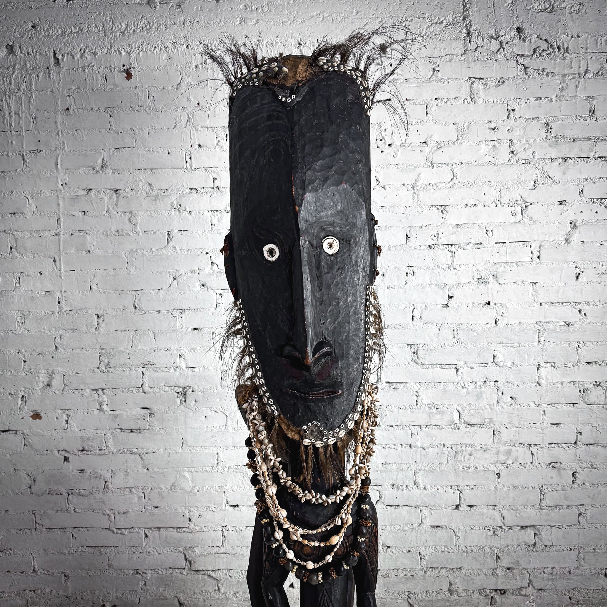 Wood Carving. Tall Papua New Guinea ancestor figure; carved hardwood with shell and feather adornment, dark patina, Sepik River style, ritual spirit sculpture.