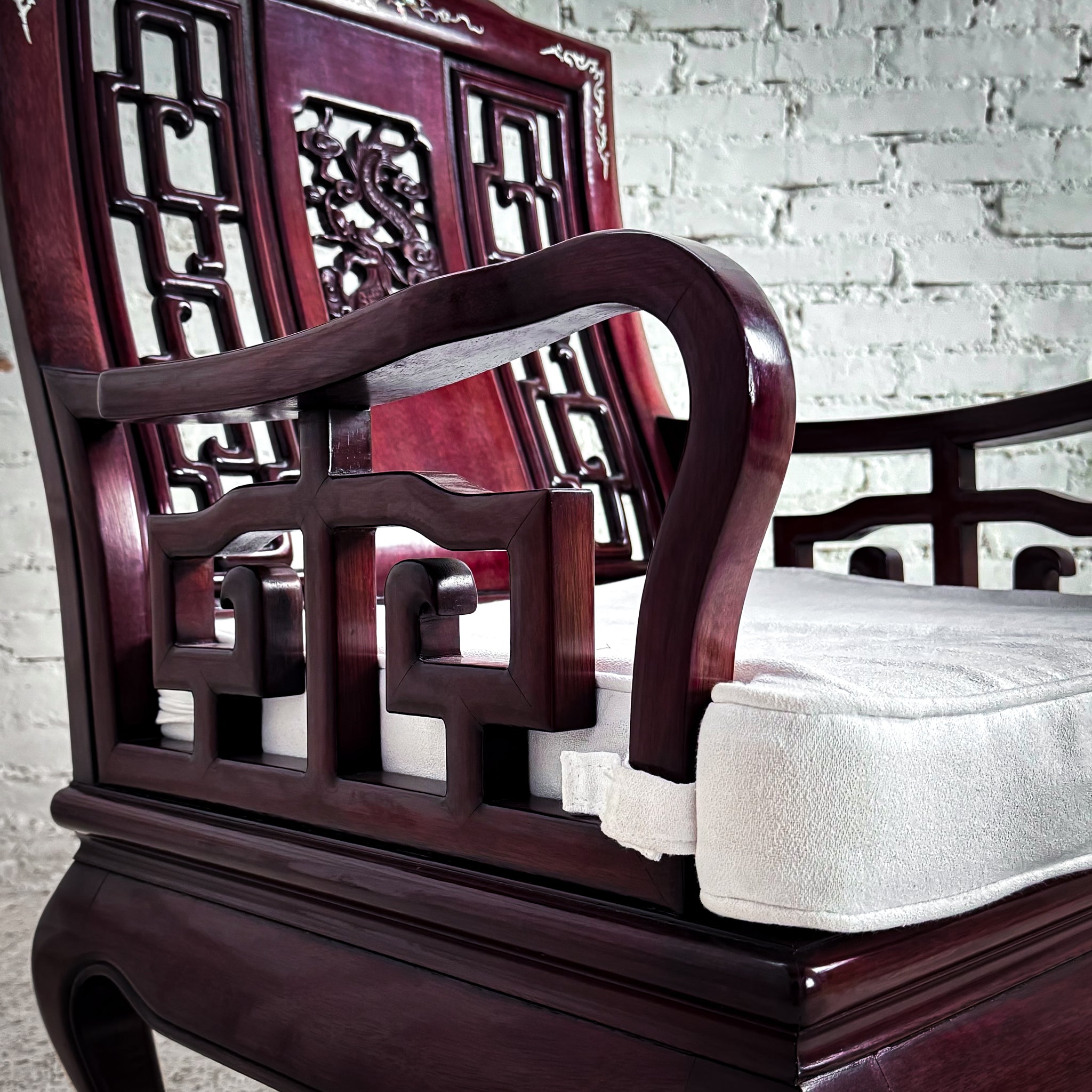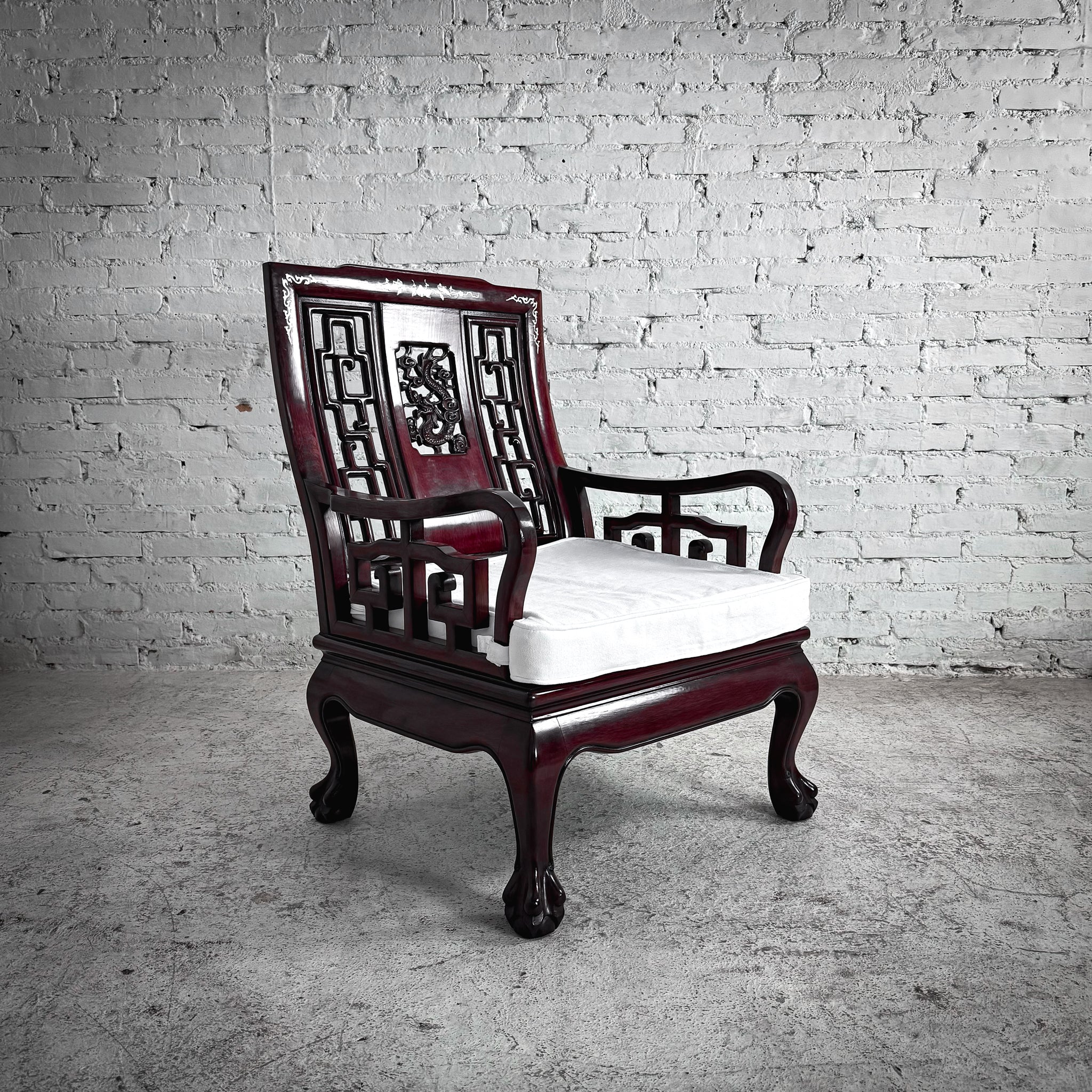 Armchair. Carved Qing style rosewood armchair with dragon motif and mother-of-pearl inlay, Ming-style lattice back, cabriole legs, and fitted seat cushion.