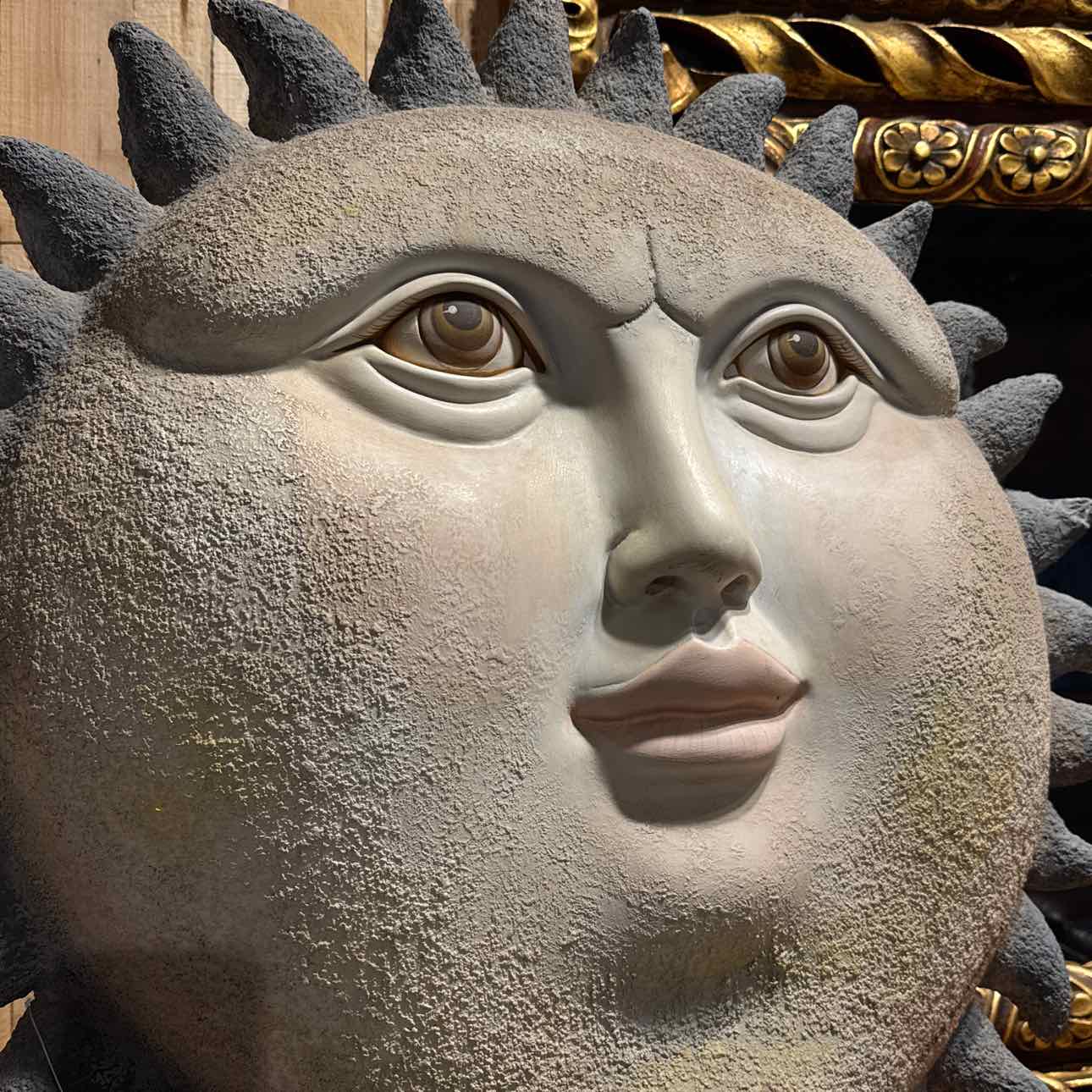 Statue. Sergio Bustamante "Large Sun" abstract statue in pastel colors, brown eyes & gray sun rays. Signed by the artist. AP (Artist Proof). Has been repaired on the right side arm. Verified as original by Gallery.